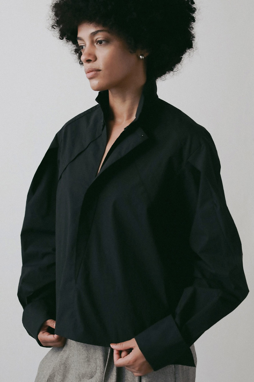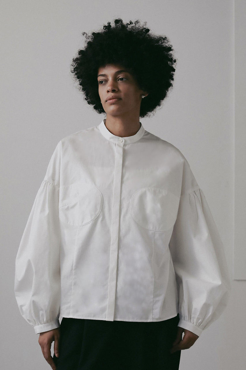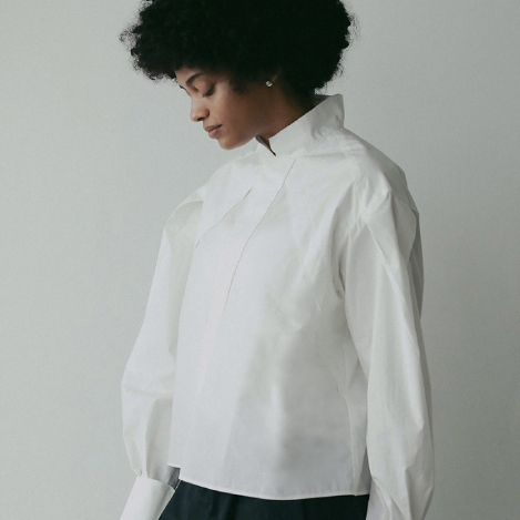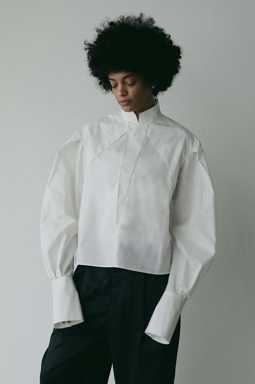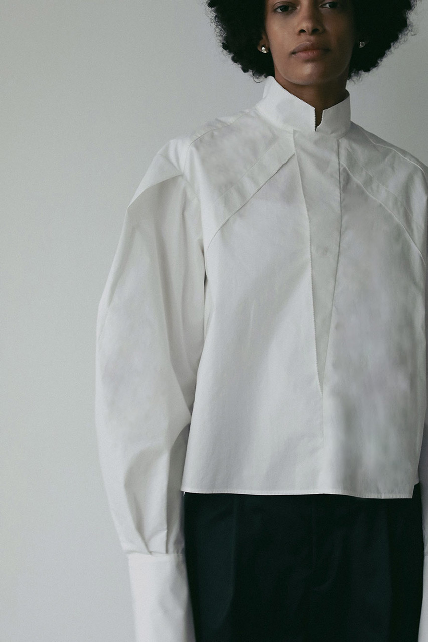 ハリのある高密度コットンで仕立てた、立体感のあるブラウス。胸元の切り替えが印象的で、シンプルながらもモードな雰囲気を演出します。素材とシルエットにこだわり、すっきりとしたフォルムに。きれいめなパンツやスカートと合わせた、クリーンな着こなしがおすすめです。