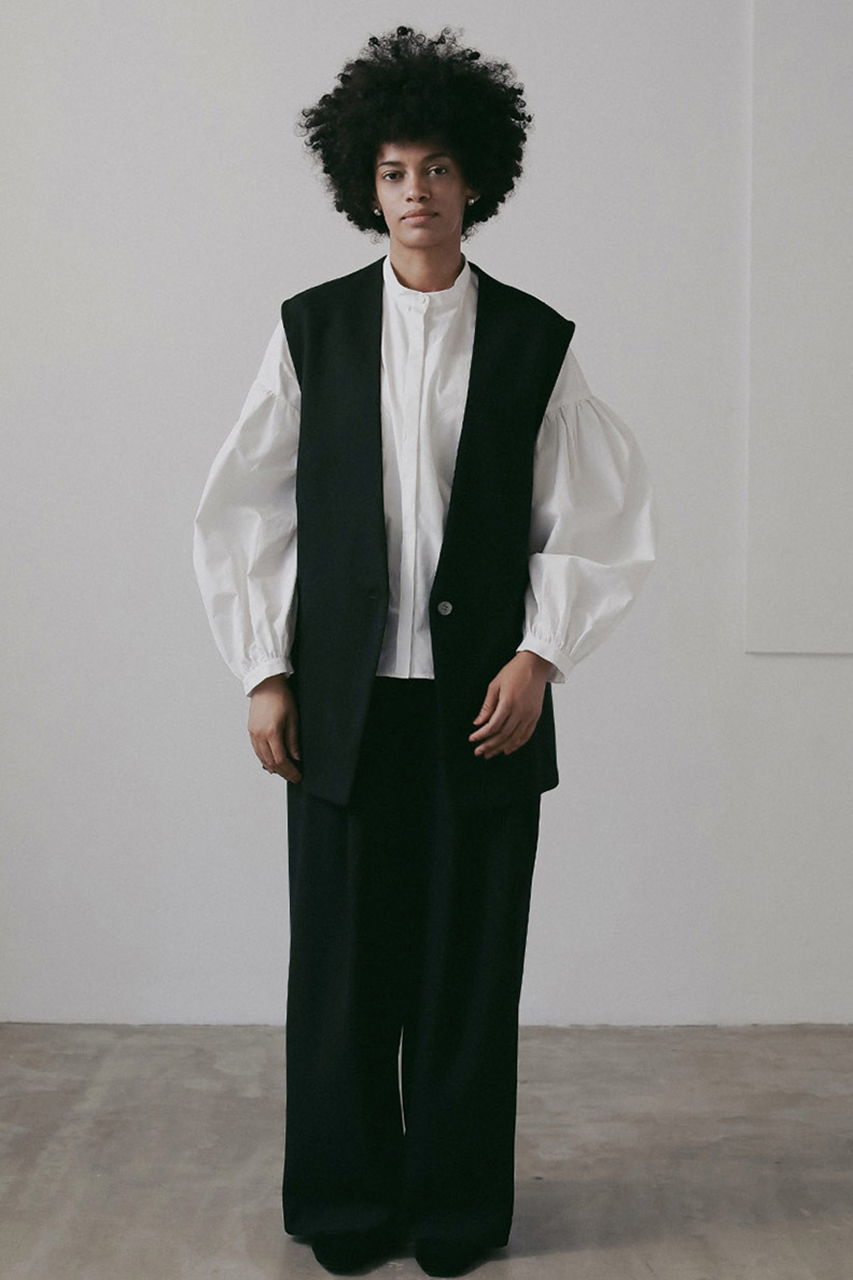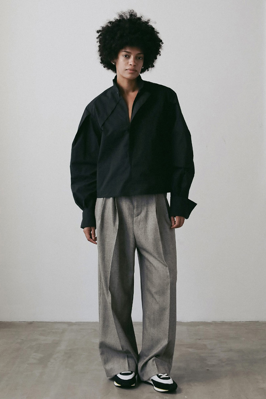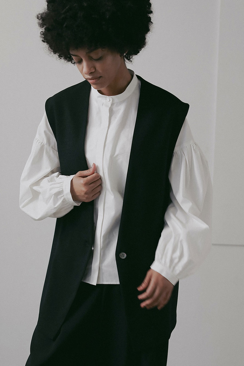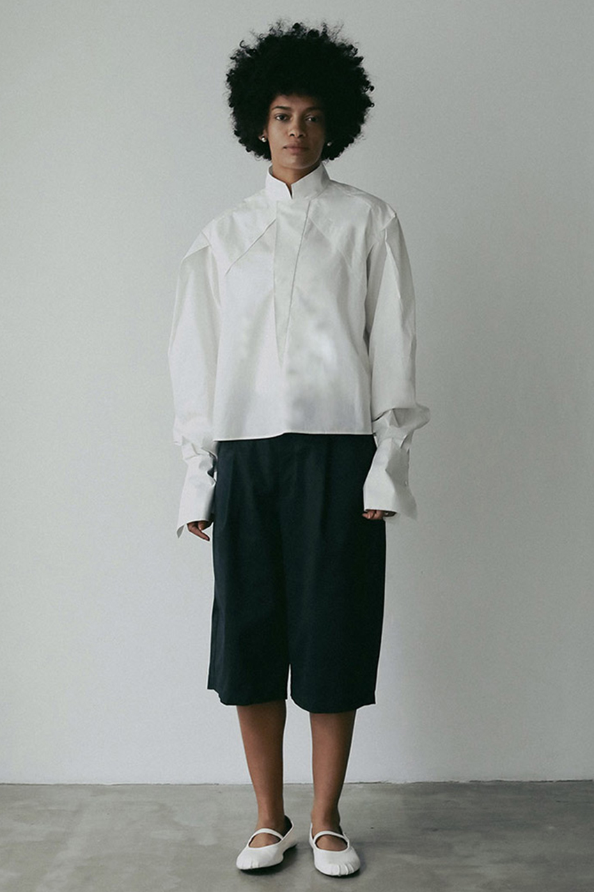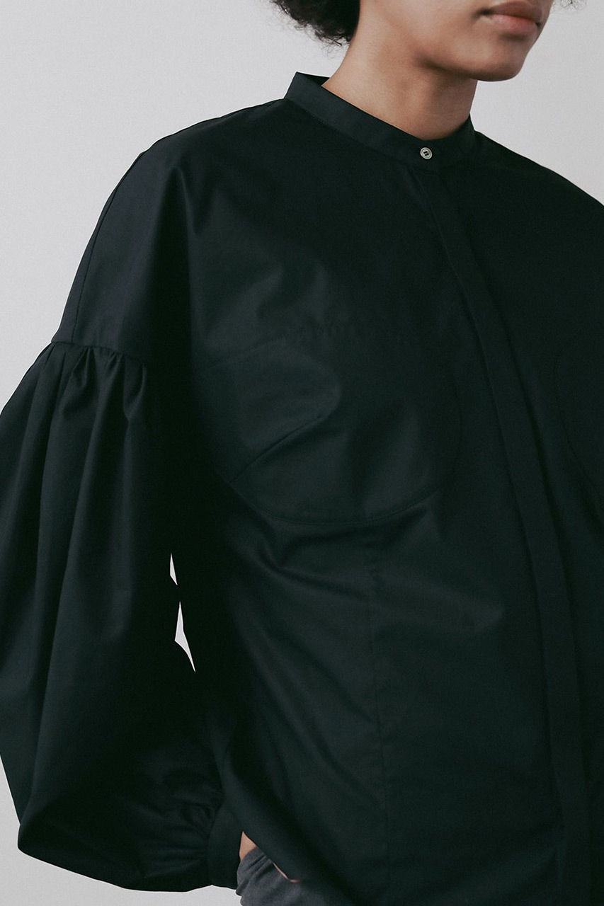 ハリのある高密度コットンで仕立てた、立体感のあるブラウス。胸元の切り替えが印象的で、シンプルながらもモードな雰囲気を演出します。素材とシルエットにこだわり、すっきりとしたフォルムに。きれいめなパンツやスカートと合わせた、クリーンな着こなしがおすすめです。