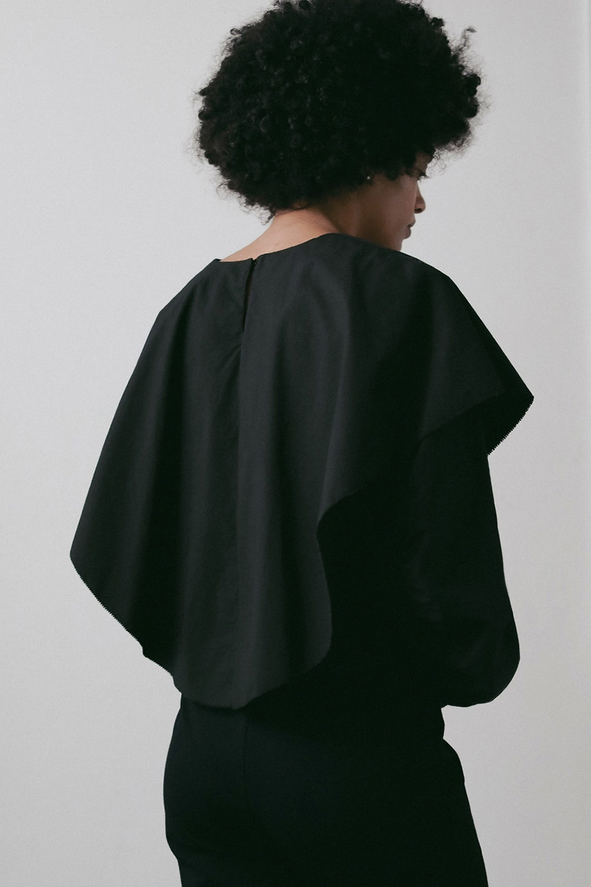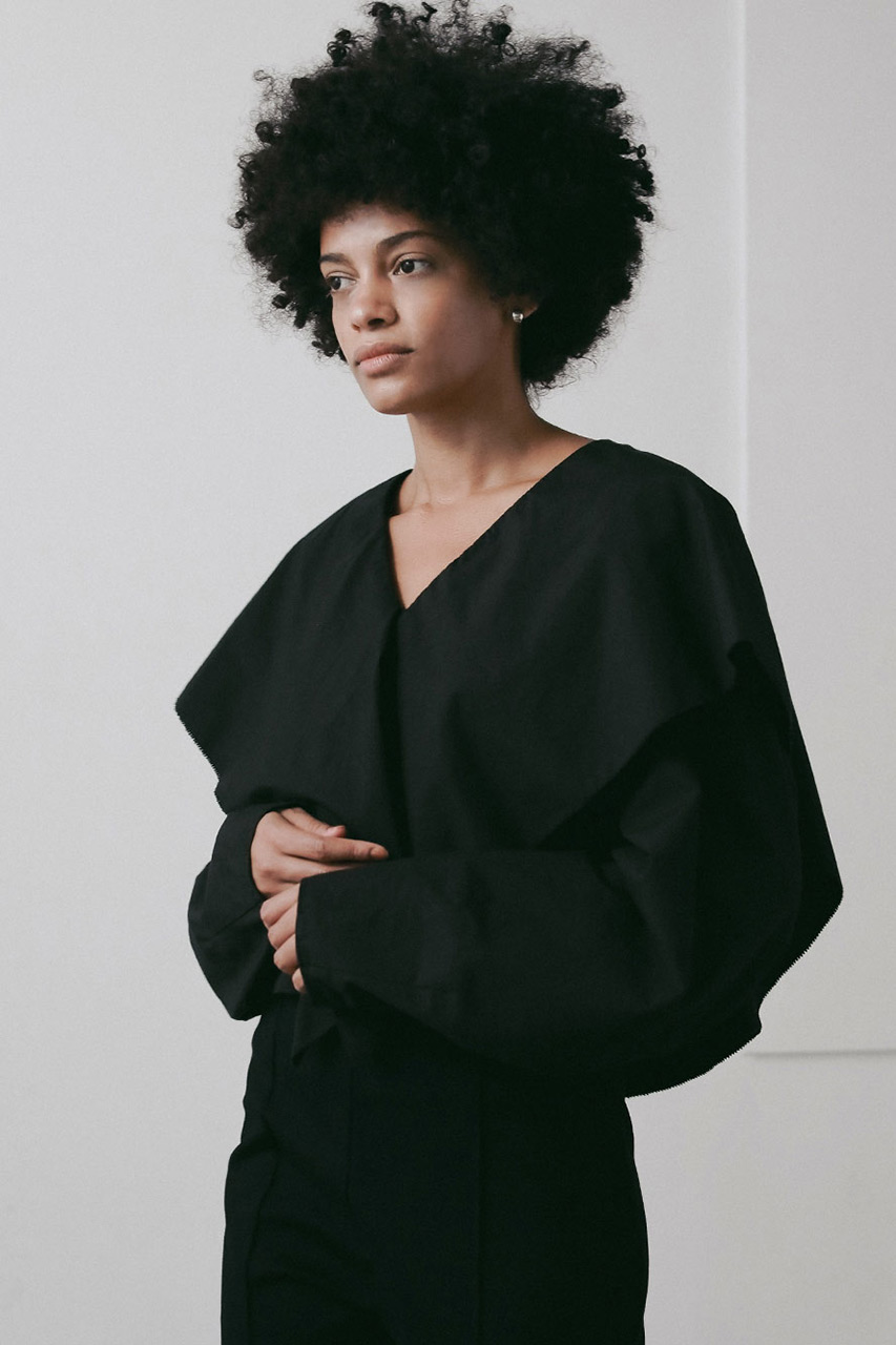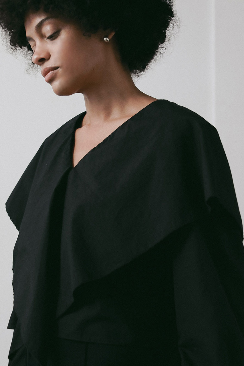 ケープのように広がる大きなフレア衿が印象的なブラウス。衿端のピコステッチがさりげないアクセントに。オーガニックコットンのブロード素材は、ふんわりとした膨らみとドライな肌ざわりが魅力です。すっきりとした丈感でボトムとも好相性。袖のカーブラインにもこだわった、軽やかで品のある一枚です。