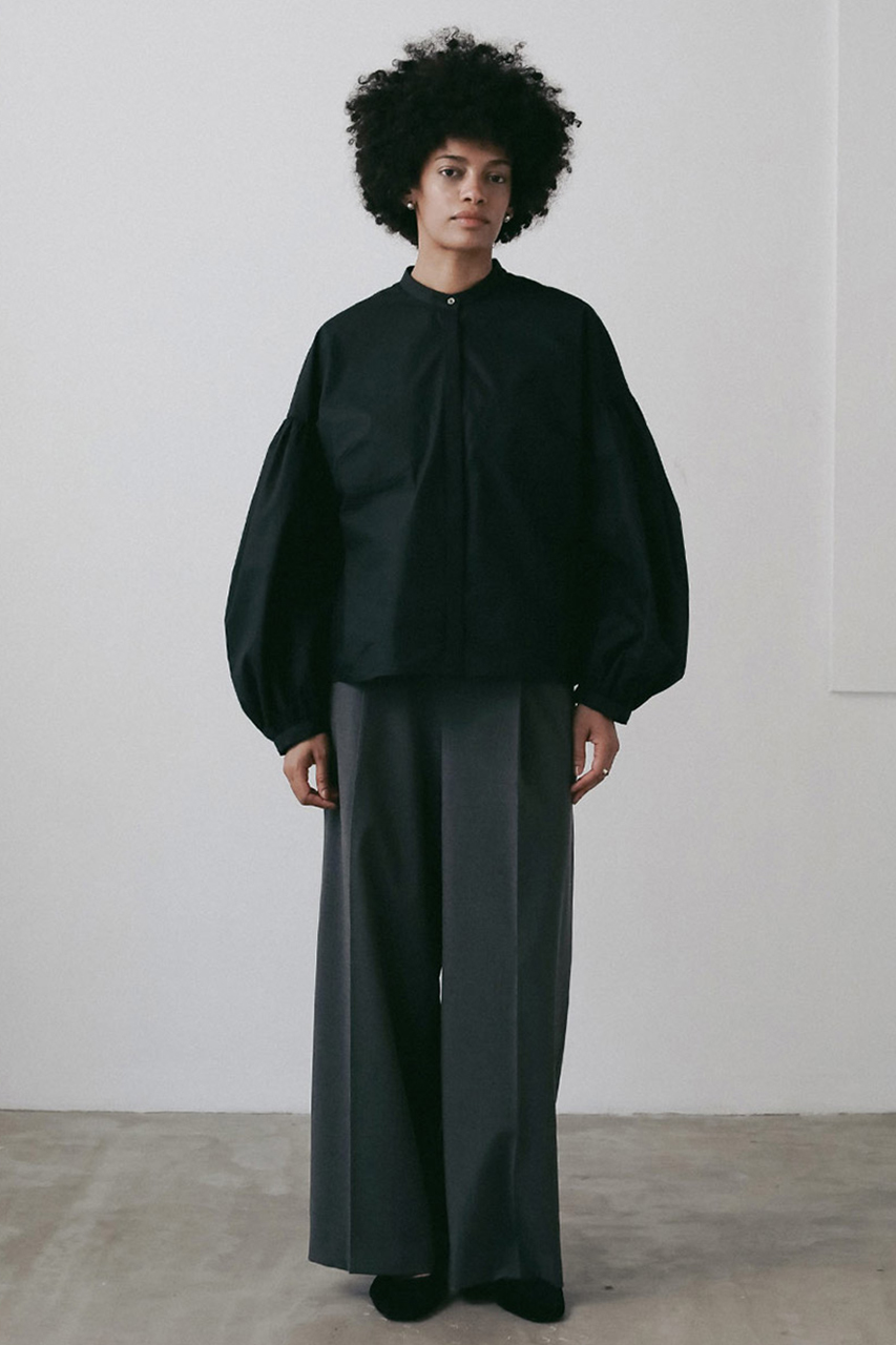 フロントの大きめなフラップポケットとダブルカフスが、ほどよくモードな印象を添えるシャツブラウス。シャープな表情をつくる立ち襟や、端に丁寧に施されたピコミシンなど、細やかなディテールが上質さを物語ります。ハリのある素材感と端正な仕立てが、美しいシルエットを引き立て、1枚で着映えするアイテムに仕上がっています。