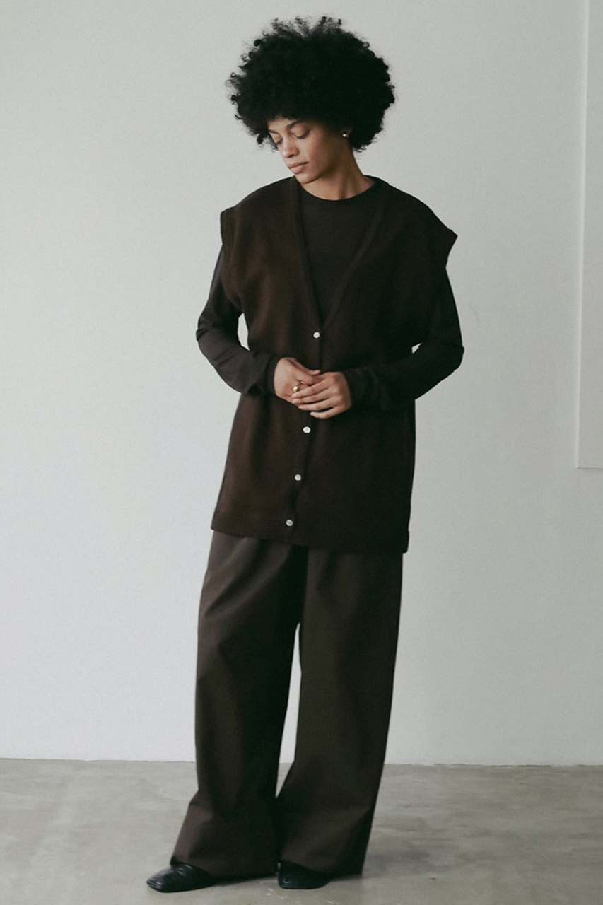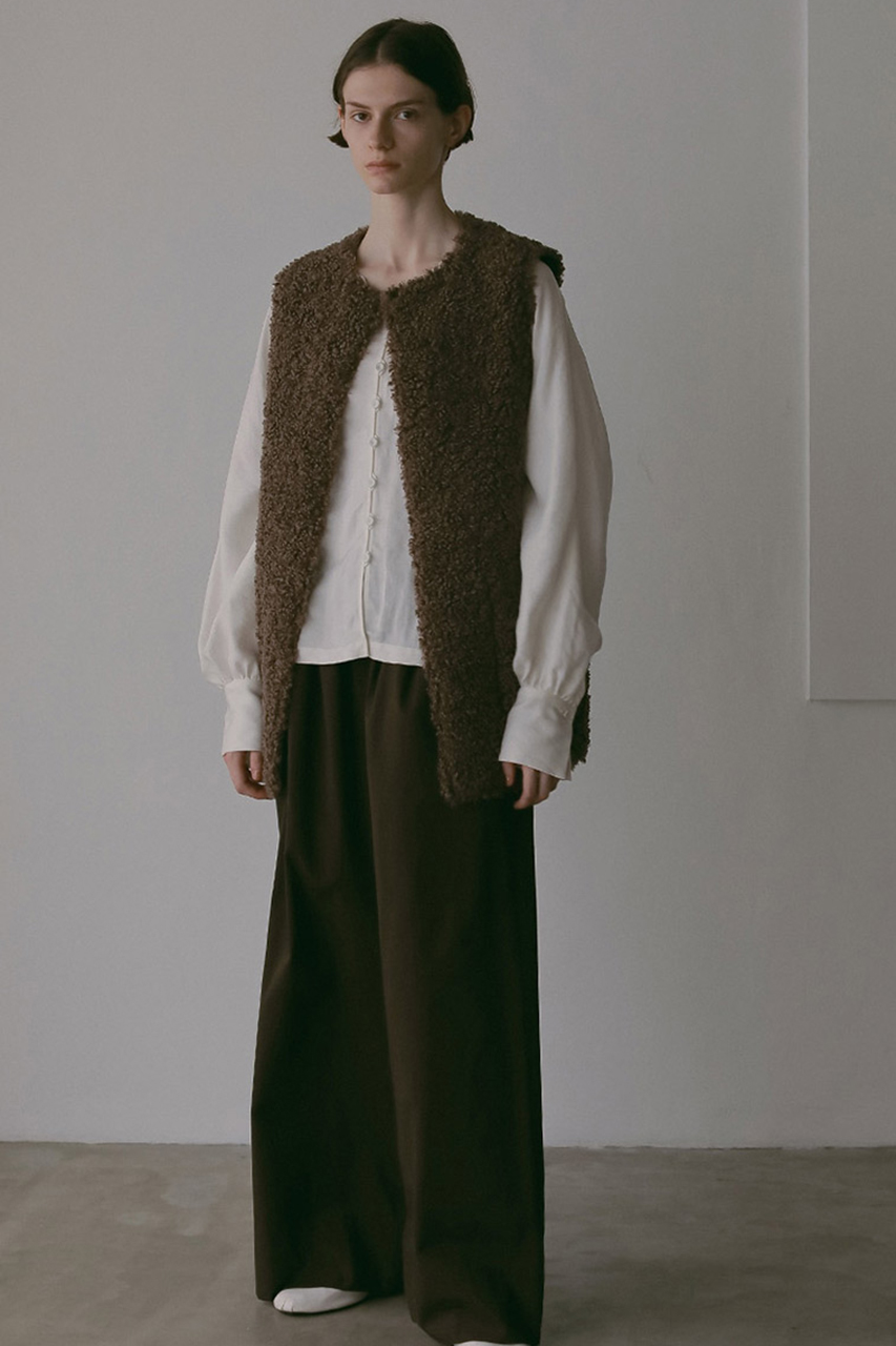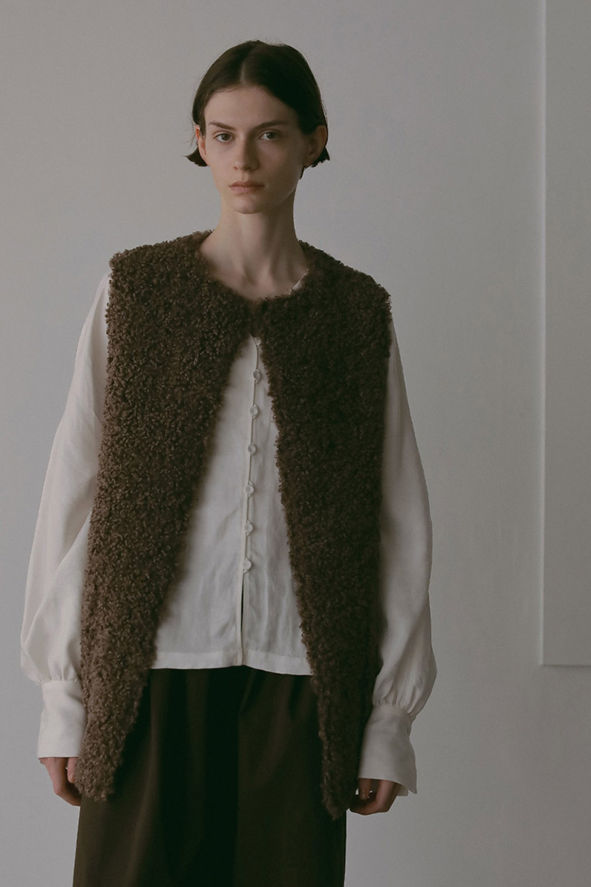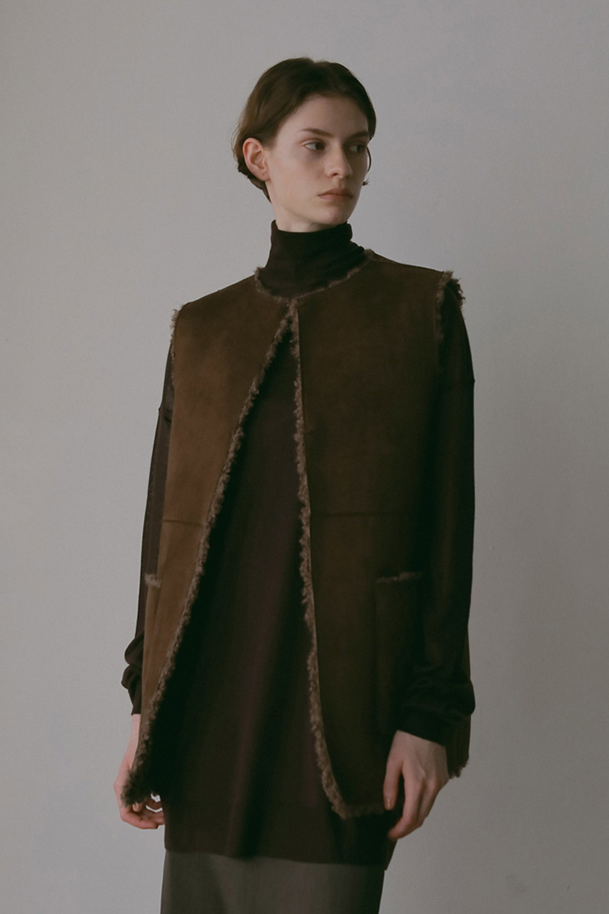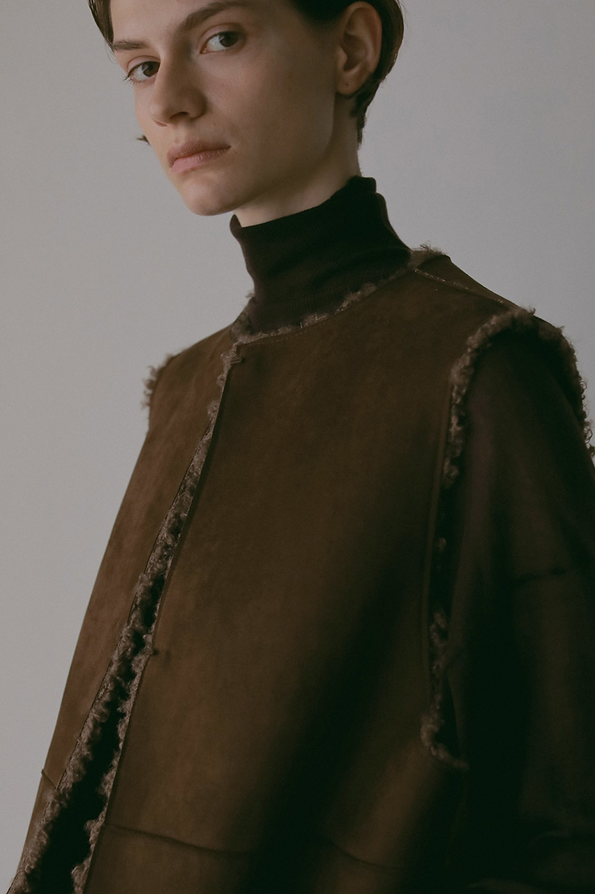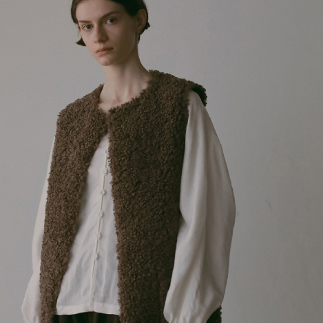 毛足に表情のあるカーリングフェイクファーを使用した、リバーシブル仕様のベスト。表情の異なる2つの面を楽しめて、その日の気分やスタイリングに合わせた着こなしが叶います。シンプルなデザインとすっきりとした丈感で合わせやすく、深みのあるブラウンのファーが秋らしい空気を添えてくれる一枚。カットソーやシャツにさらりと重ねるだけで、季節感のあるレイヤードスタイルが完成します。