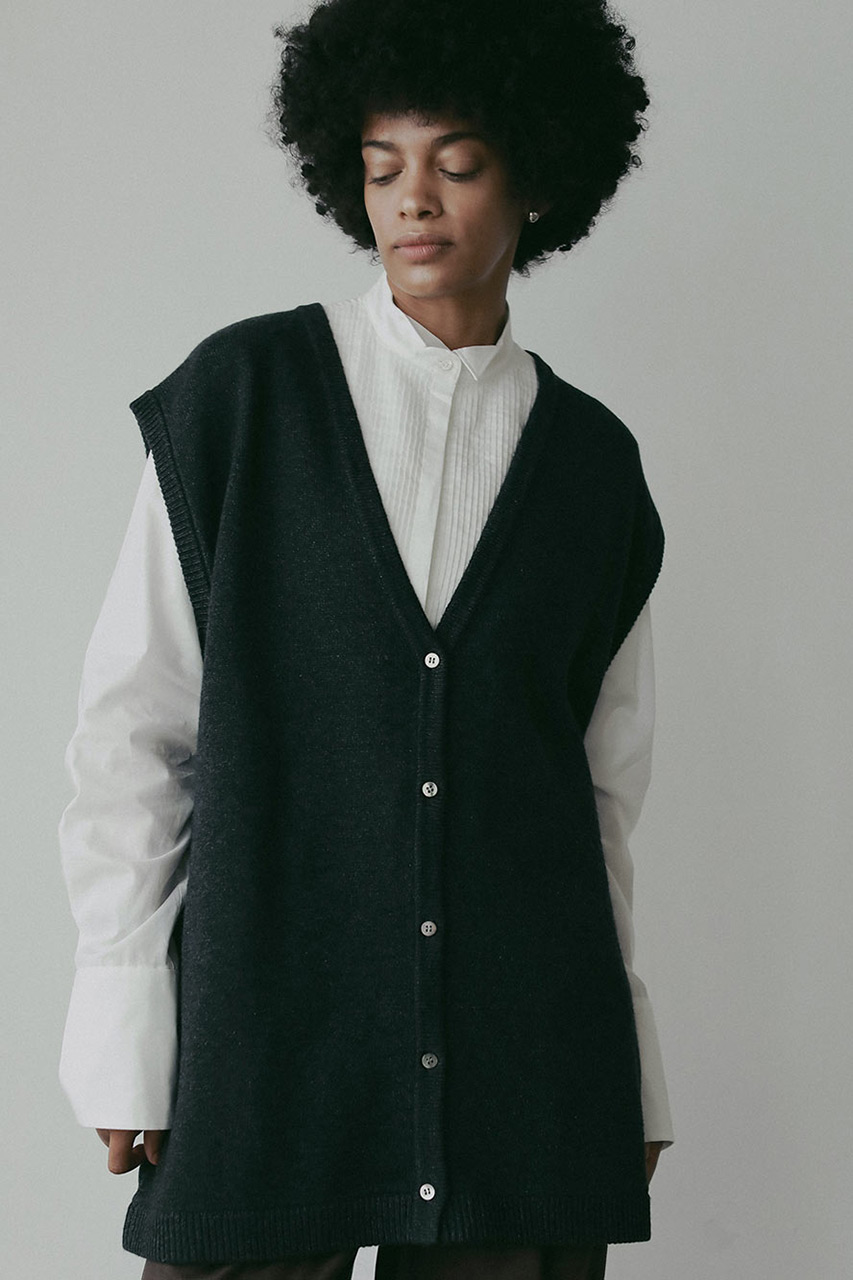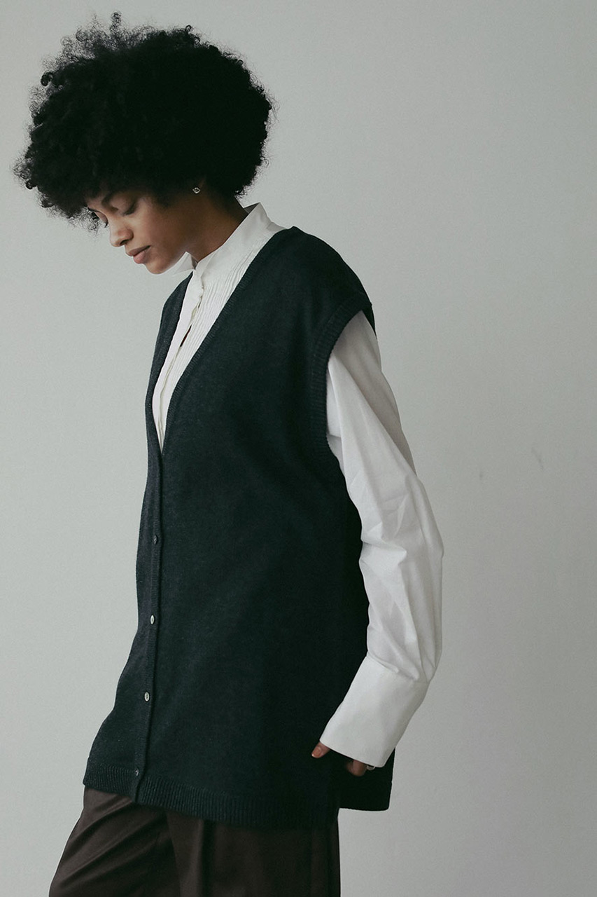 やわらかな風合いのウール×コットンで編んだ、ゆったりシルエットのニットベスト。Tシャツやシャツに重ねるだけで、季節の変わり目にちょうどいいバランスに。ナチュラルな編み地がほどよいラフさを演出してくれて、パンツにもスカートにもすっとなじみます。気軽に毎日着たくなる、そんな一枚です。