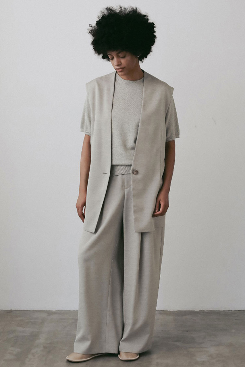 リネンライク素材のジレとパンツをセットで着こなした、軽やかさのある秋のベージュトーンコーデ。中に合わせた半袖ニットが、季節の変わり目にちょうどよく、抜け感のある大人のスタイルを演出します。やわらかな色合いとすっきりしたシルエットで、秋の始まりにぴったりな、品よく決まる一着です。
