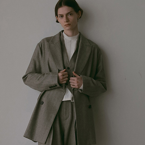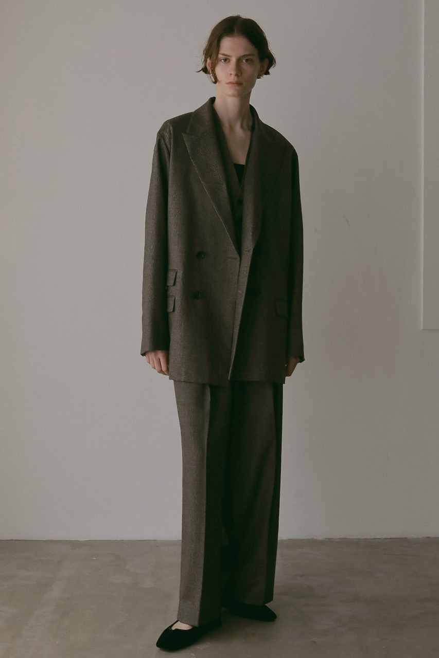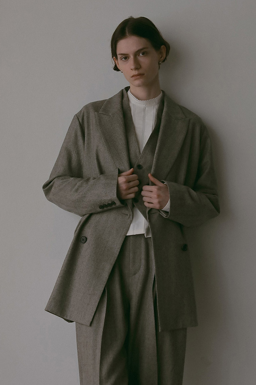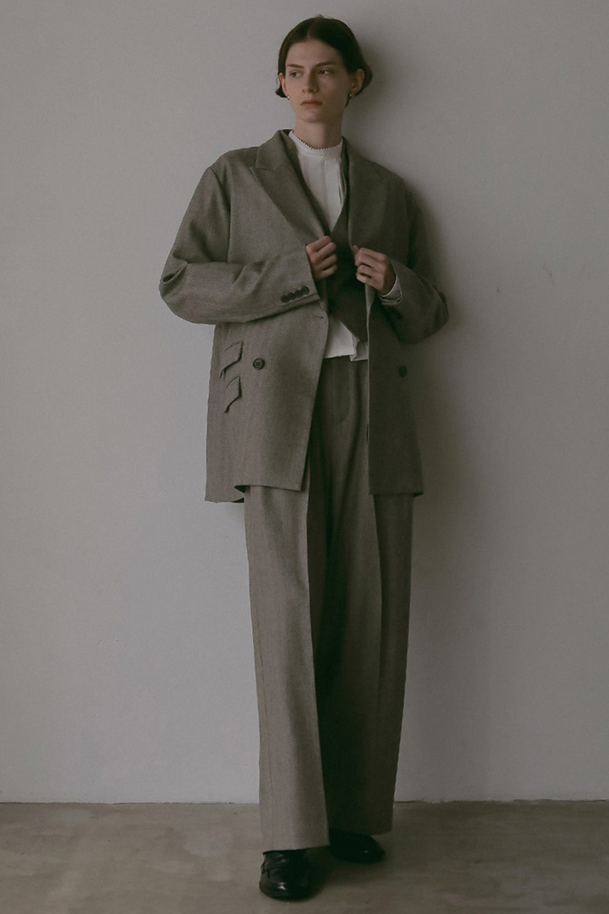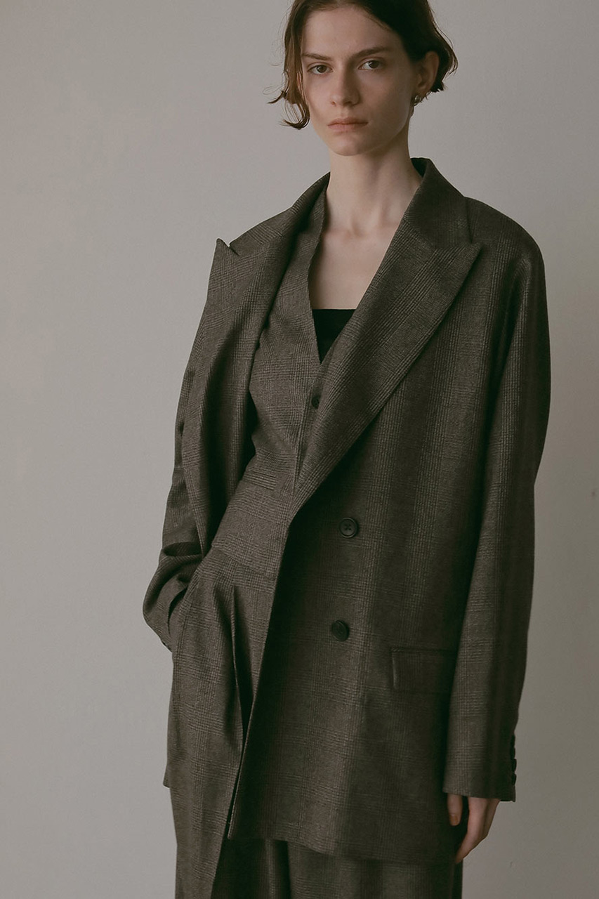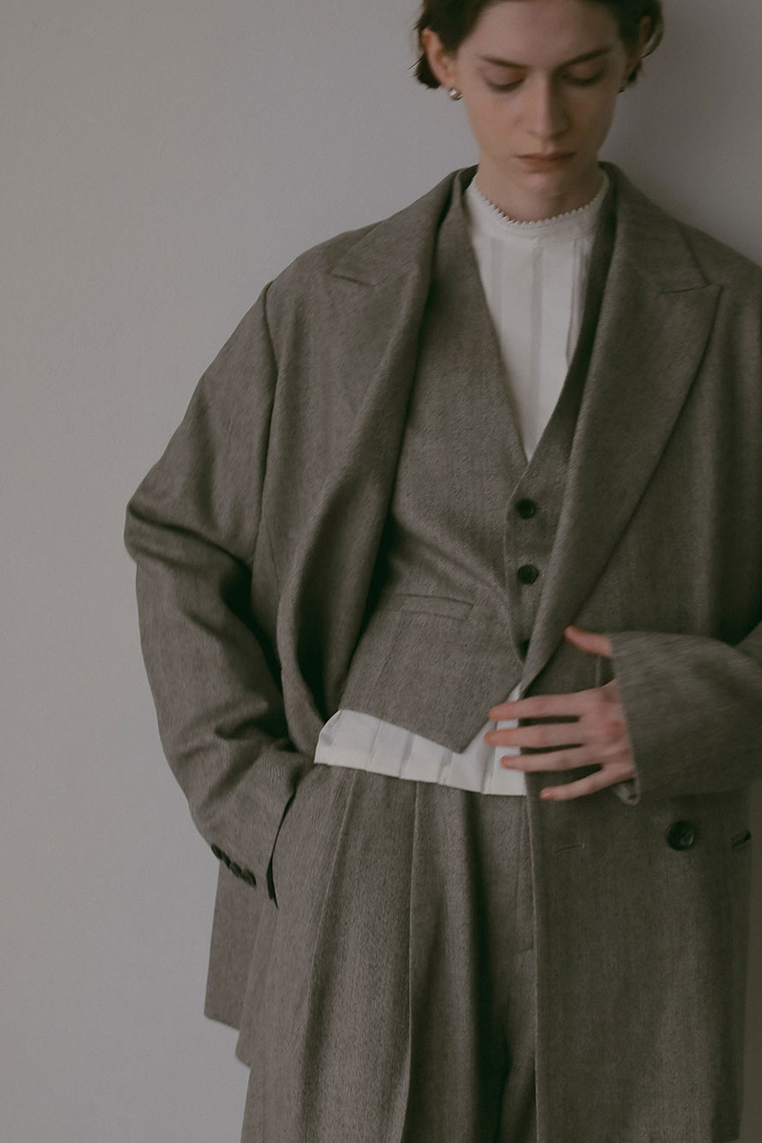 先染めのサキソニー素材を使ったダブルブレストジャケット。肩が少し落ちたリラックスシルエットで、きっちりしすぎずオンオフどちらでも活躍します。チェンジポケットがクラシカルなアクセントに。秋らしいチェック柄とヘリンボーン柄の2色展開。ウールに樹脂加工を施しているので、毛羽立ちにくくシワにも強いのが嬉しいポイント。同素材のタックパンツベストやパンツと合わせての着用がおすすめ。