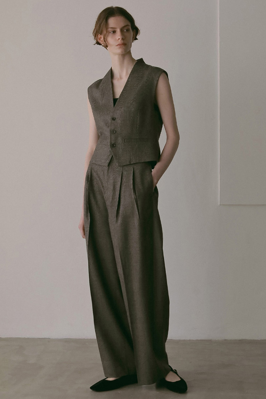 一方、ジャケット・ベスト・タックパンツのセットアップは、きちんと感とトレンドを両立。