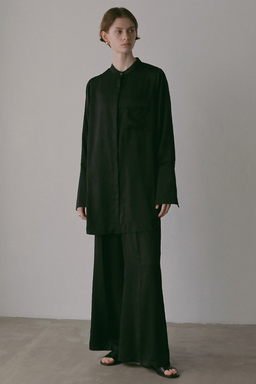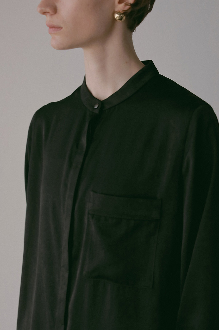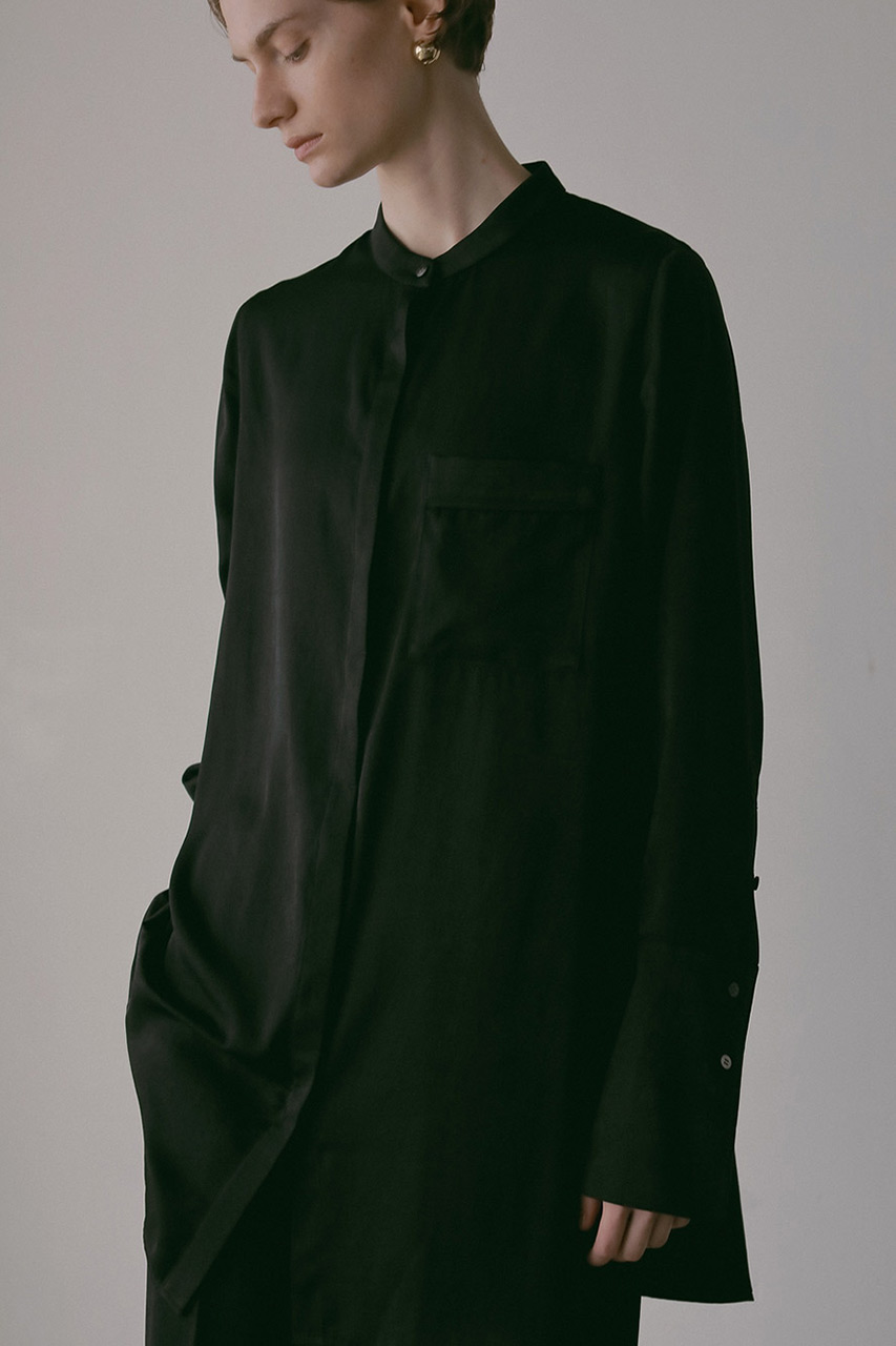 ほのかな起毛感と、しなやかなドレープが魅力のサテンシャツブラウス。ベルベットのような上品な光沢があり、着るだけでぐっと華やかな印象に。ゆったりとしたシルエットとヒップが隠れる長め丈で、リラックス感のある着ここち。同素材のパンツとセットアップで着こなせば、シンプルなのに洗練されたスタイルが完成。