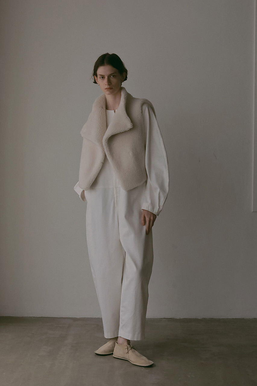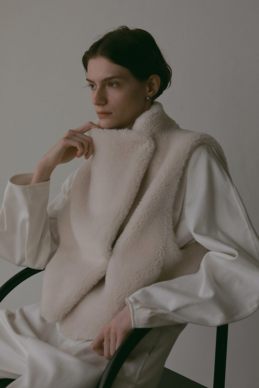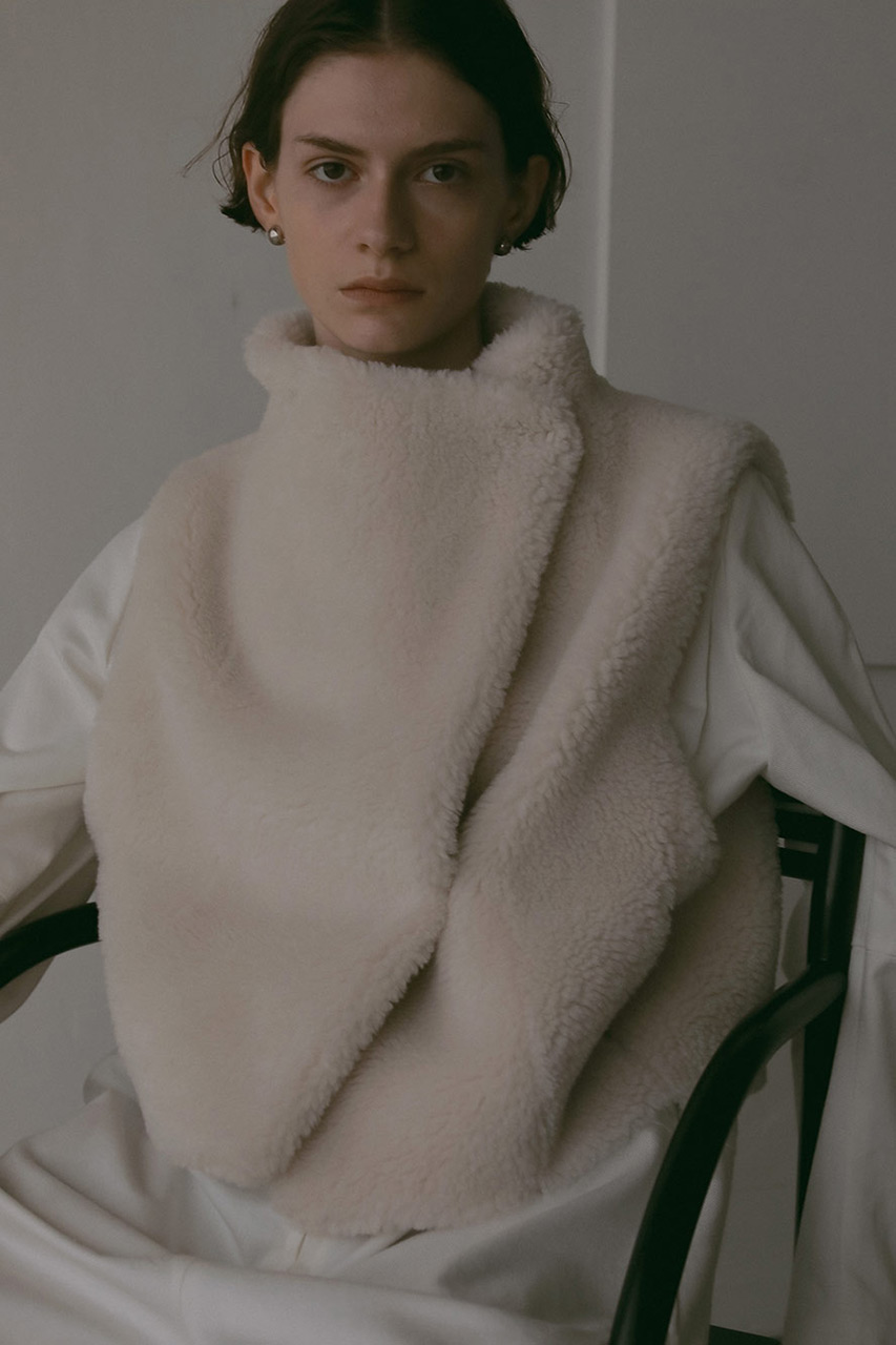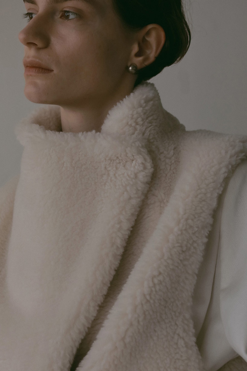 あたたかみのあるウール混のボア素材で仕立てた、秋らしいコンパクトベスト。Tシャツやニットにさっと羽織るだけで、季節感のある着こなしに。厚みがありながらも軽く、シンプルなデザインでどんなスタイルにも合わせやすい一枚です。オンにもオフにも気軽に取り入れられる、今シーズンの頼れるアイテム。