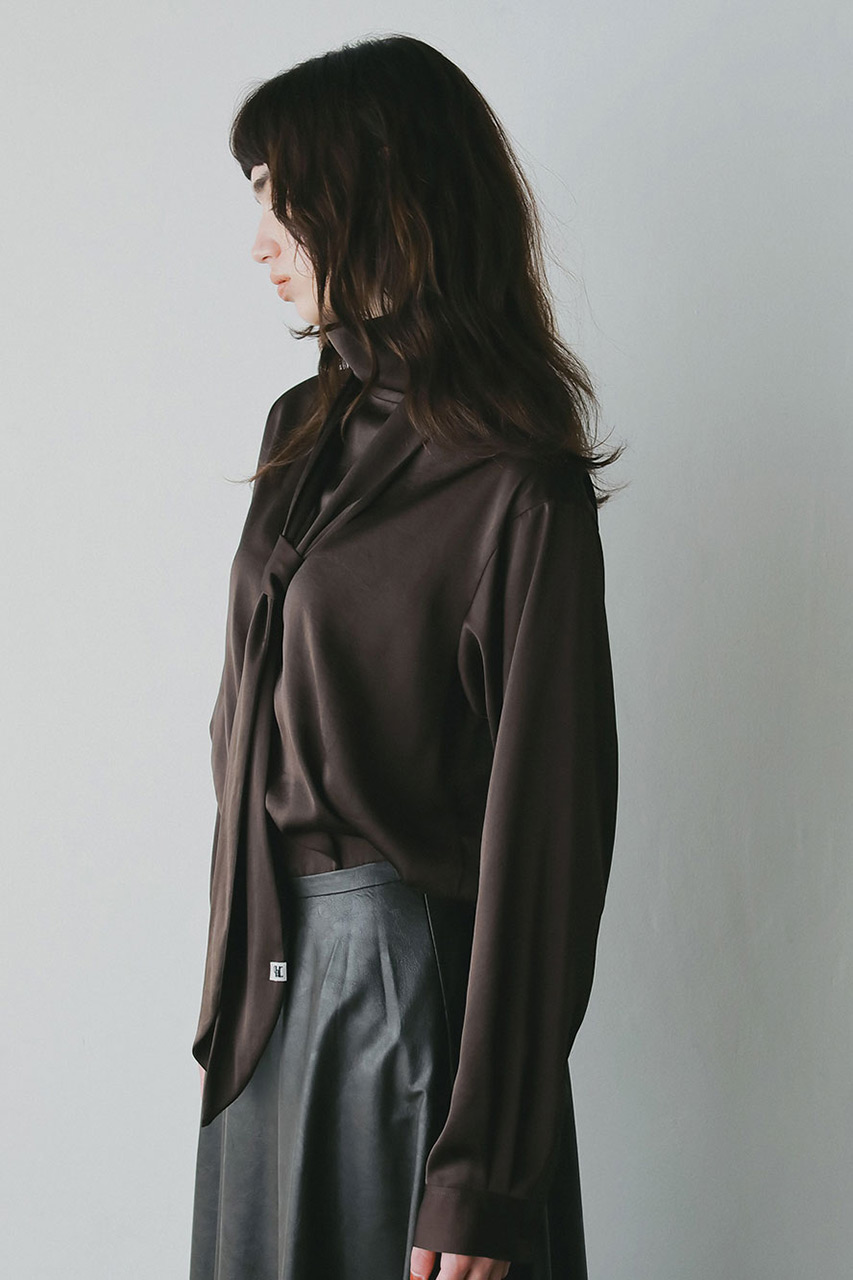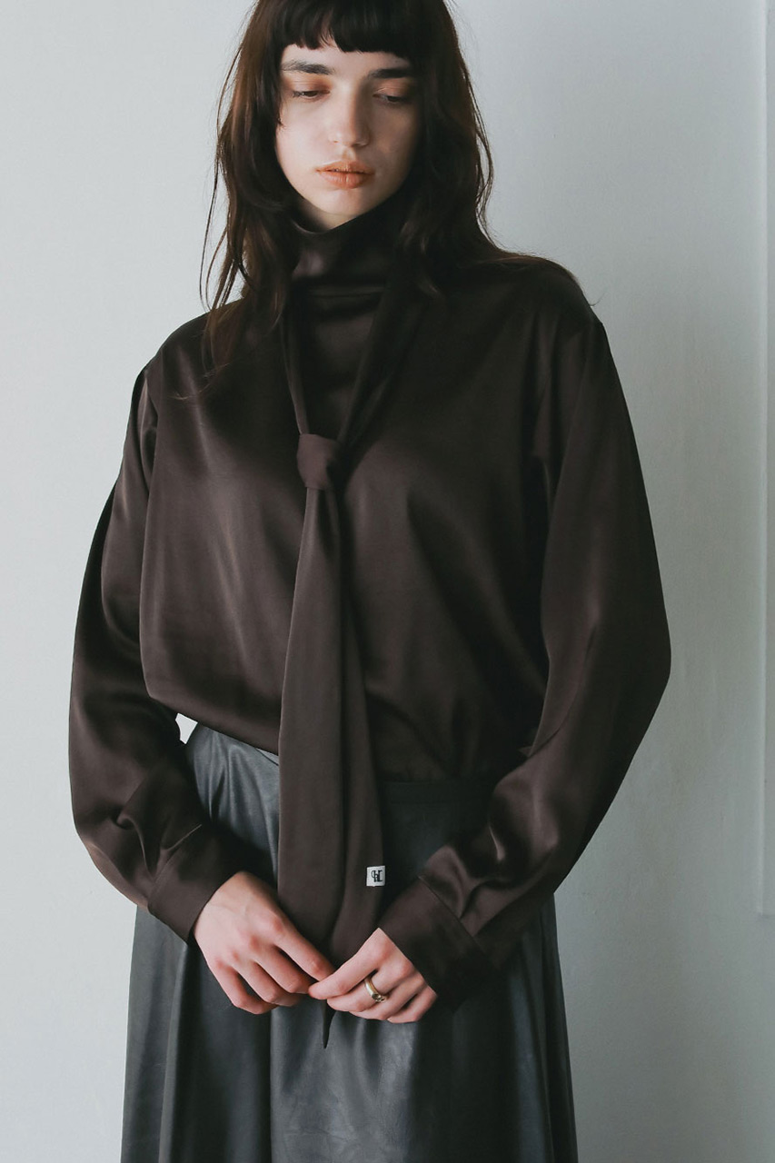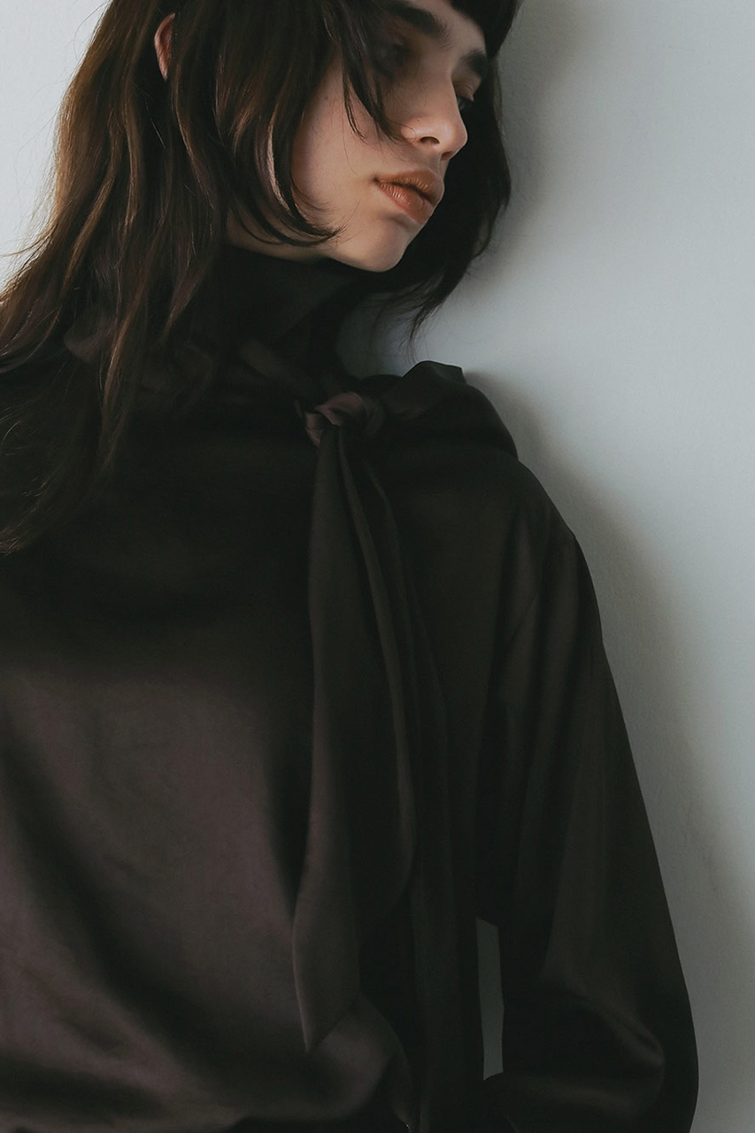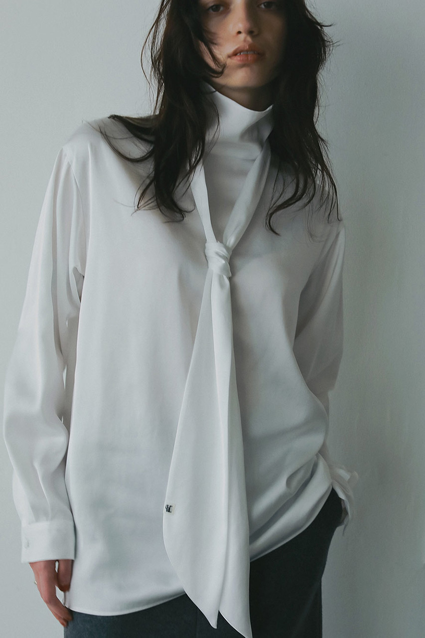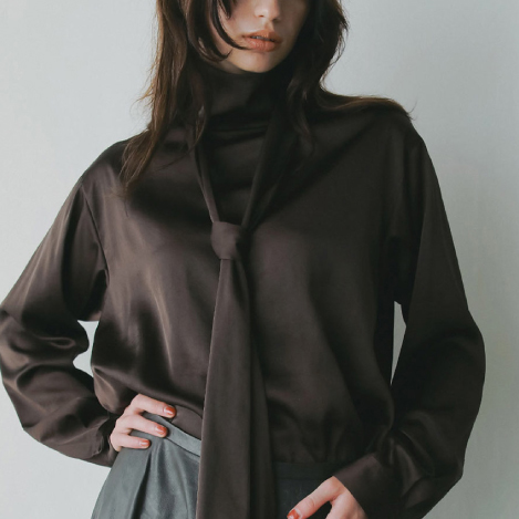 高めのハイネックや取り外せるボウタイで、オフィスにも週末のディナーにも◎