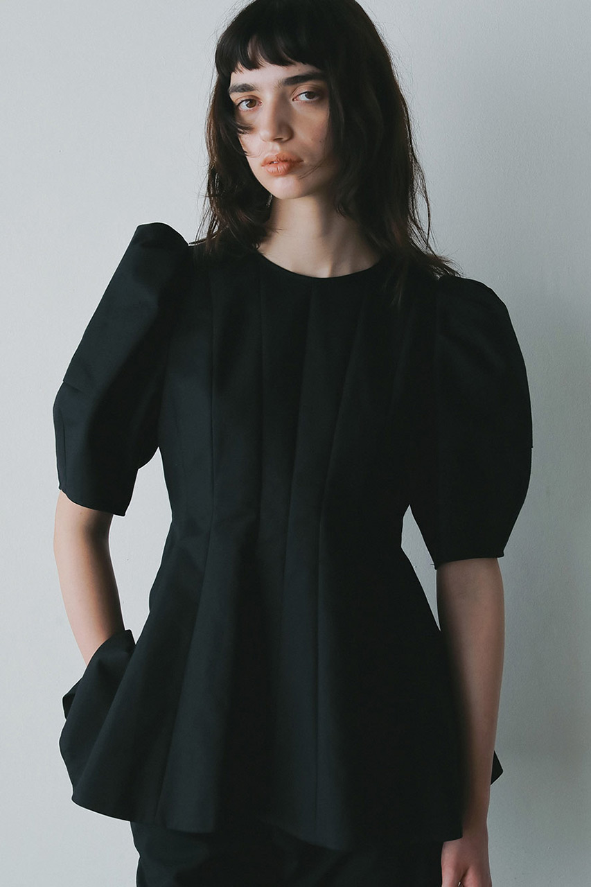 立体的なペプラムシルエットとランタンスリーブが目を引く、デザインブラウス。