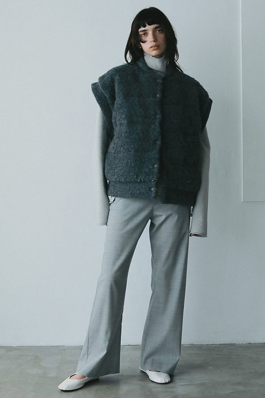 色のトーンをそろえながら、素材や編地に変化をつけることで、ワントーンでも奥行きのある着こなしに。