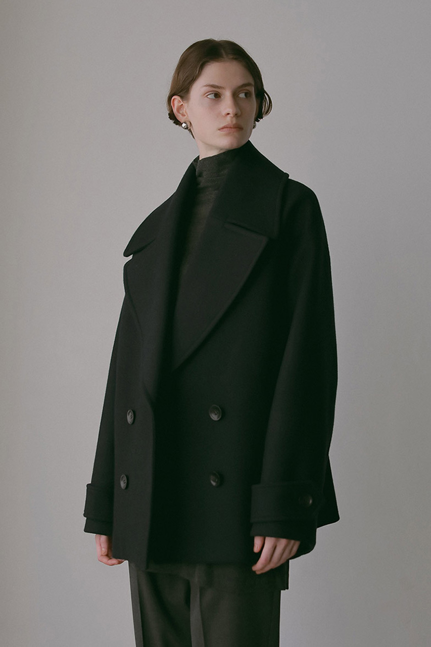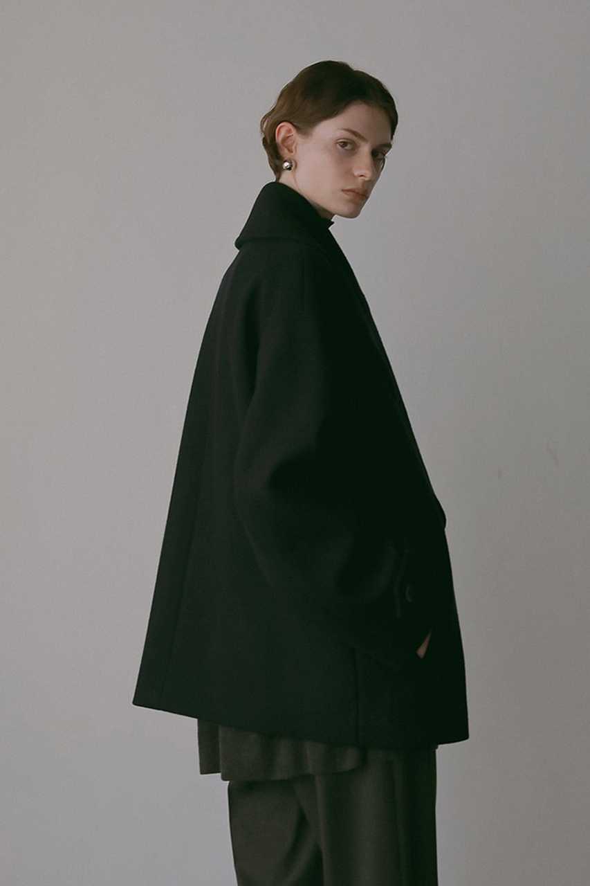 大きな衿が顔まわりを華やかに演出し、ボックスシルエットで今っぽい洗練された印象に。