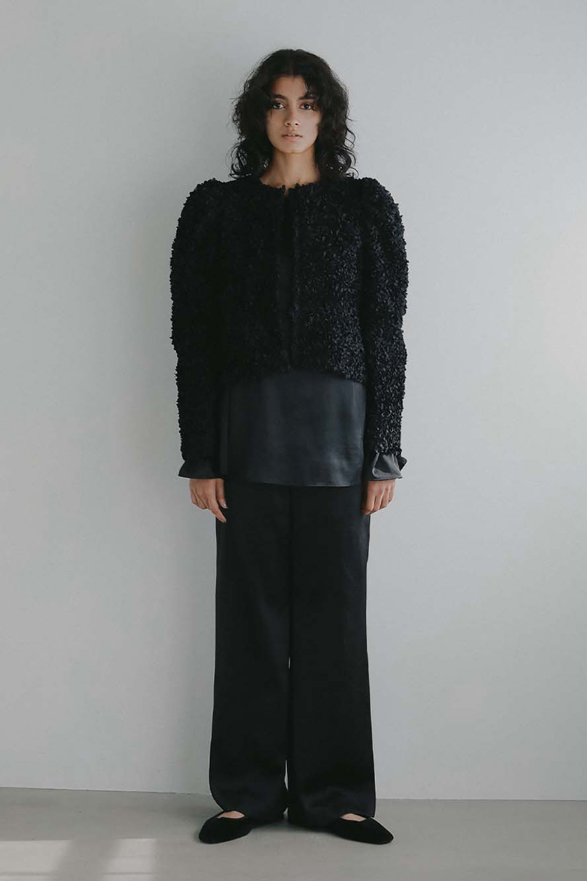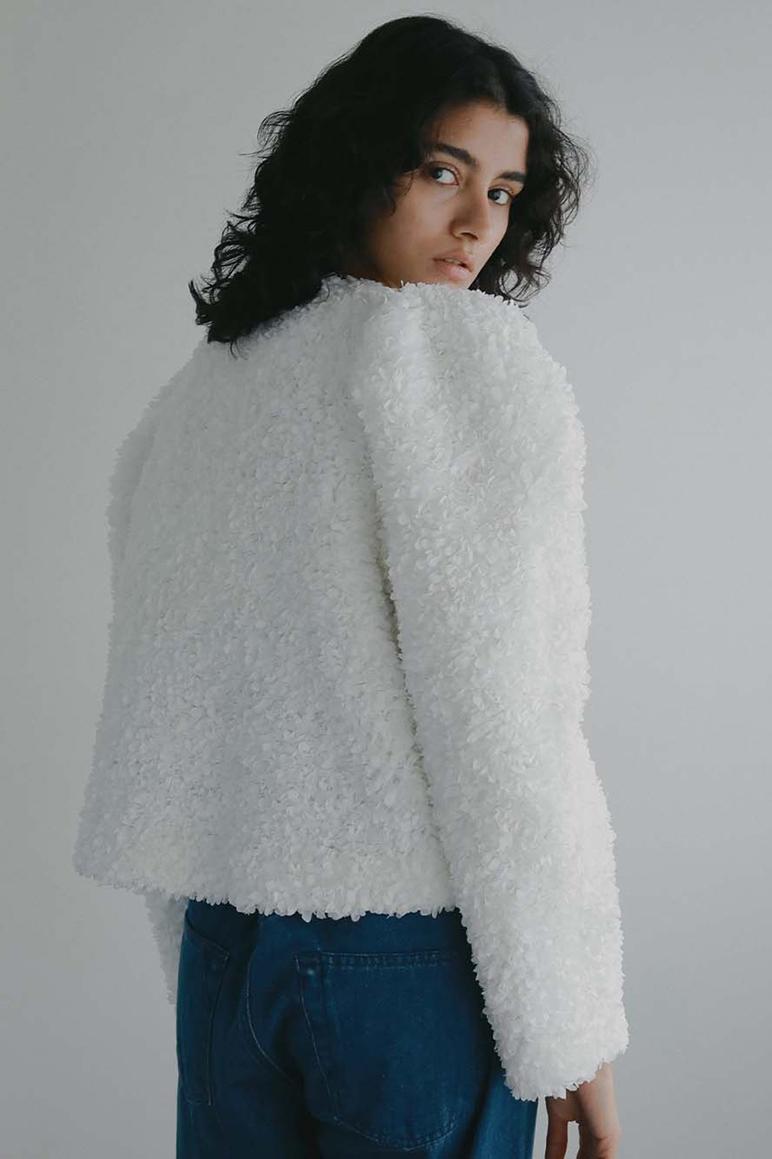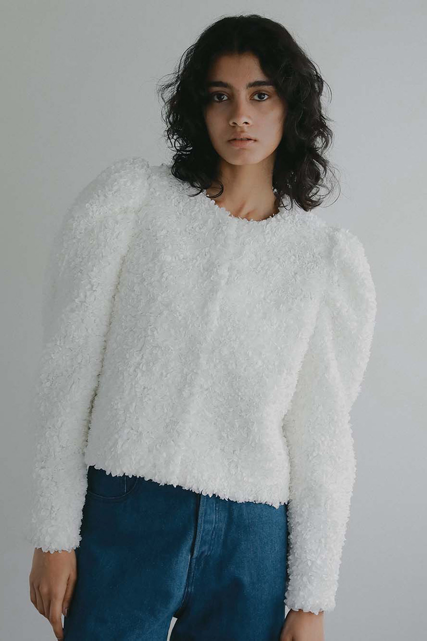 花びらを集めたような立体的なレース素材で仕立てた華やかで目をひくジャケット。