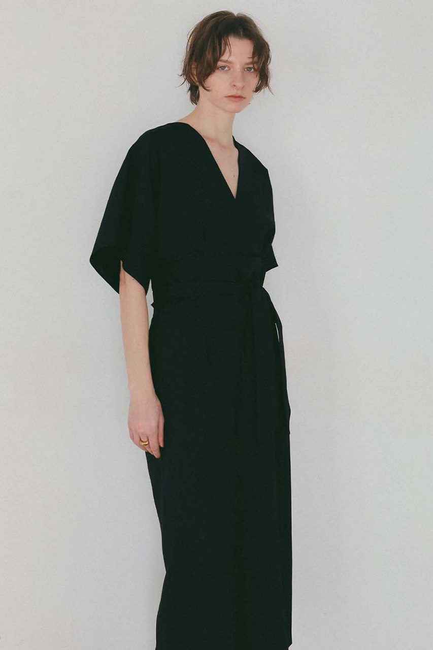 ウエストのタックと綺麗なVネックがスッキリ見せてくれる1枚。