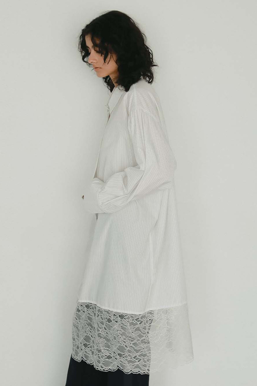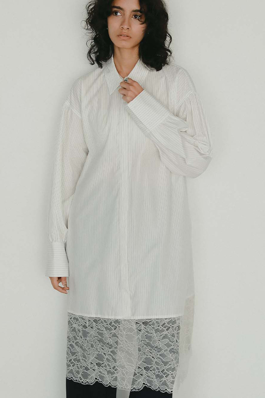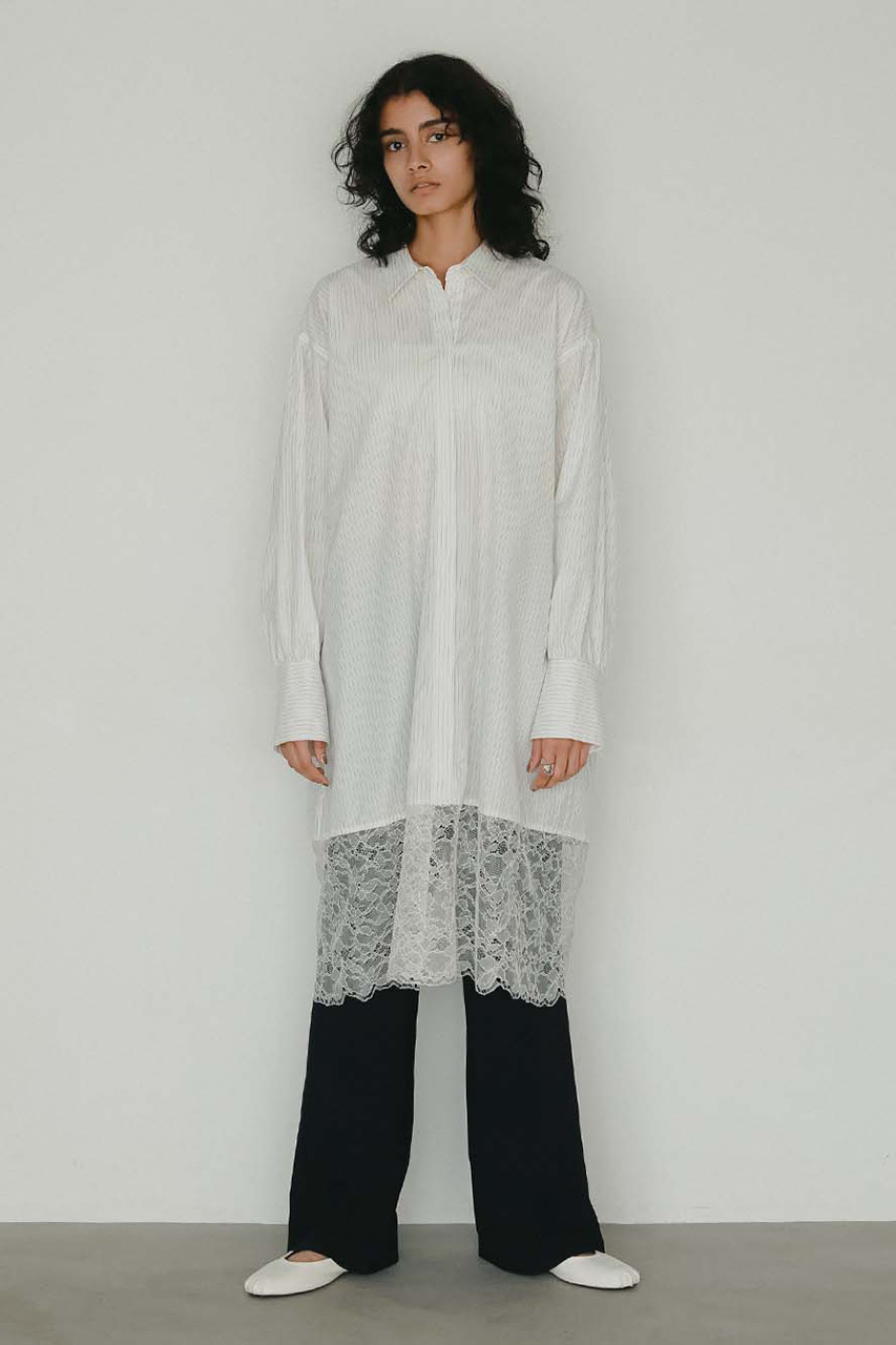 柔らかなタッチのストライプのシャツ地に繊細なレースを組み合わせたレースコンビシャツワンピース。