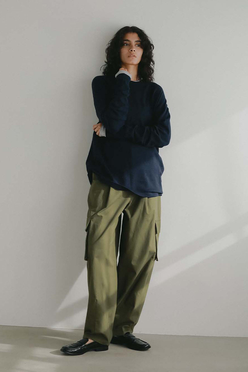 タイト過ぎないリラックスした身幅や袖で、下に着るものを選ばずインナーの変化によって幅広く着回しがききます。