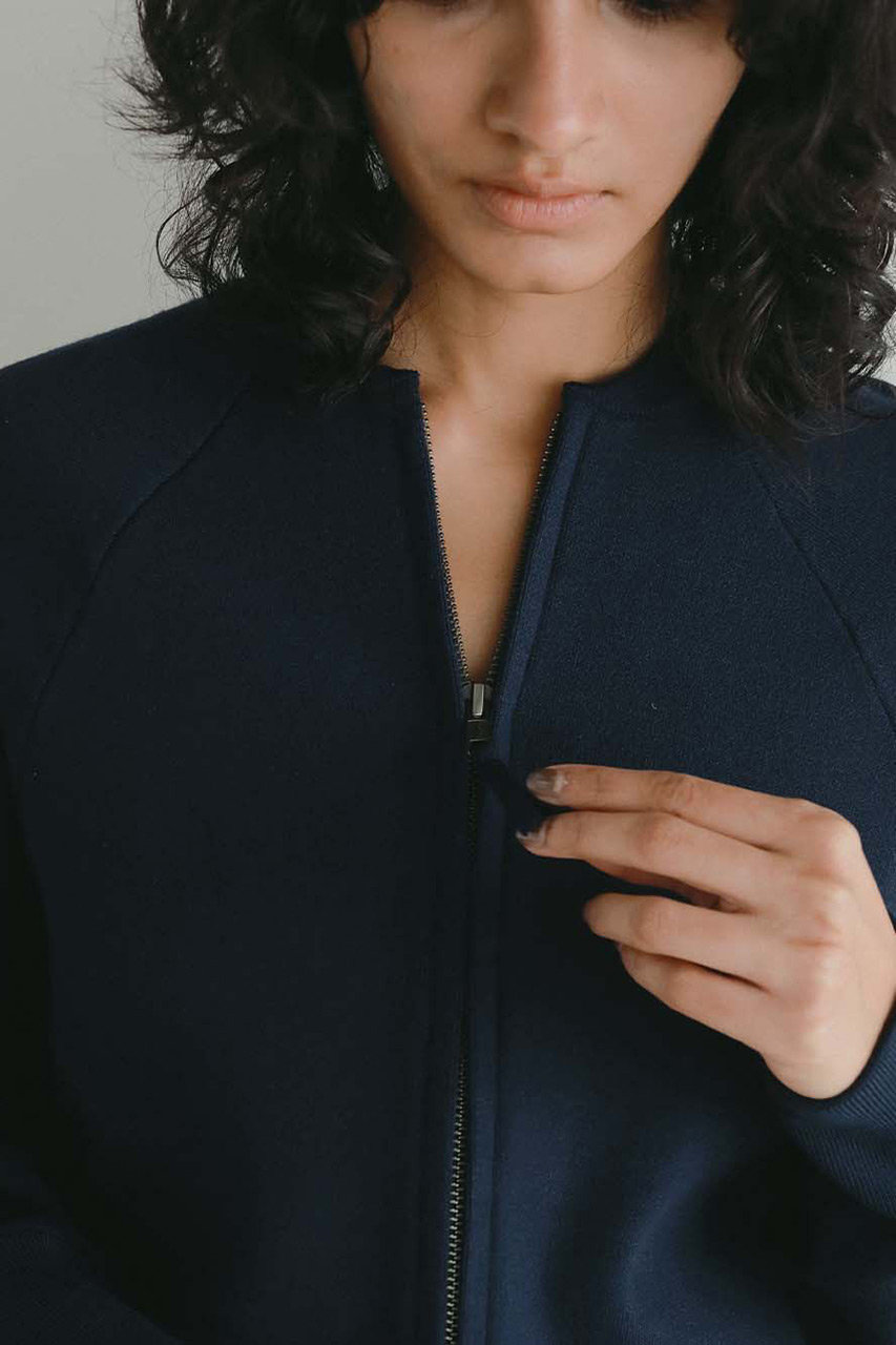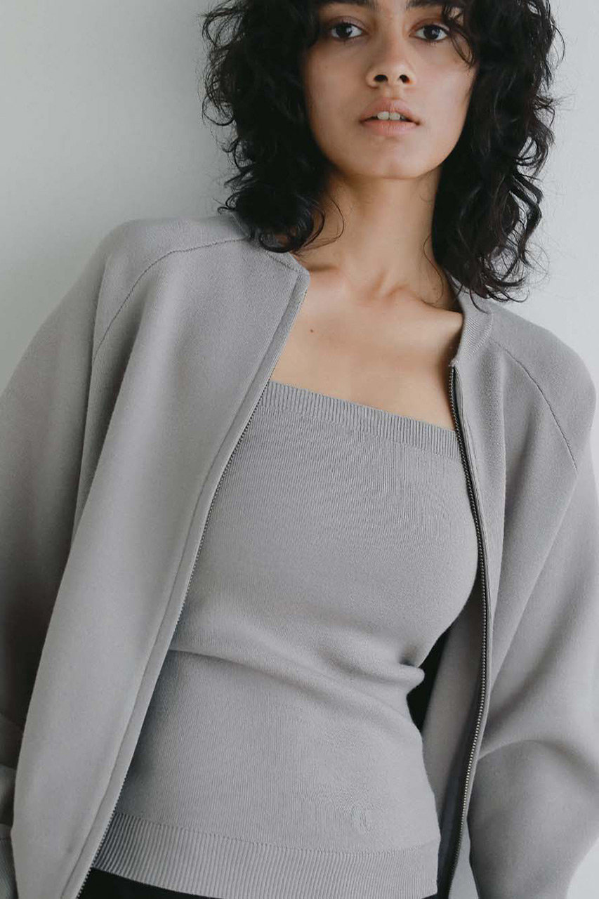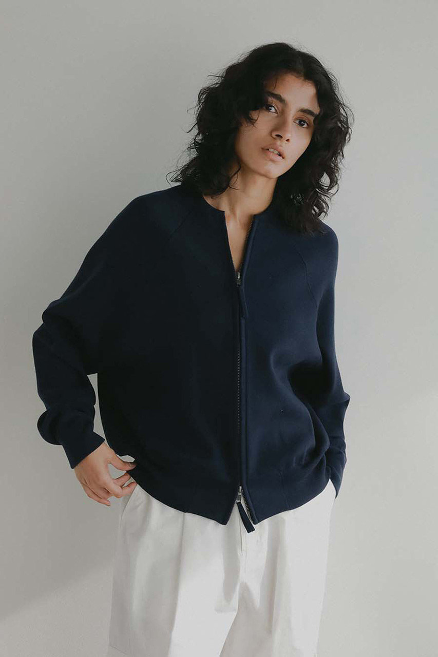 適度な厚みとスッキリとしたスムースの編み地が特徴のニットブルゾン。