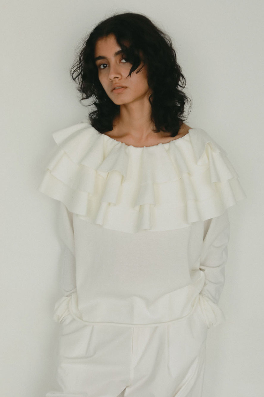 目をひく衿元のフリルが印象的なニットプルオーバー。