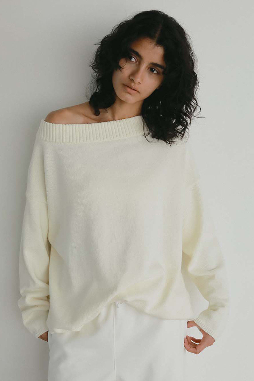 デコルテを見せて、抜け感のあるスタイリングや、シャツブラウスとのレイヤードスタイルもお楽しみいただけます。