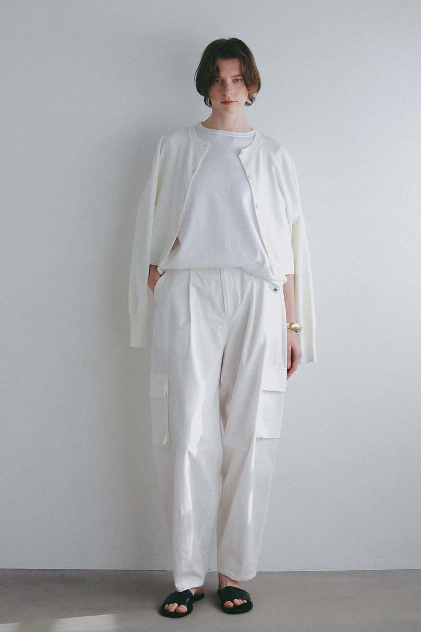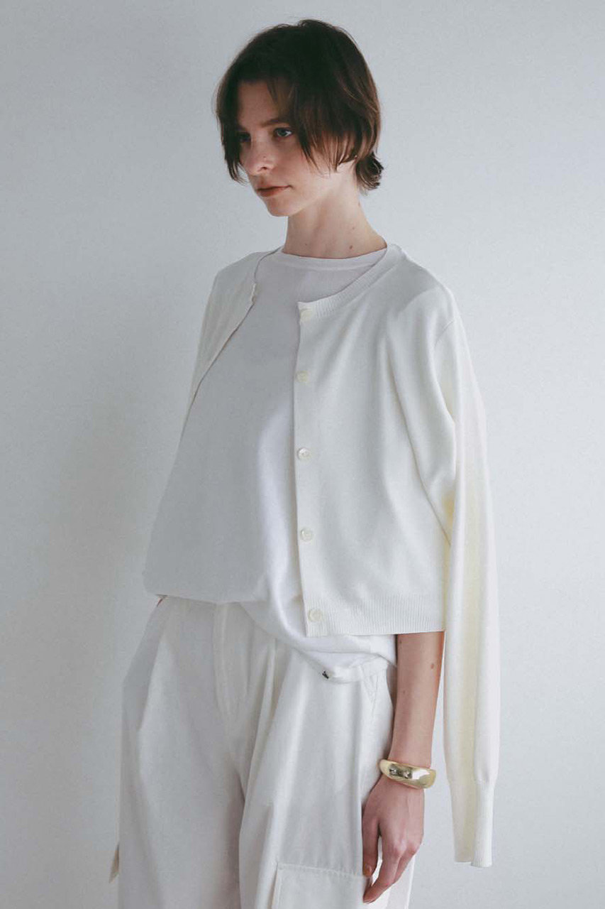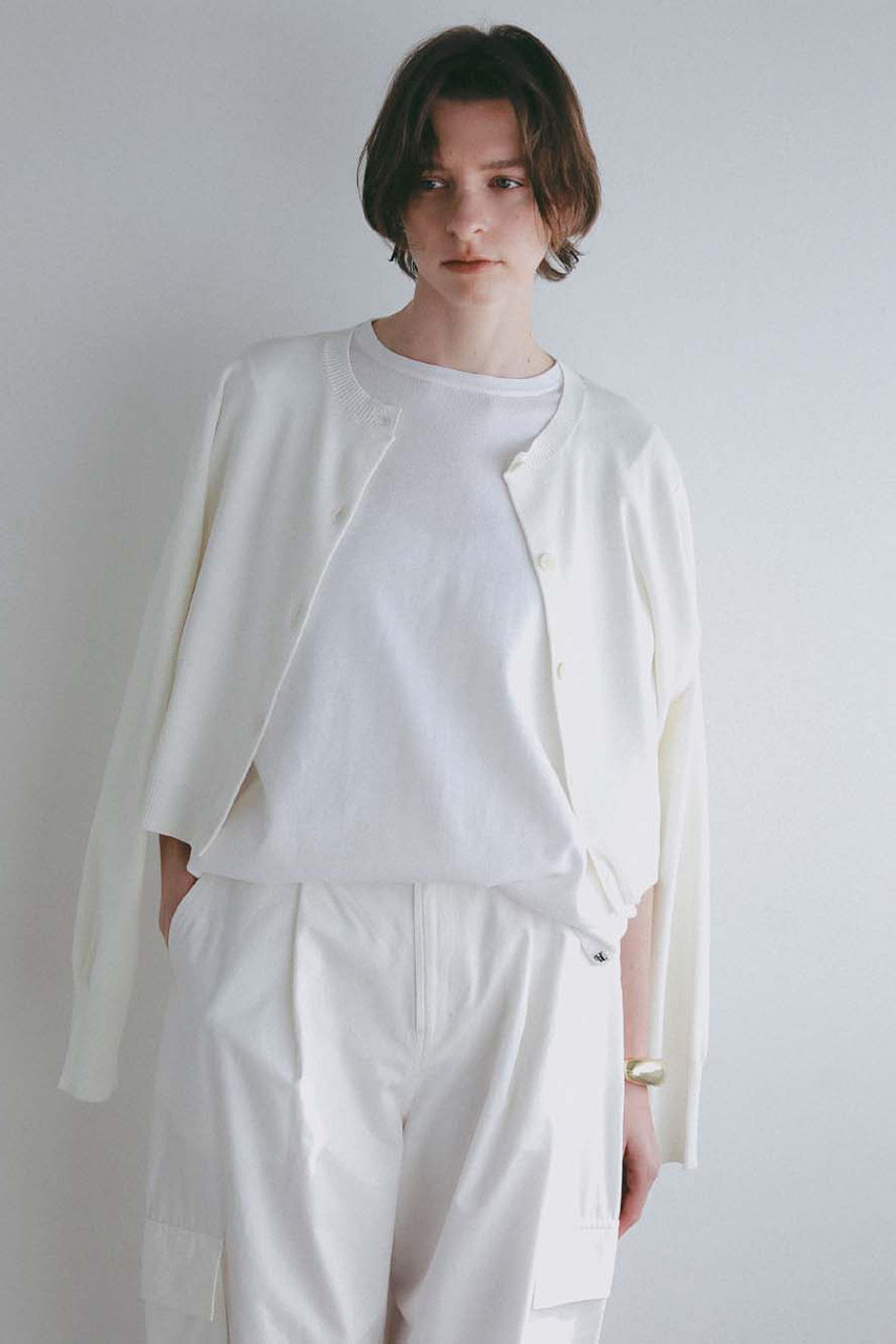 コットン・ナイロンの糸を編みたてておりナチュラルな表情感は春先に重宝する1枚。