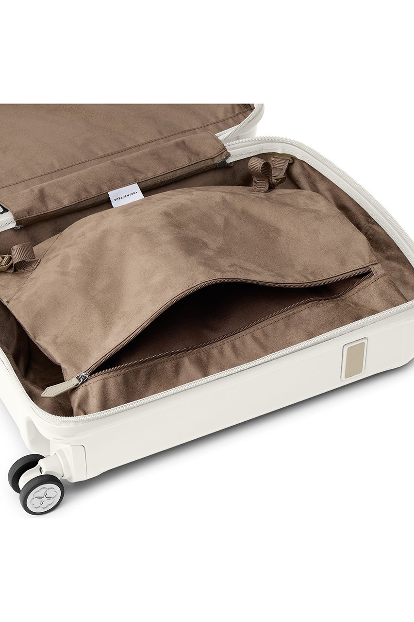 イタリアの伝統と「ボナベンチュラ」の洗練が融合した、落ち着いたマット仕上げのポリカーボネートスーツケース。マットな質感に映える上質なレザーバンドが控えめで品のあるアクセントを添えます。軽量で耐衝撃性に優れ、耐熱・耐UV性能も備え長時間の旅を安心サポート。滑らかなスエードタッチの内装と開閉しやすいコイルファスナーを採用。石畳も軽やかに進む360度回転キャスターや調節可能なハンドルなど機能も充実。「ボナベンチュラ」オリジナルの永遠の幸福を願うクローバーモチーフが細部に施し、保管用ロゴ入りカバーもセットに。