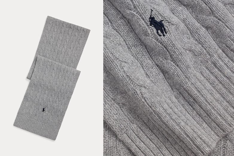 極細メリノウールを使用した、クラシックなケーブル編みのウールブレンドマフラー。立体感ある編地が上品な存在感を演出し、シグネチャーのポニー刺しゅうがさりげないアクセントに。ふんわりとした肌ざわりと保温性を備え、デイリーに活躍するアイテム。