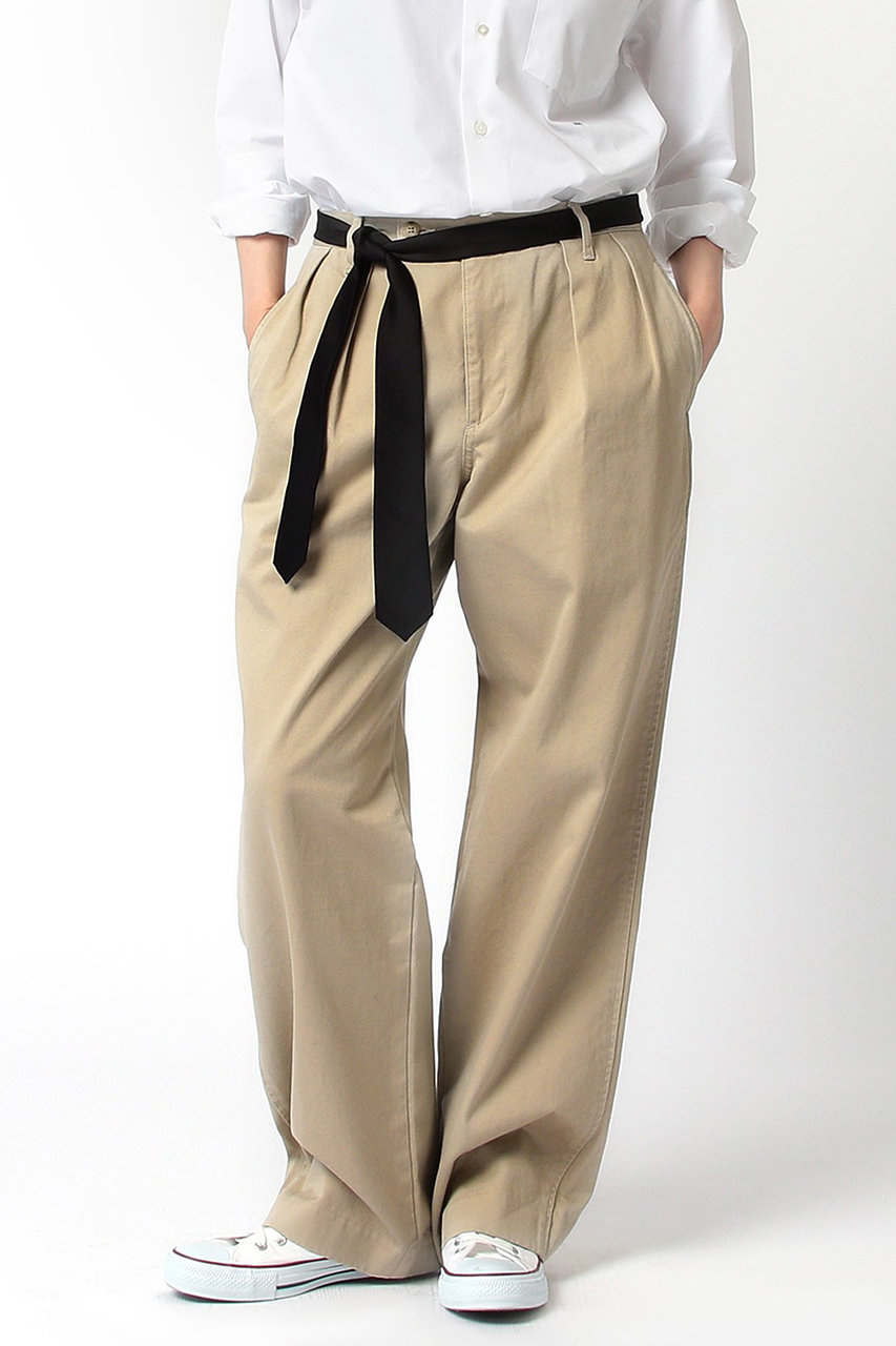コットン素材のパンツは、チノパンツとスラックスをミックスしたようなデザインに仕上げています。ステッチの糸を細くすることで綺麗目な印象になり、ウエストのタックで立体感のあるシルエットを実現。サイズをアップして、Paris Tie Beltのようなベルトでウエストを締めてはいていただくのもおすすめです。