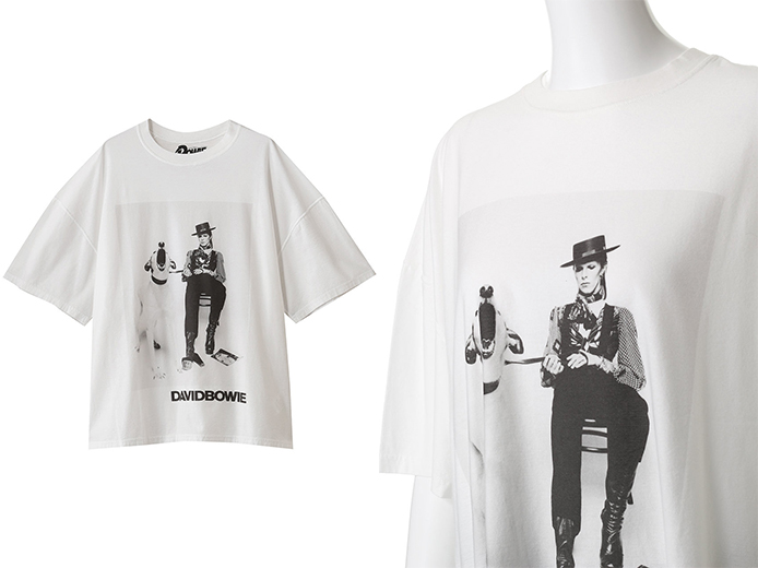 1974年にリリースされた「DAIAMOND DOG」のアートワークを使用。テリー・オニールにより撮影された存在感のあるフォログラフはインパクト絶大。オーガ―ニックを使用、あえて天竺の裏目を表側にして化学薬剤を一切使用しない特別加工を施し、よりヴィンテージ感を演出。