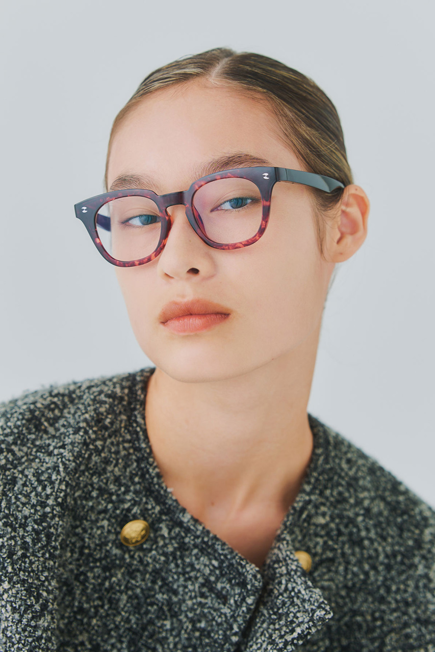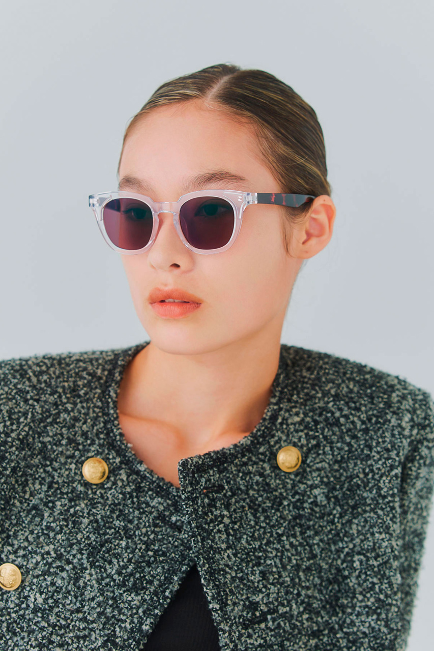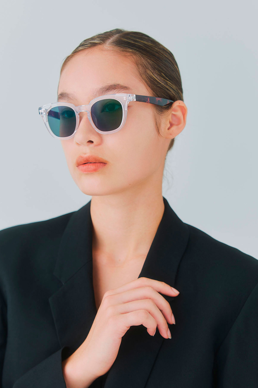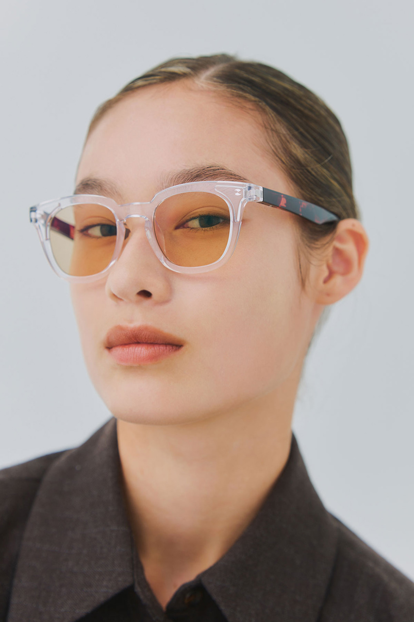 クリアのフロントにべっ甲のテンプルを重ねた配色は、光を受けるたびにニュアンスを変える洗練されたツートーンデザイン。