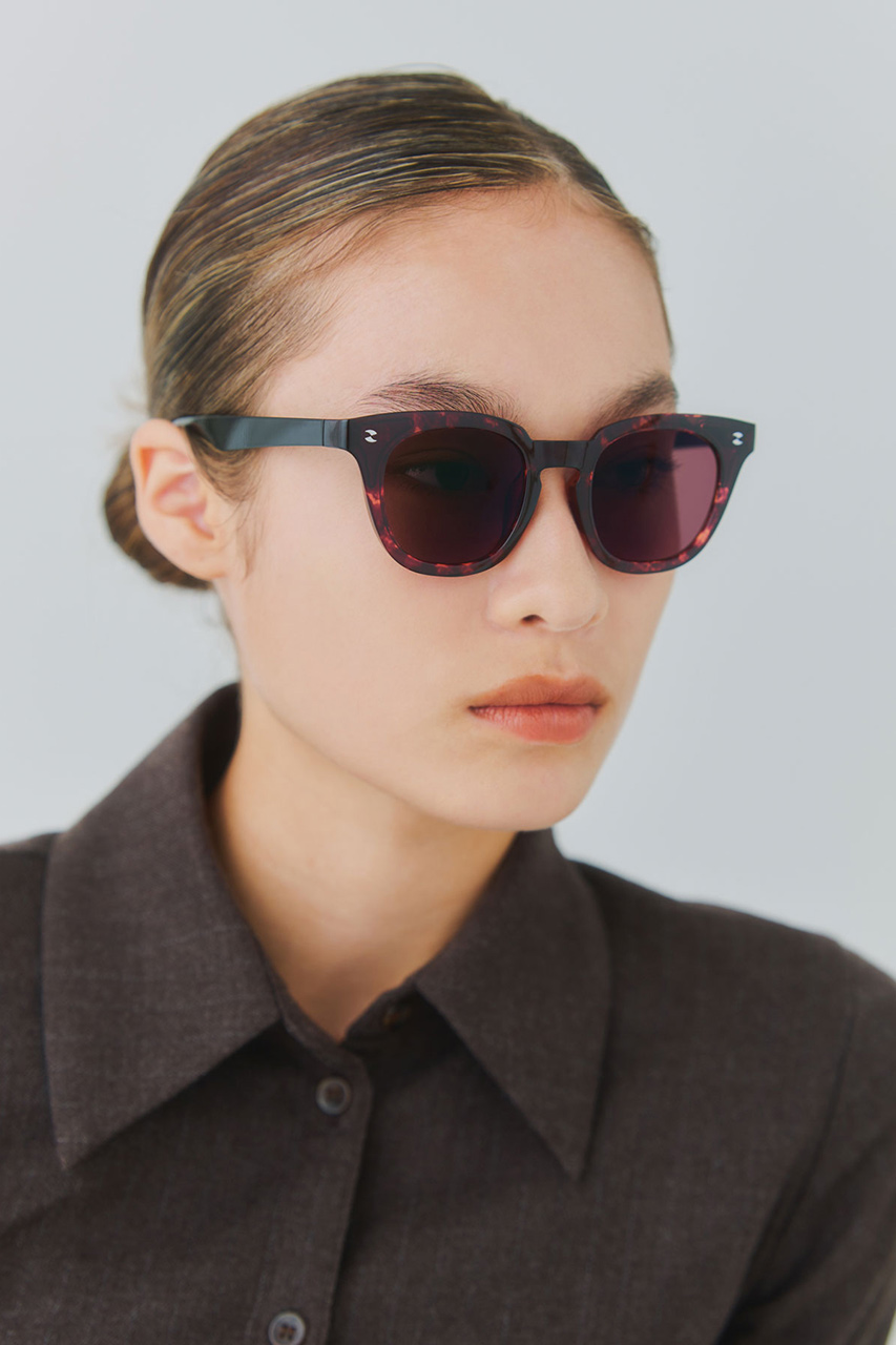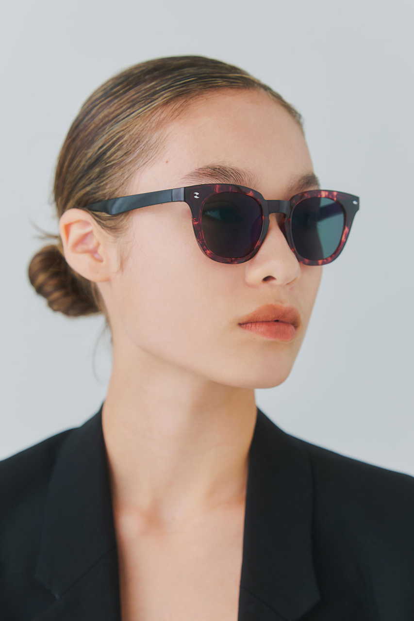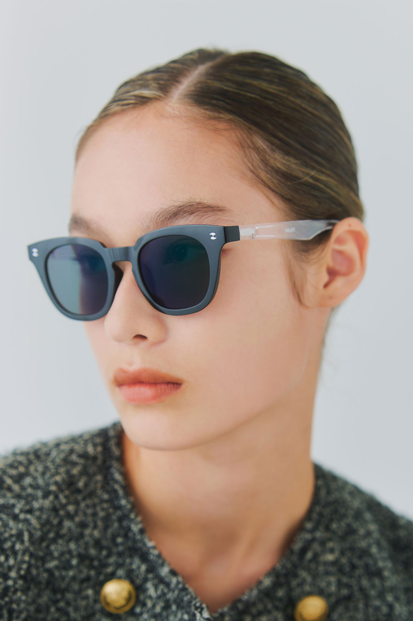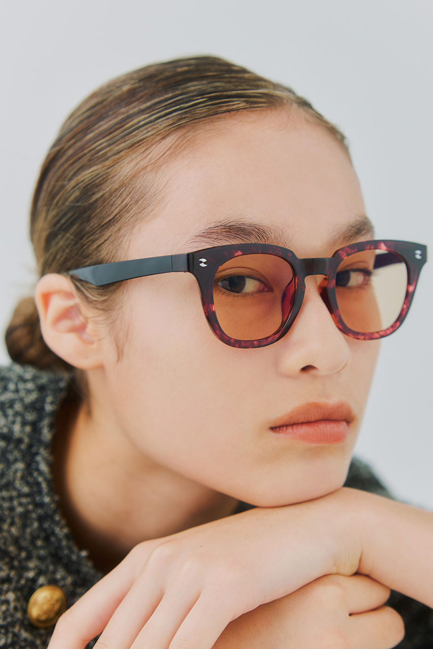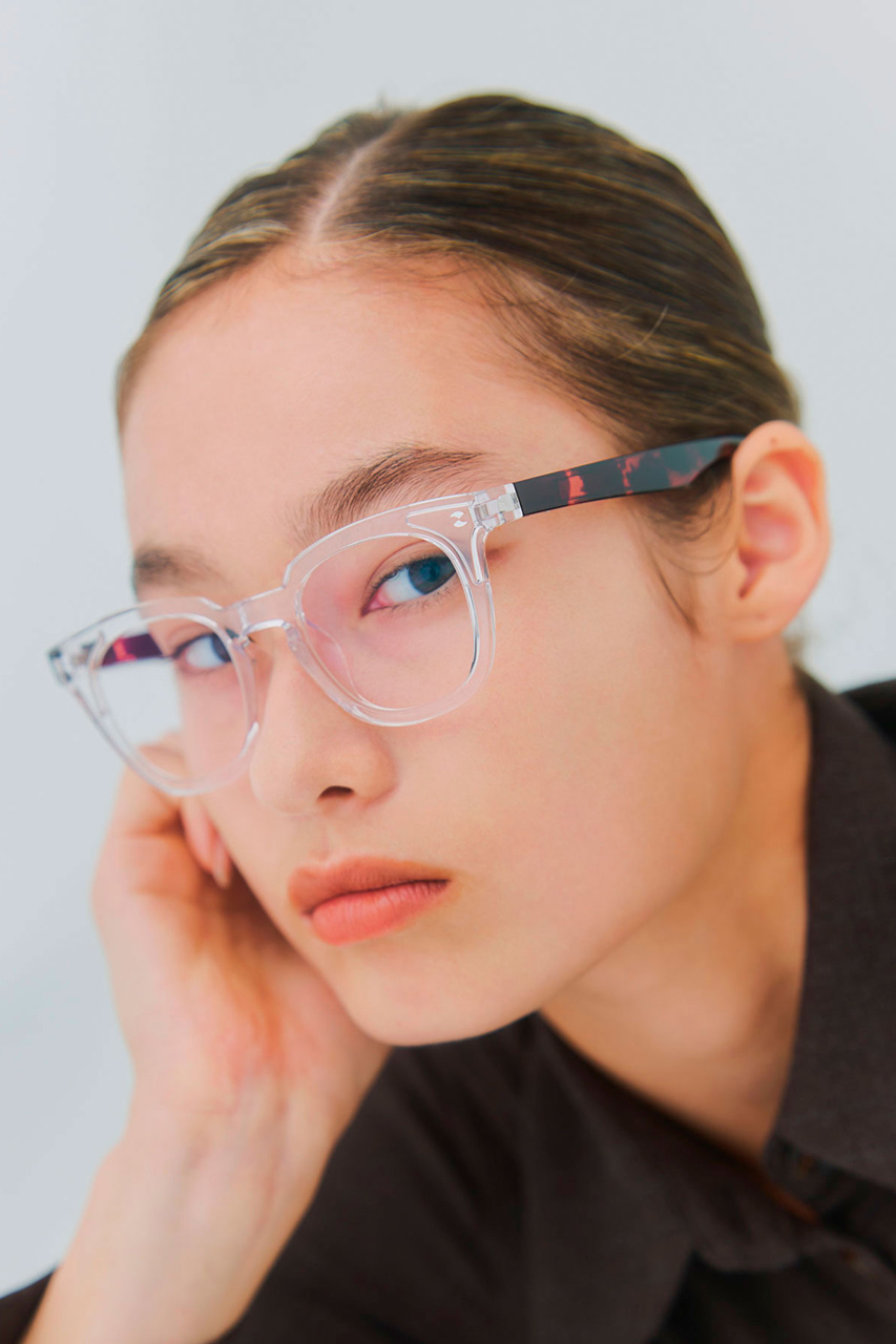 クリアのフロントにべっ甲のテンプルを重ねた配色は、光を受けるたびにニュアンスを変える洗練されたツートーンデザイン。