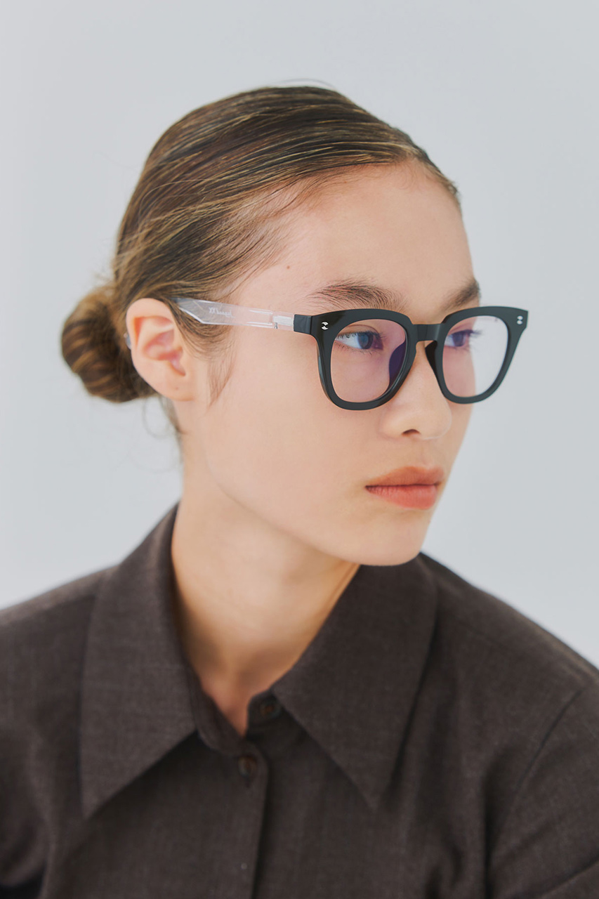 フロントのブラックが知的な重厚感を演出し、サイドのクリアが軽やかさをプラスするコンビネーション。