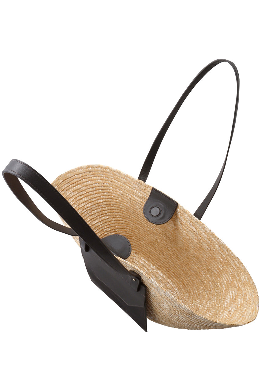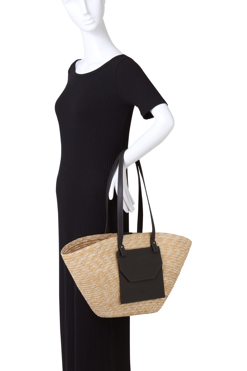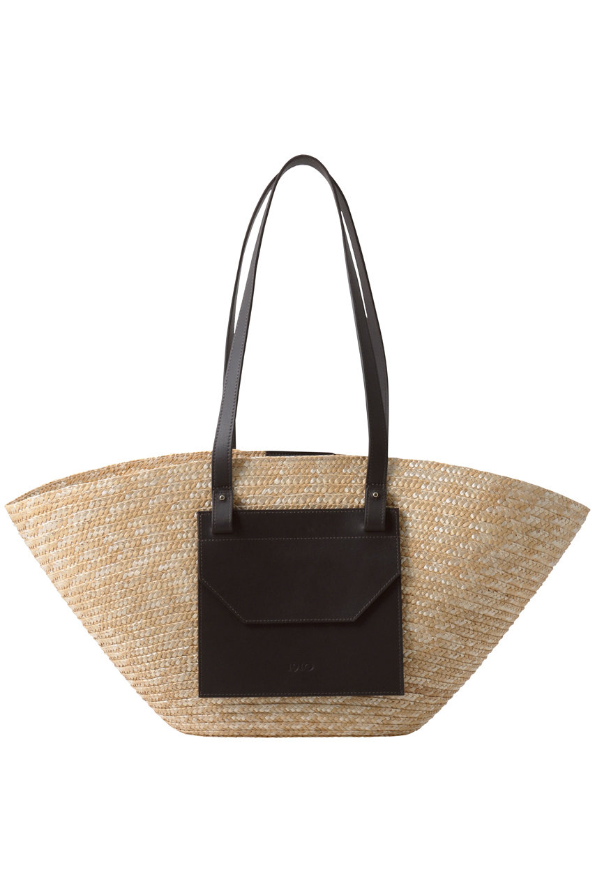 フロントの大きなレザーポケットとストロー素材の組み合わせが端正なカゴバッグ。ハンドルもしっかり長さがあるので、肩掛けも可能。たっぷり収納できるサイズ感で、休日のお出かけはもちろん、通勤バッグとしても活躍。