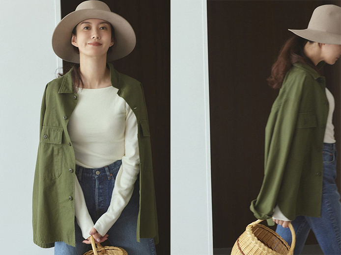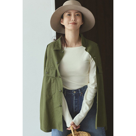 ヴィンテージ感と着回し力が魅力のミリタリージャケット。シャツ感覚で軽やかに羽織れる一枚です。ゆったりとしたオーバーサイズシルエットと大きめのポケットがアクセント。光沢感と心地よい肌触りの本格バックサテン素材を使用し、きれいめからフェミニンまで、幅広いスタイルでレイヤードを楽しめます。