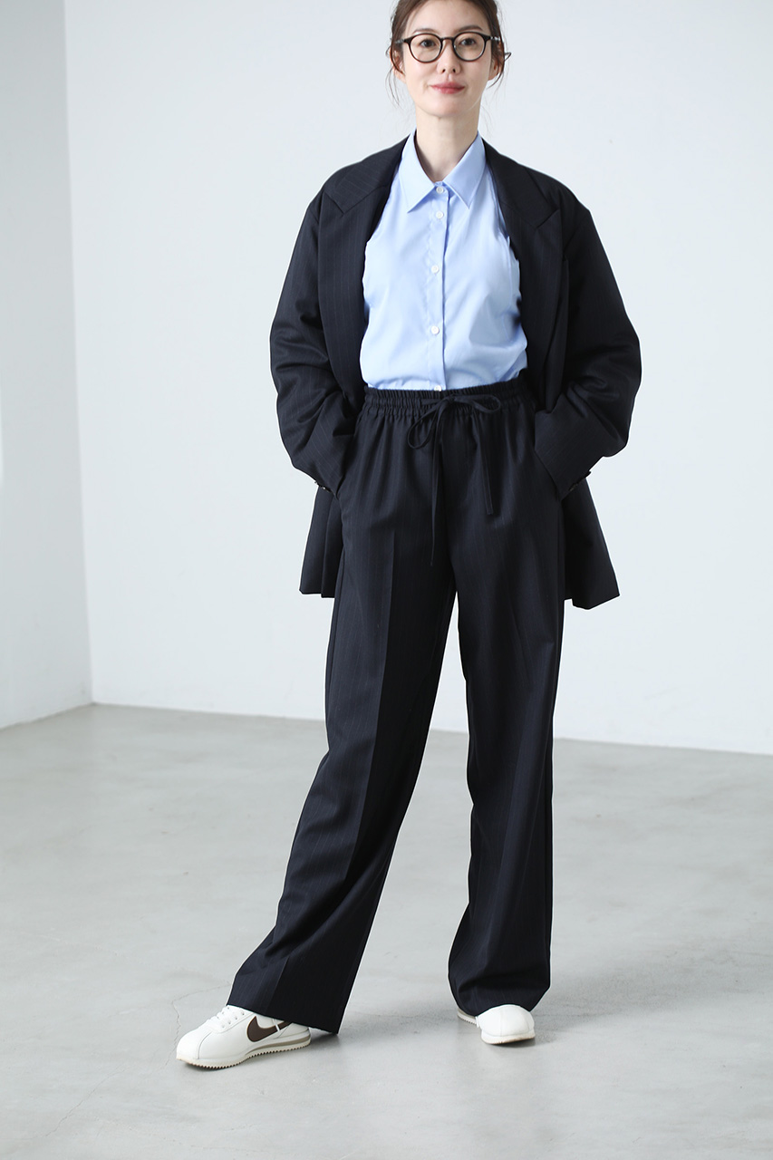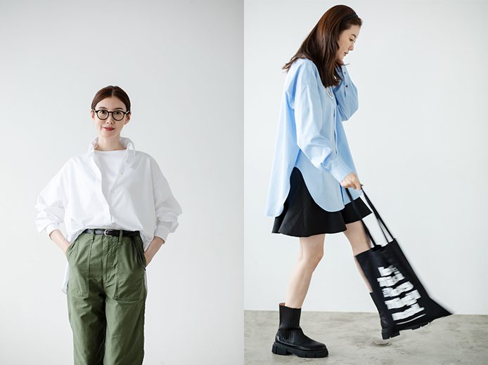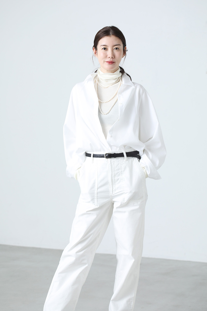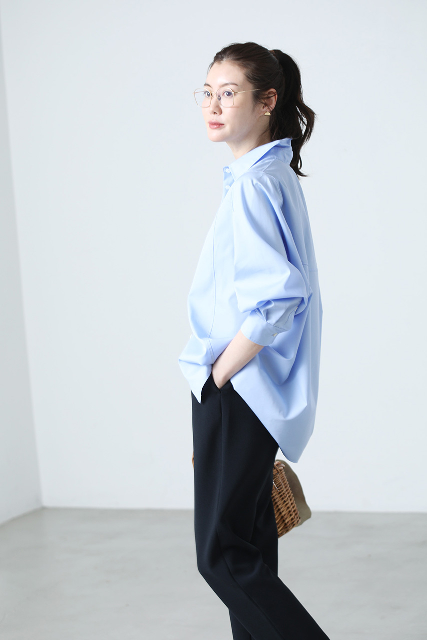 シンプルながらも細部のディティールにこだわり、袖山に入れたダーツや背中のヨーク切り替えを利用してやや丸みを帯びた立体感のあるシルエットに仕立てることで、メンズライクなオーバーサイズのシャツに女性らしい雰囲気を微かに纏わせています。また、脇に深めのカーブラインを入れることで抜け感のある印象に。1枚でさらっと着たり、パンツやスカートにインしたりとアレンジしていろいろな着こなしができ、コーディネイトの幅を広げてくれるアイテムです。