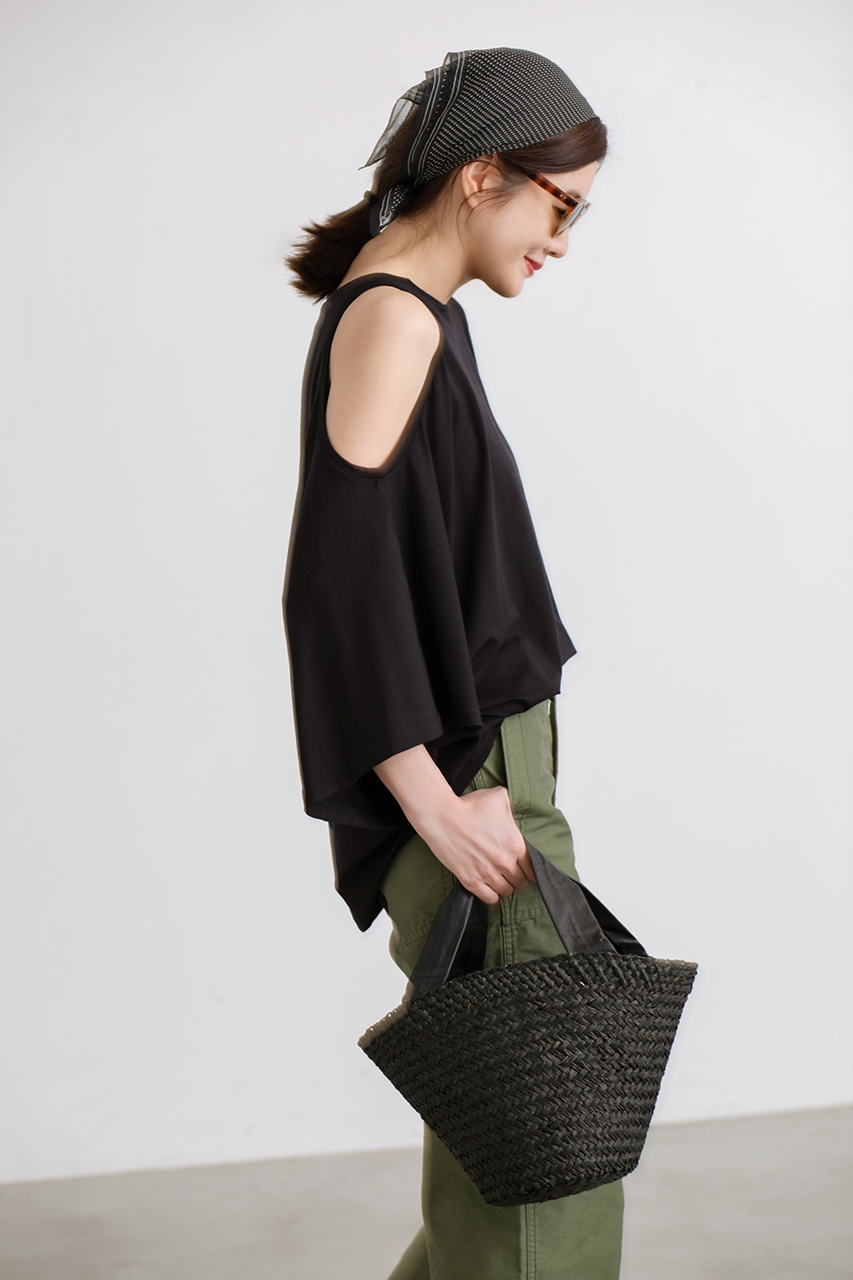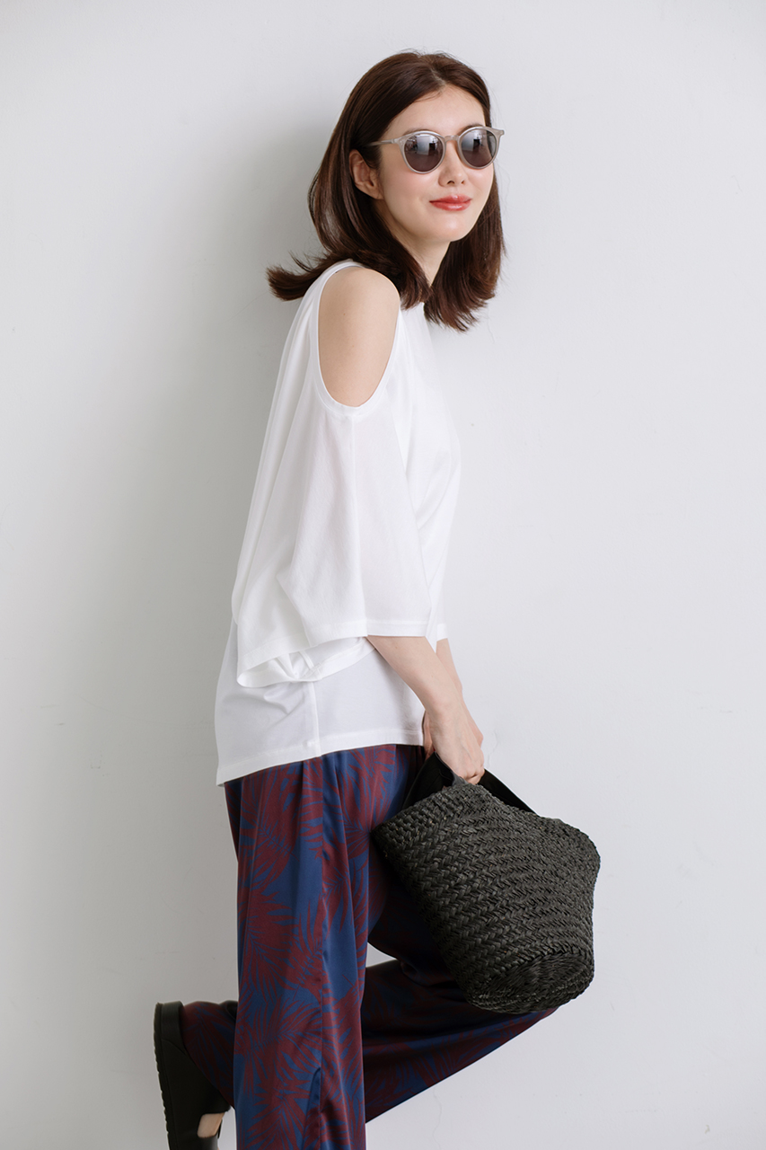 長時間の着用でも型崩れせず、きめ細やかな風合いと軽量感、優れた伸縮性が心地よく体にフィットし、大人の女性の夏スタイルを品よく引き立てる一枚です。