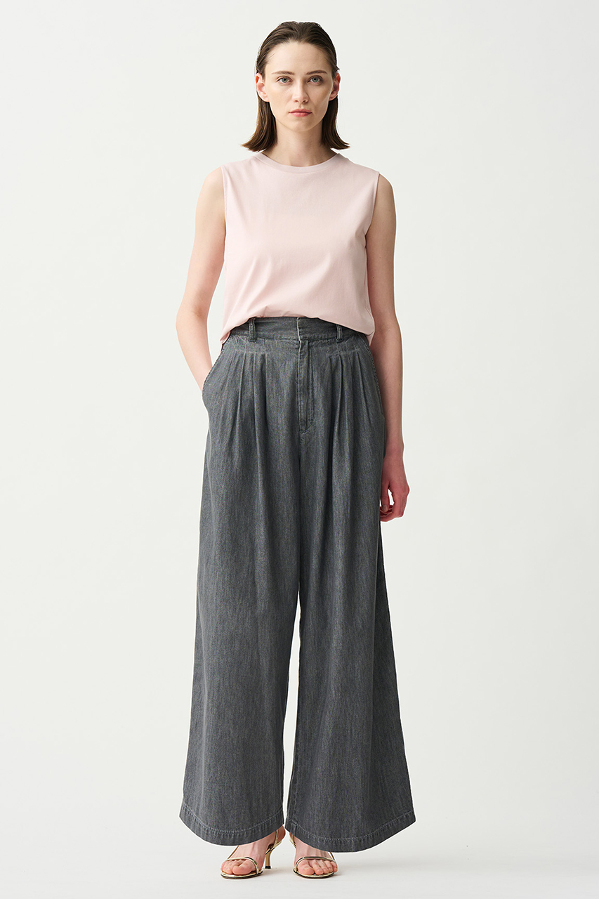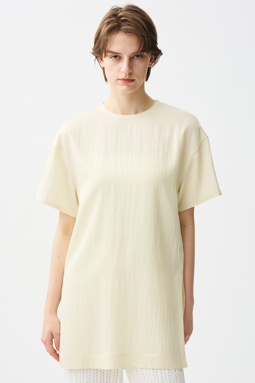 タテ糸にヴィスコースフィラメント糸を使用することで光沢感としなやかな落ち感を表現し、ヨコ糸にポリエステルウールの混紡糸とナイロン糸を使用することでドライ感と独特なハリ感を出しています。ナチュラルなタテジワ感が程よく抜け感を出し、上品な光沢素材です。