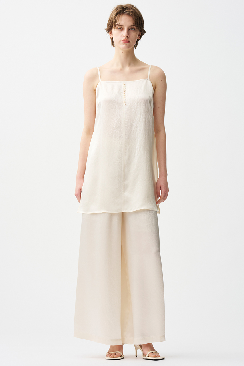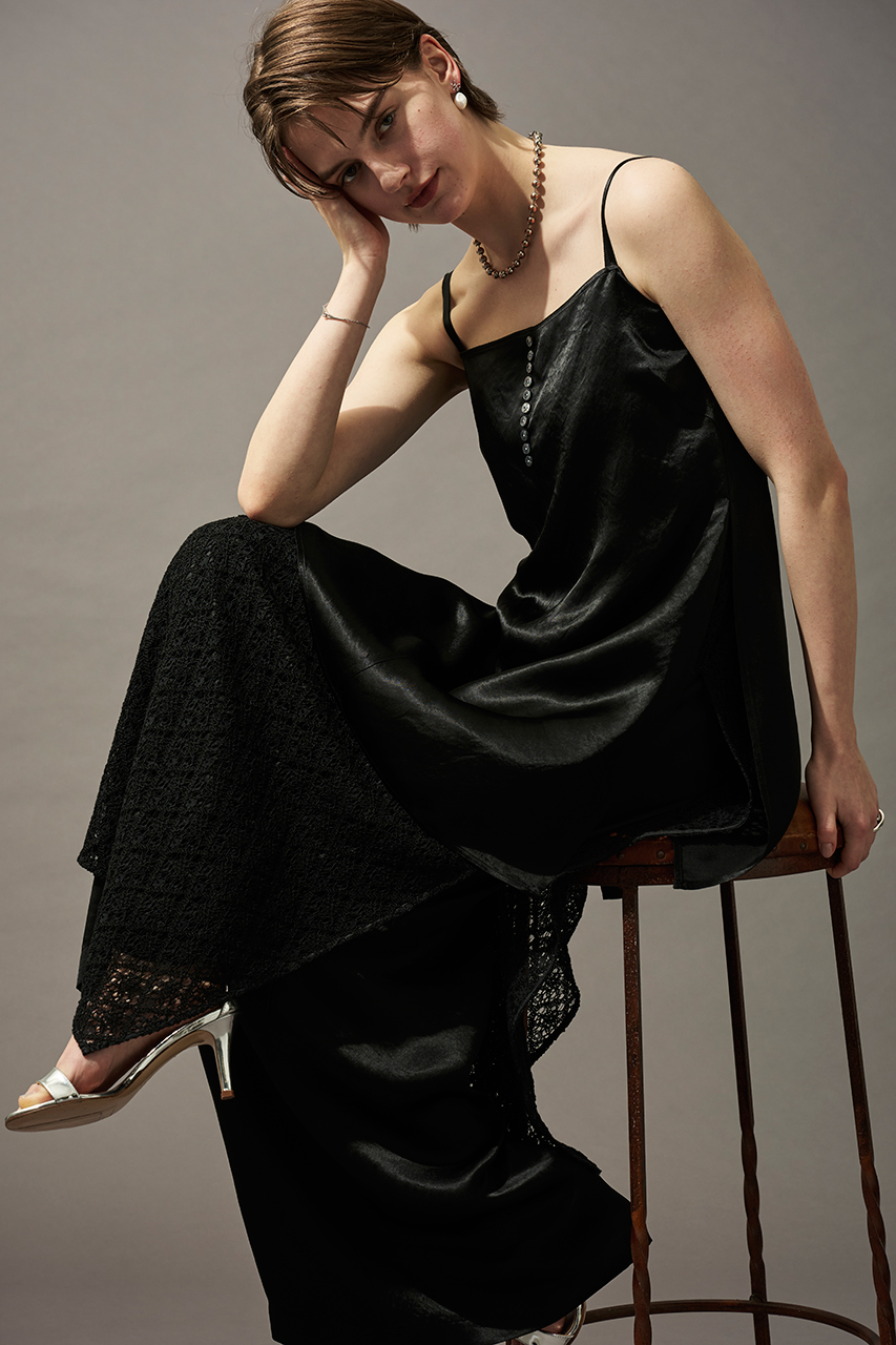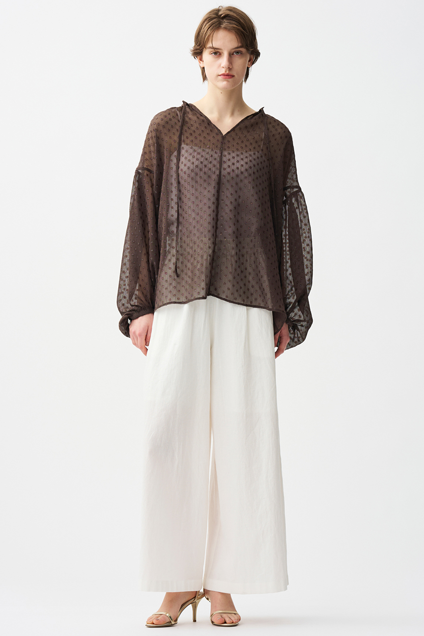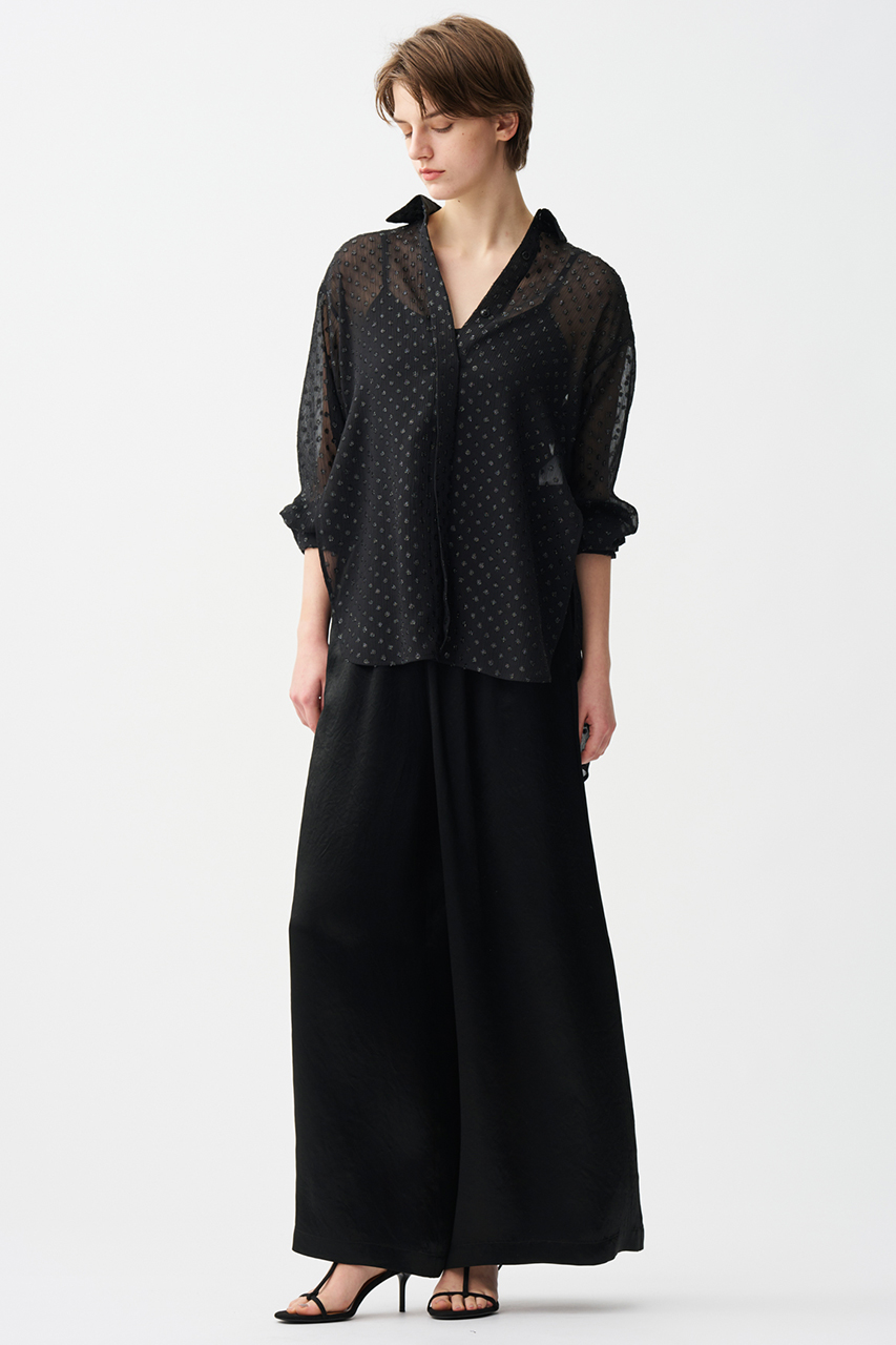 フィルム糸を使用することで程よい光沢感があり、同色のドット柄が華やかな印象に。ベース素材にはシアー感があり、軽やかでシャリみのある素材です。