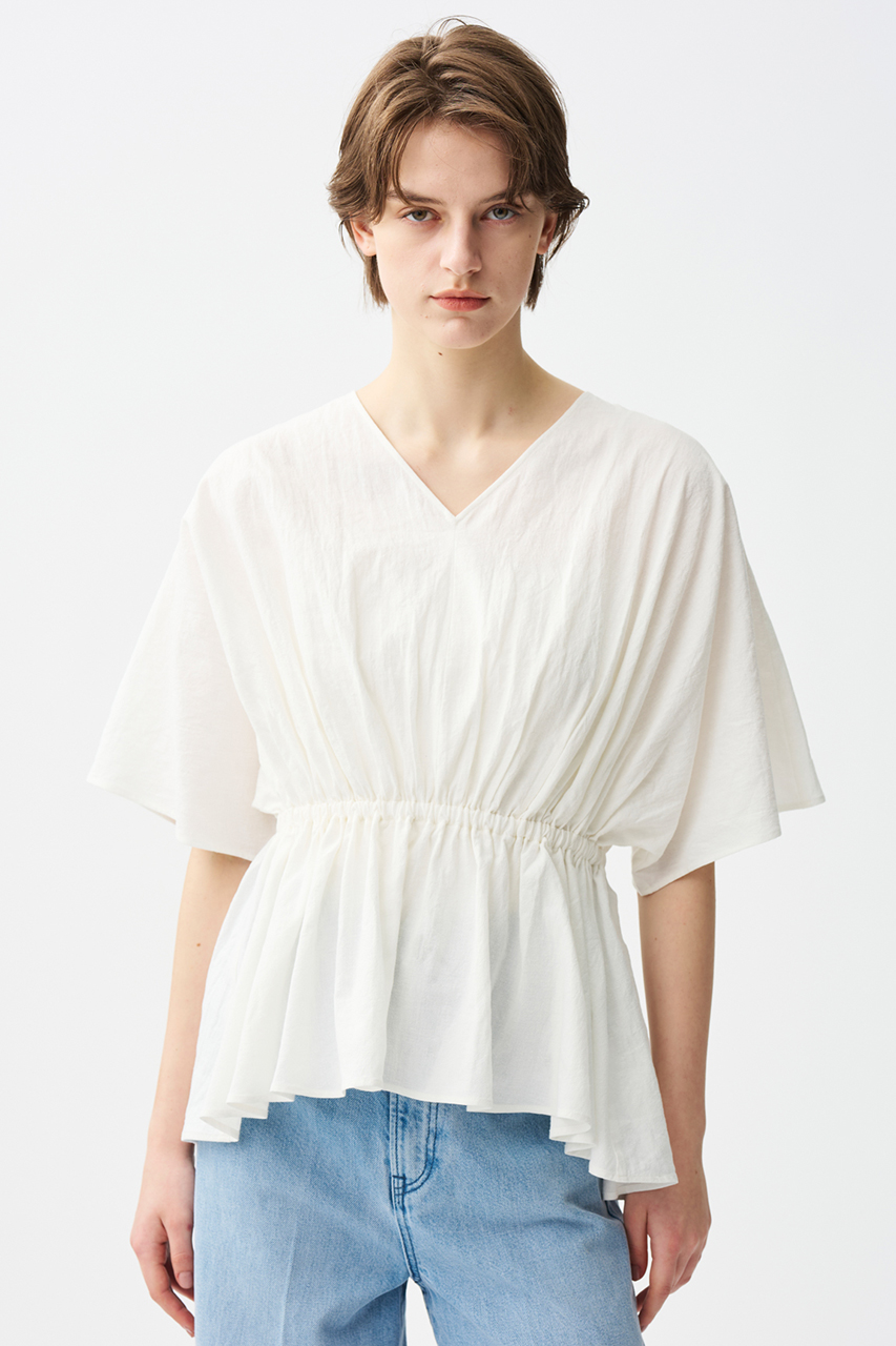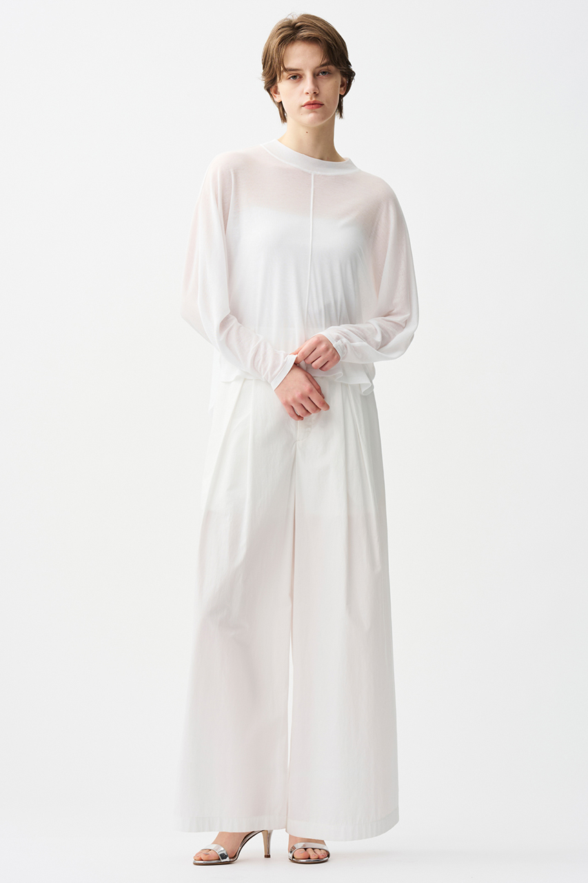 シルケットバイオ加工を入れることで、まるでブラウスのように滑らかできれいな表面感と清涼感をプラスしています。適度な肉感とハリがあり、体のラインを拾いにくく仕立て映えのする素材感です。