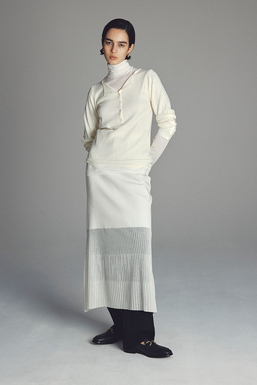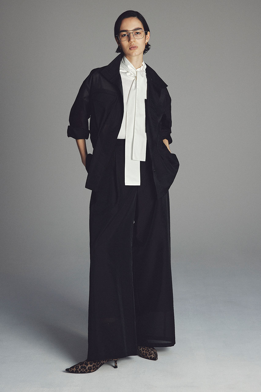 程よいハリ感の為、ボリューミーな物は構築的に、シンプルな物は体から離れる空気感を保つことができ、汎用性の高い素材。