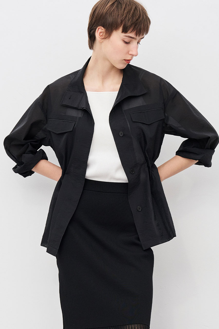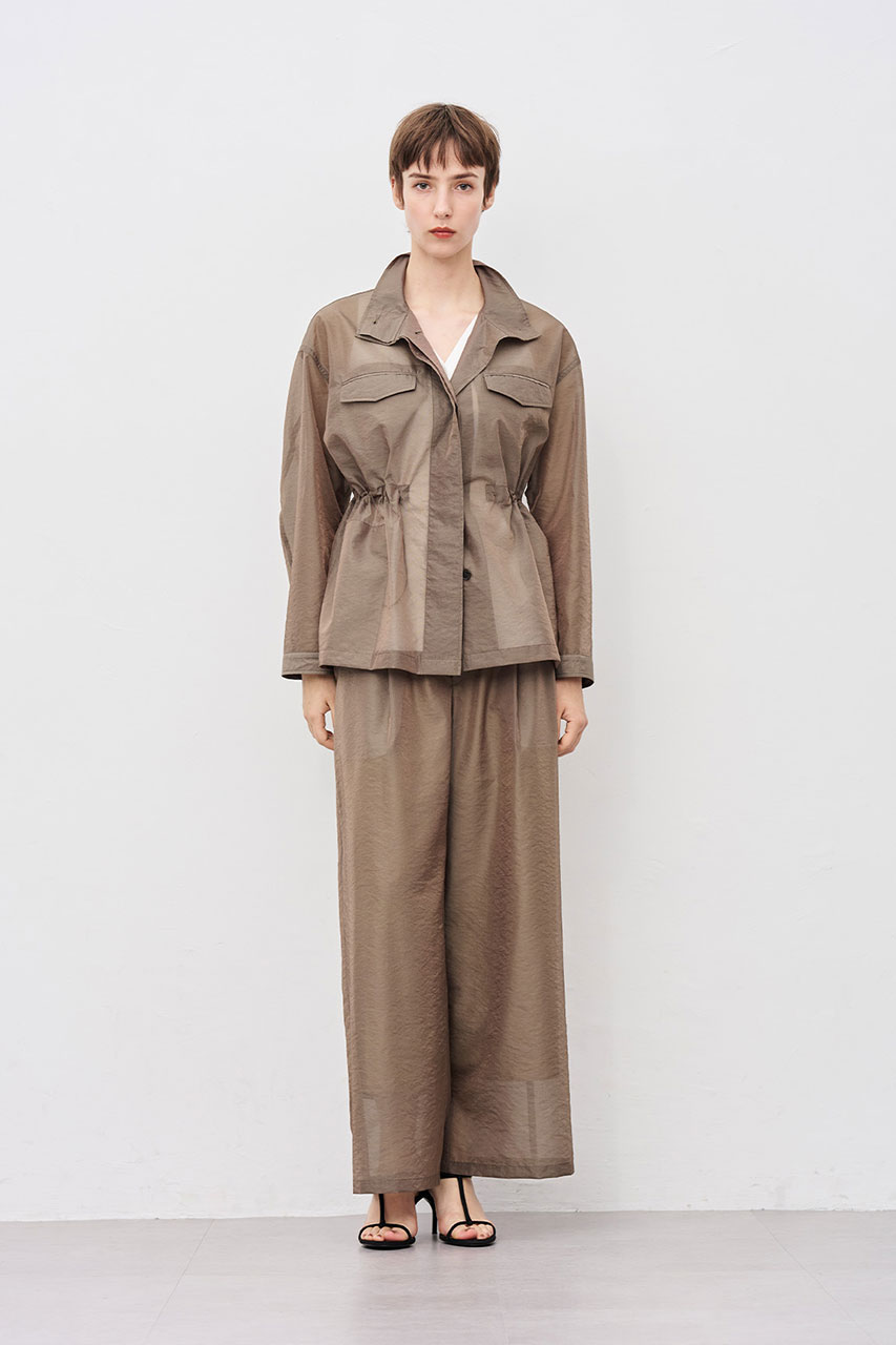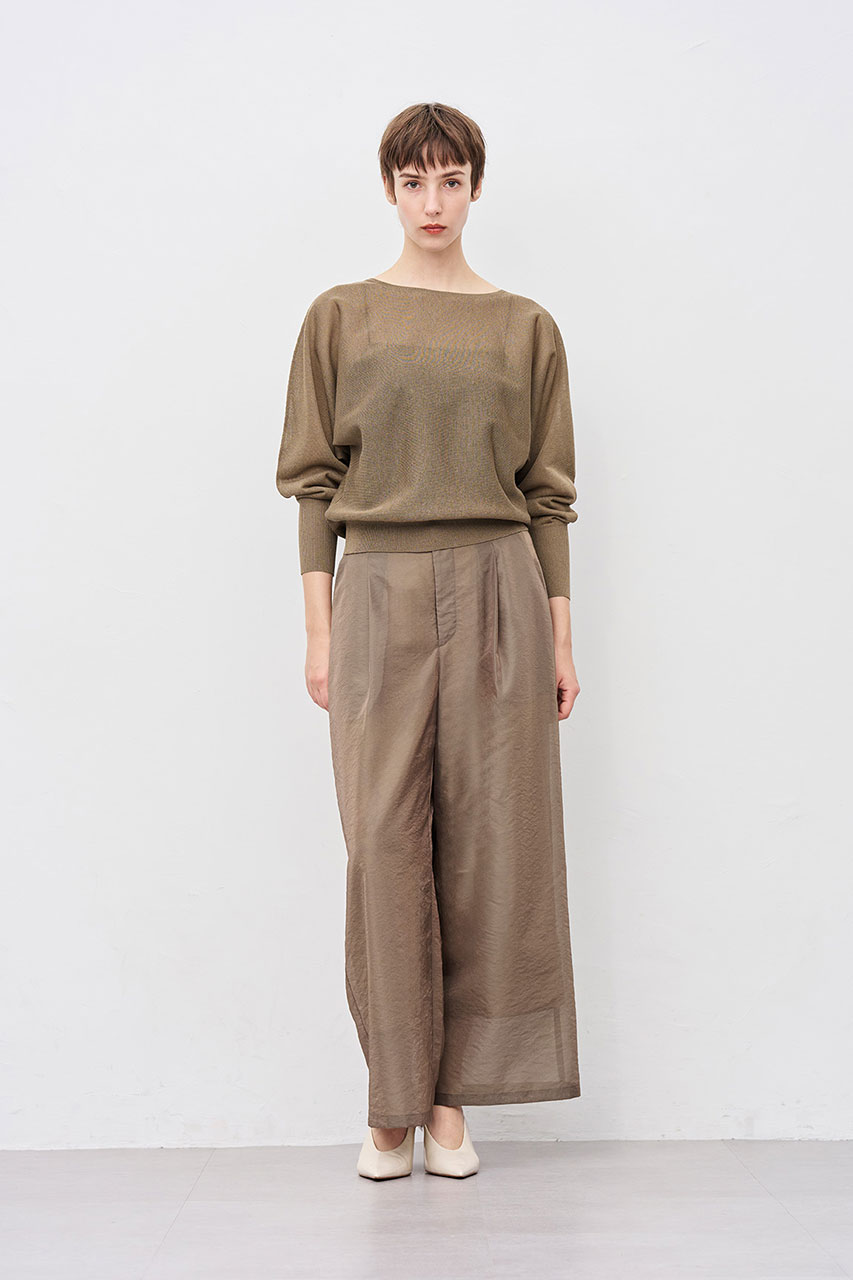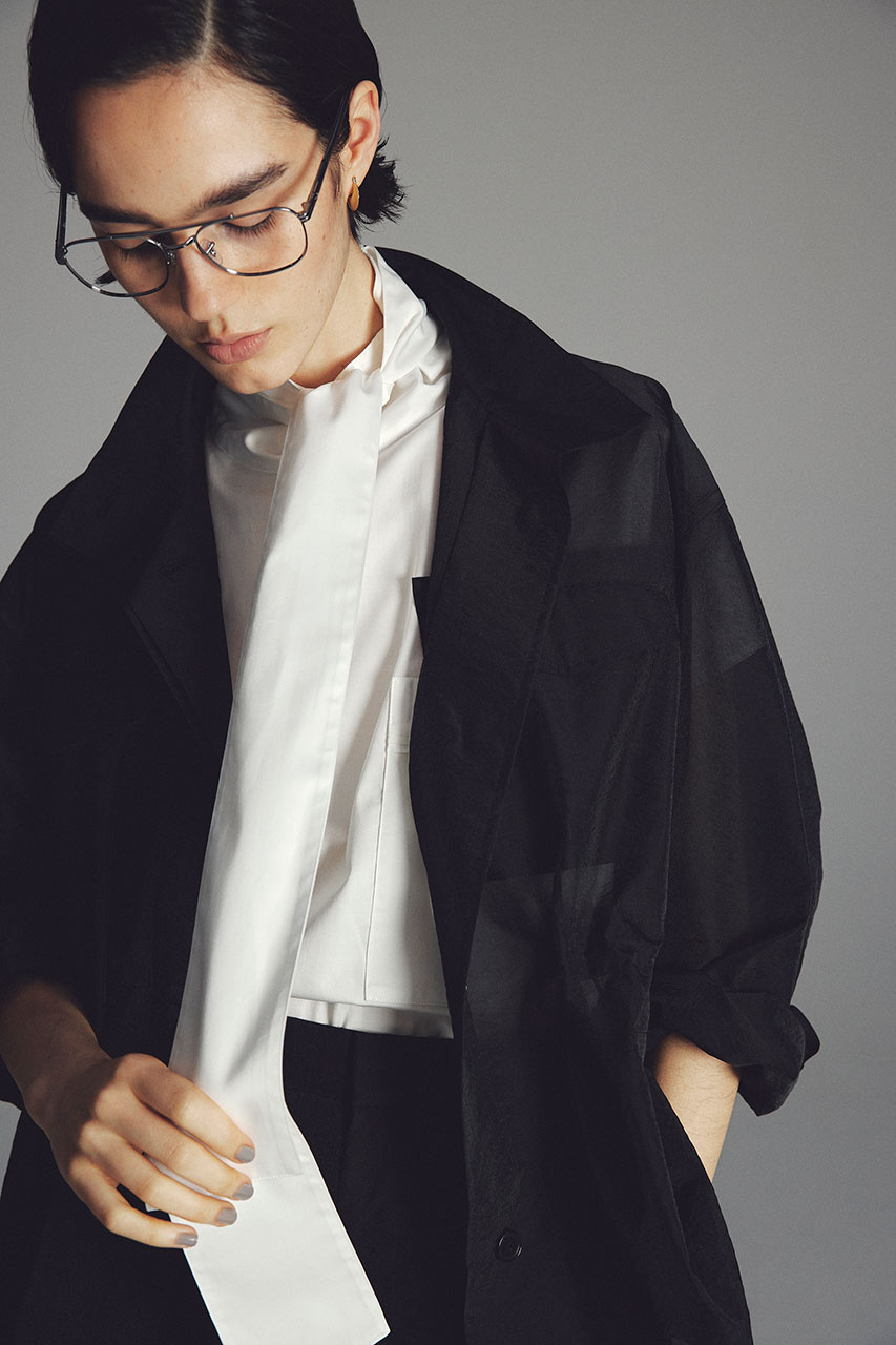 ブライトタイプの分繊ナイロン糸をタテ糸に使用したオーガーンジー素材。ナチュラルなシワ感と微光沢、エアリーなハリ感が特徴。柔らかな透け感で上品なシアー素材。