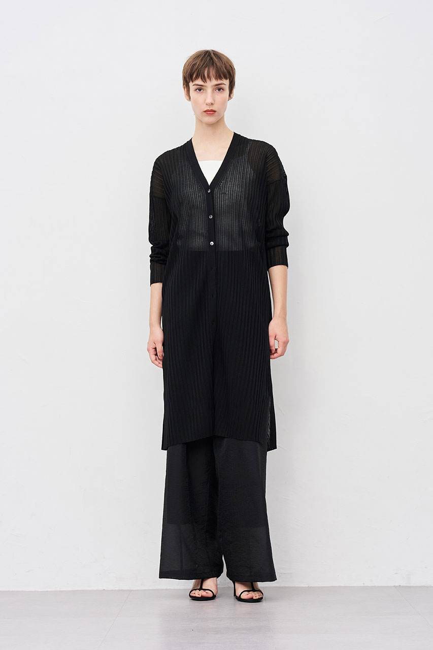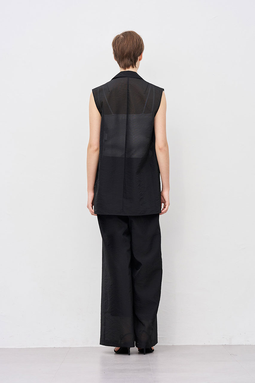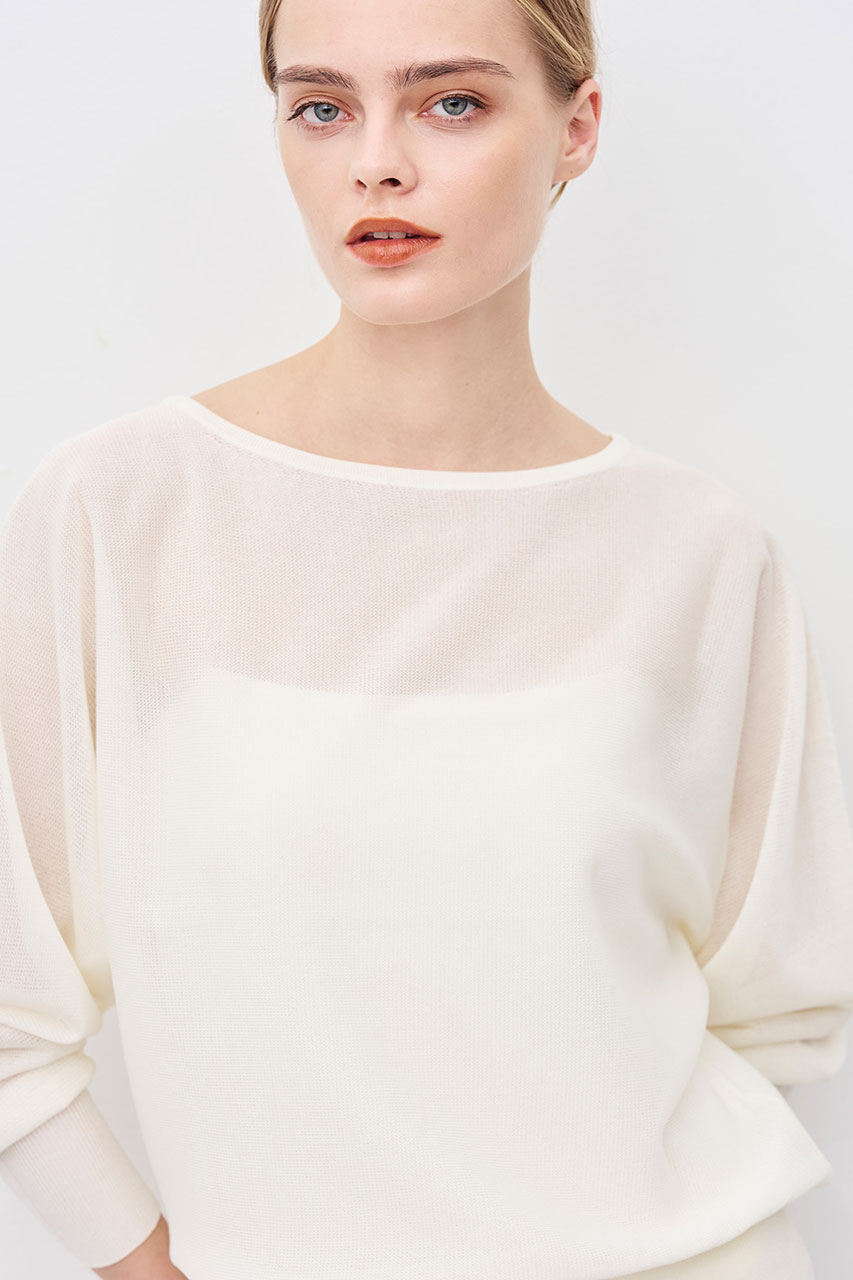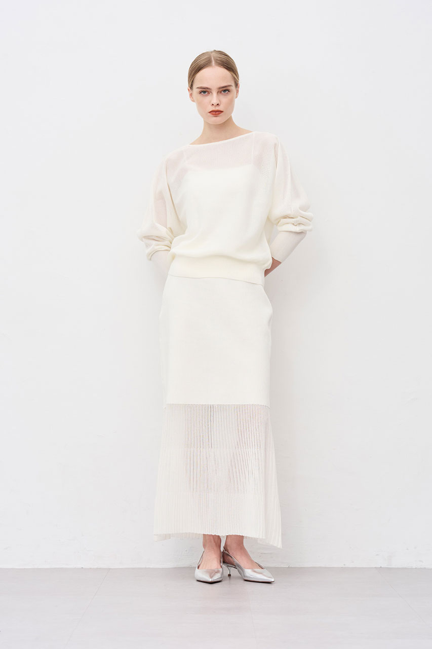 ブライトタイプの分繊ナイロン糸をタテ糸に使用したオーガーンジー素材。ナチュラルなシワ感と微光沢、エアリーなハリ感が特徴。柔らかな透け感で上品なシアー素材。