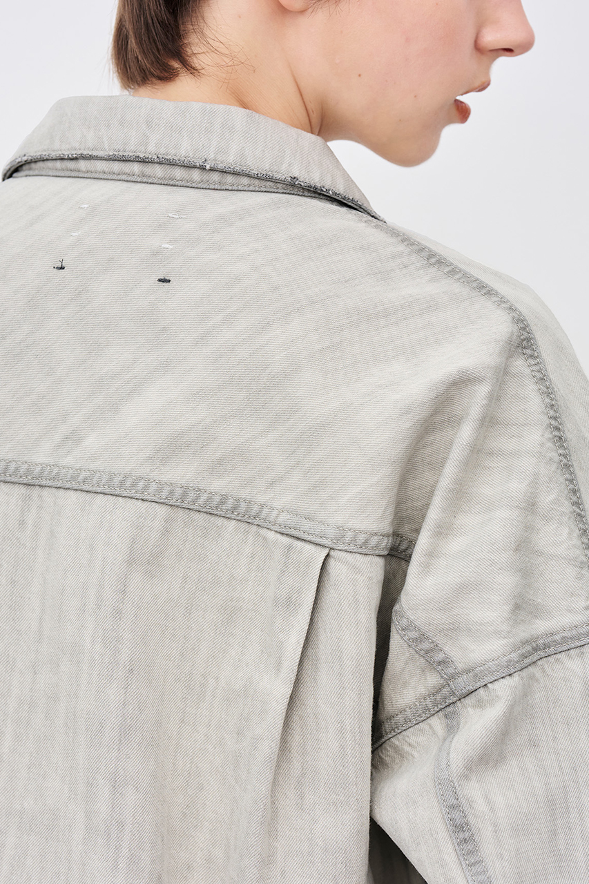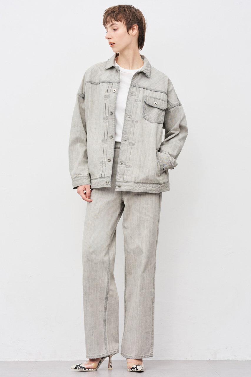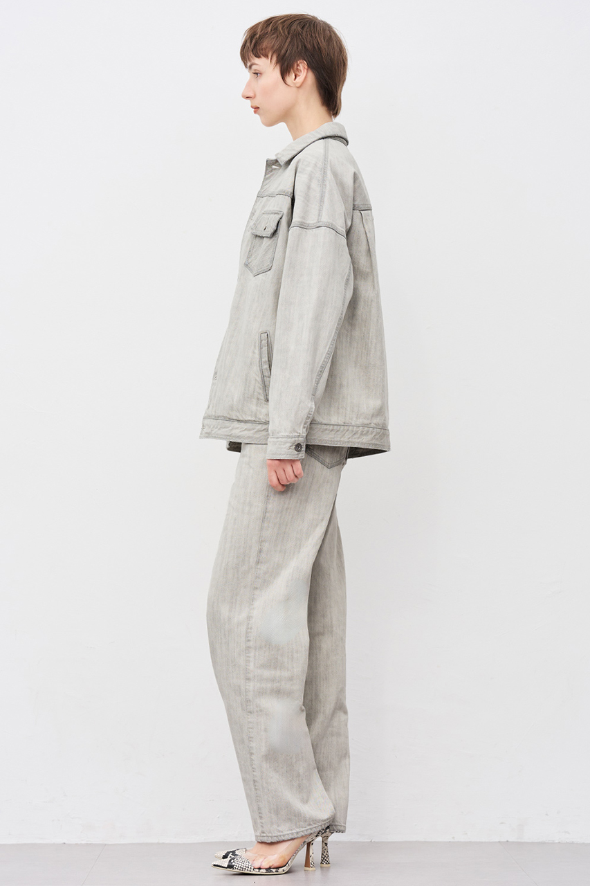 ブラックの生地を最大限ライトカラーに加工しております。ホワイトとグレーの間のニュアンスカラーが特徴で、デニムならではのパッカリングが全体の立体感を演出します。