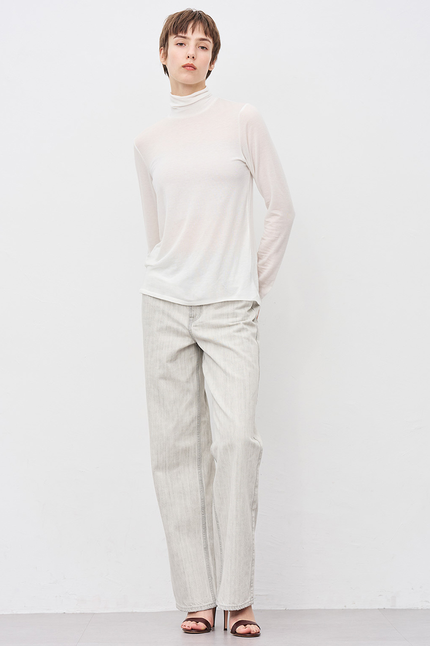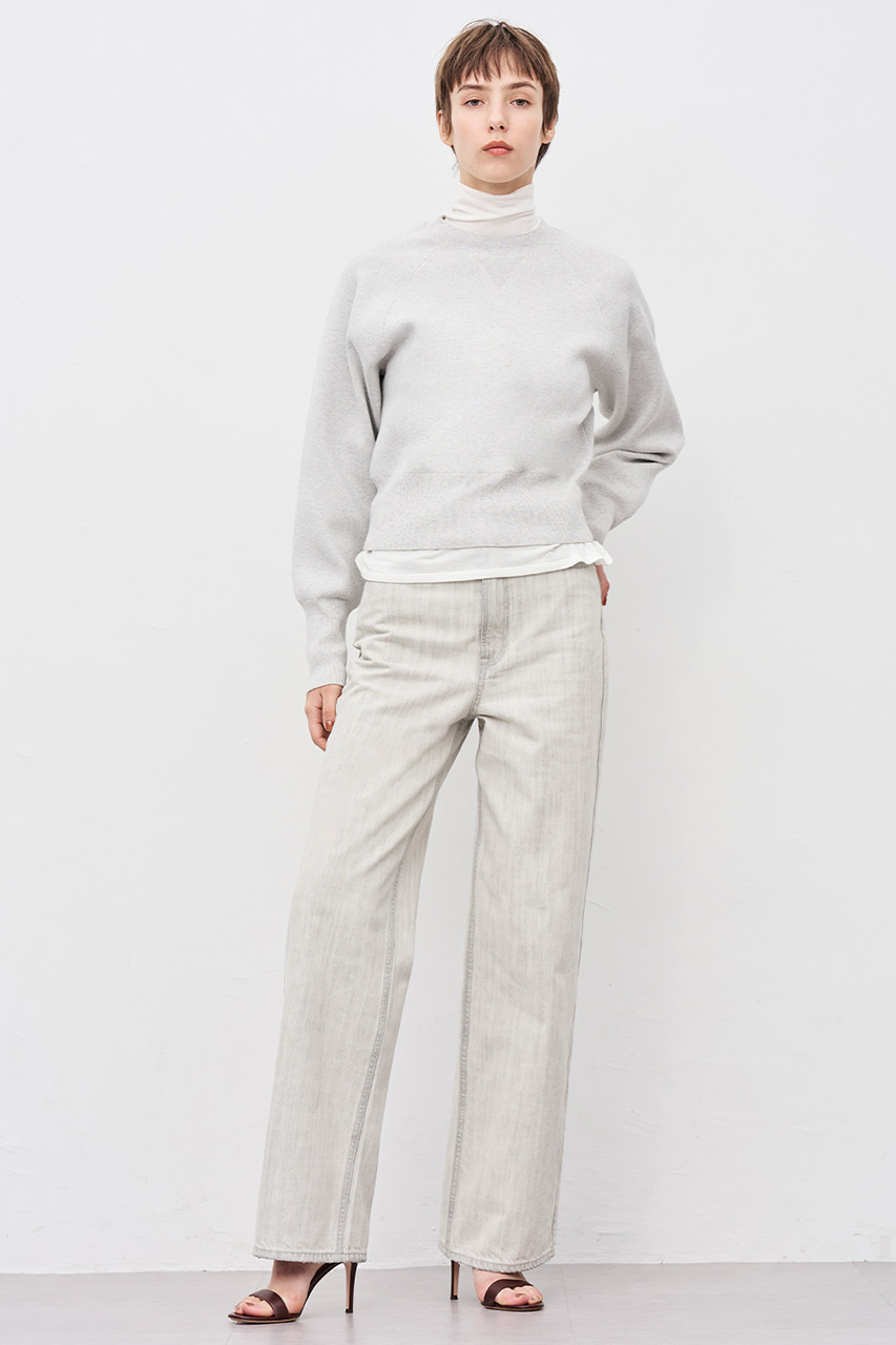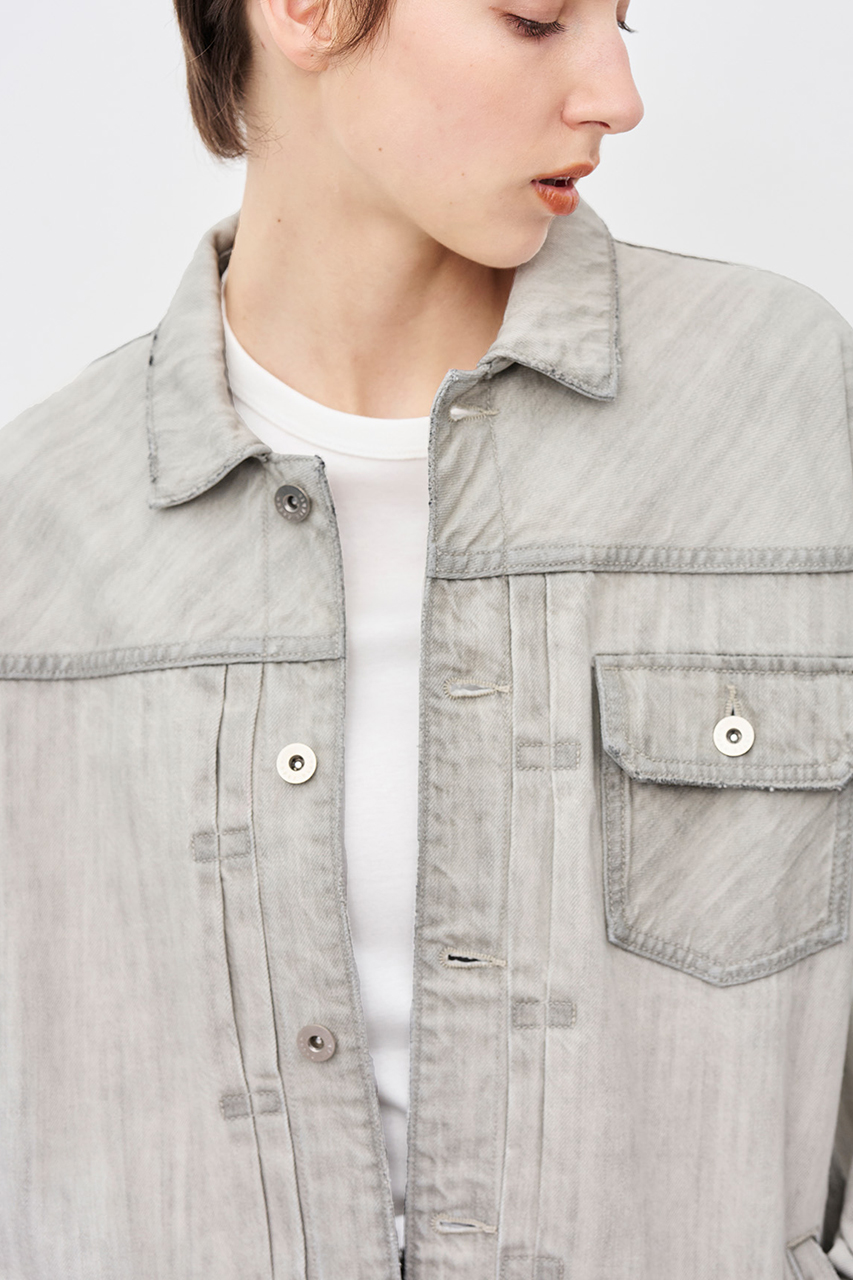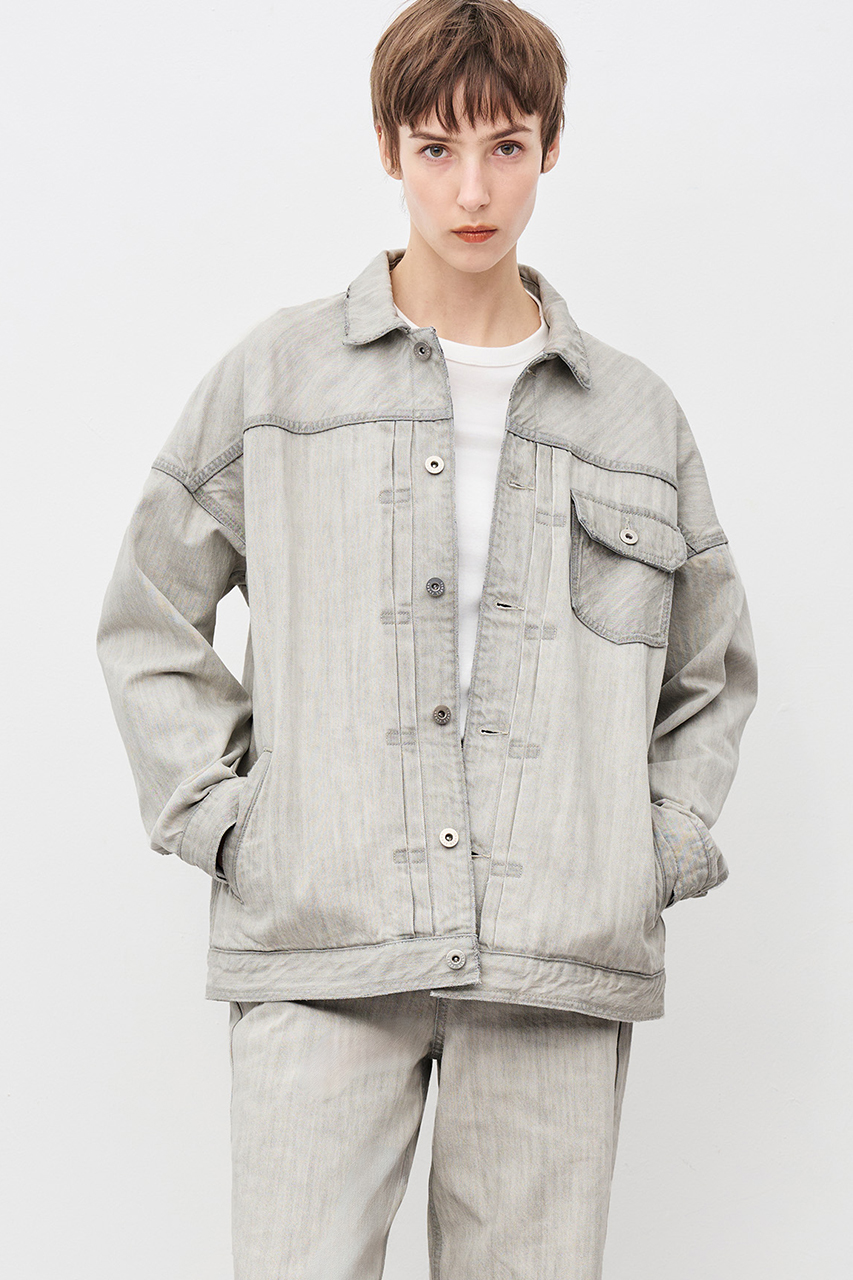 ブラックの生地を最大限ライトカラーに加工しております。ホワイトとグレーの間のニュアンスカラーが特徴で、デニムならではのパッカリングが全体の立体感を演出します。
