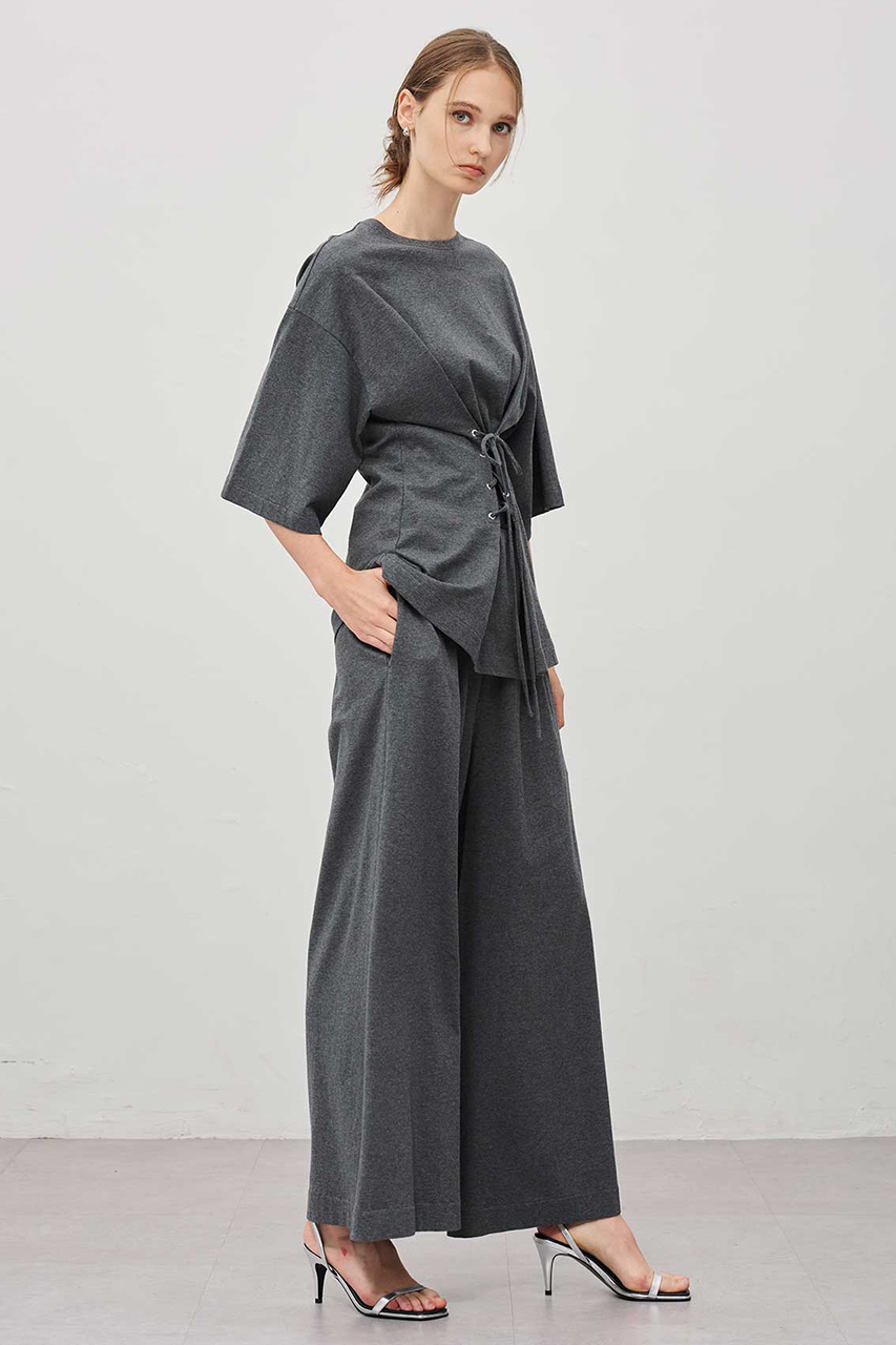 強撚糸をテレコ組織で編み上げた高ストレッチ素材です。畝の立体感がありフィットしたアイテムでも程よく身体になじみます。