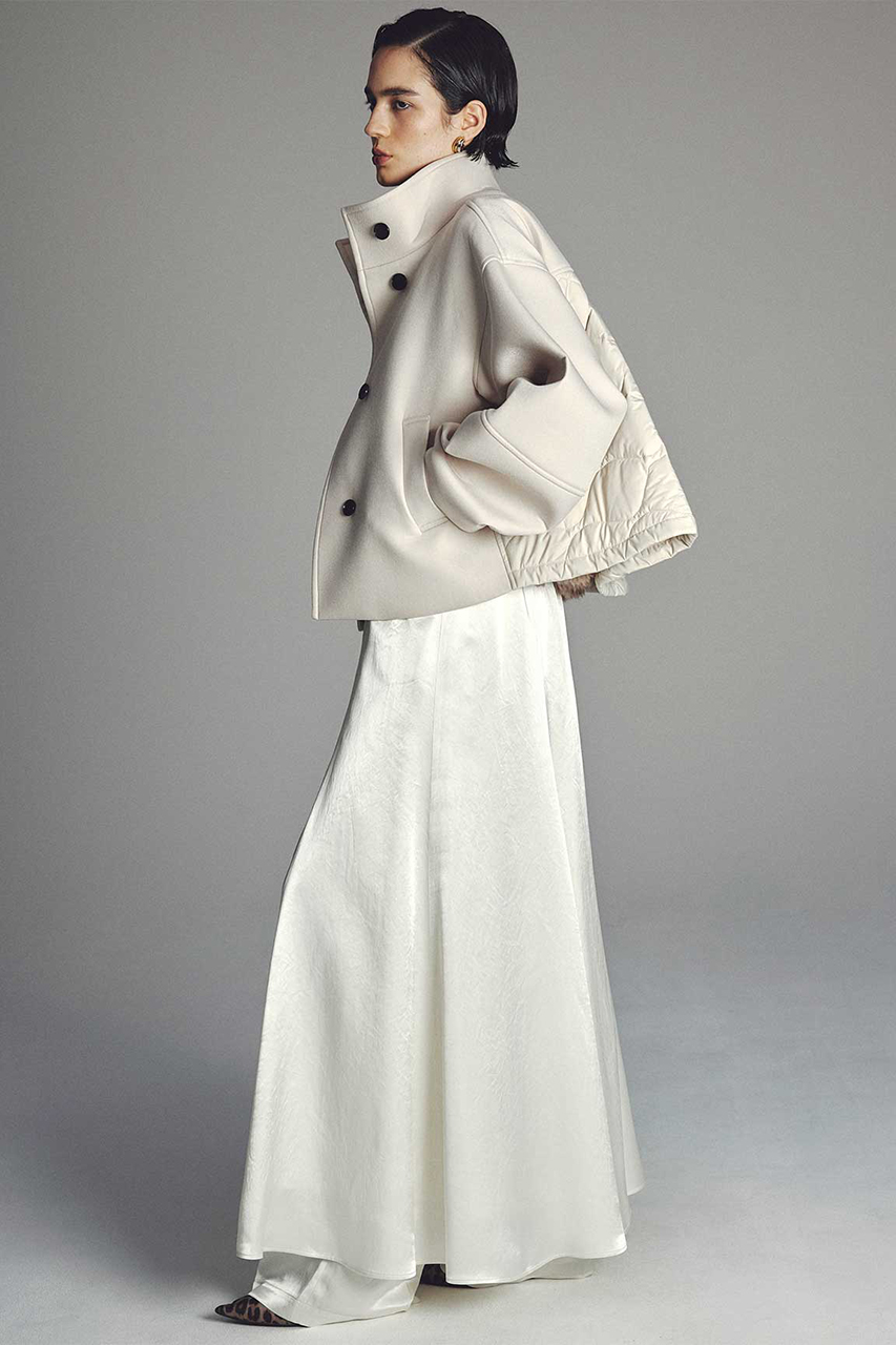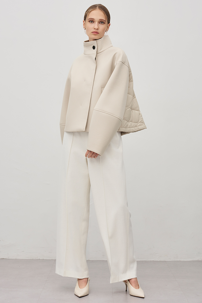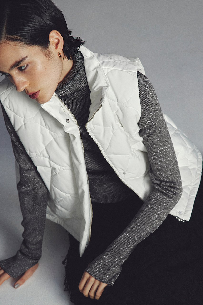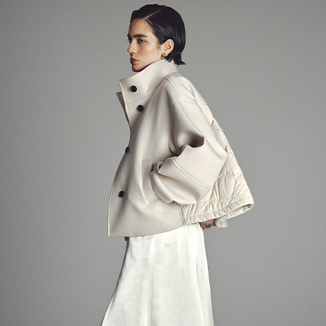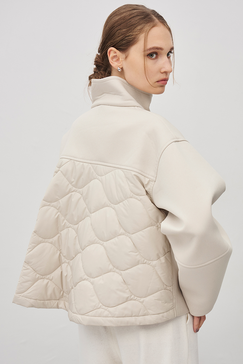 存在感が出る様に160gの中綿を入れ、ハリ感のある素材でもしっかりと膨らみを出しています。タテの波柄が多い中、あえてヨコの柄行きにしています。