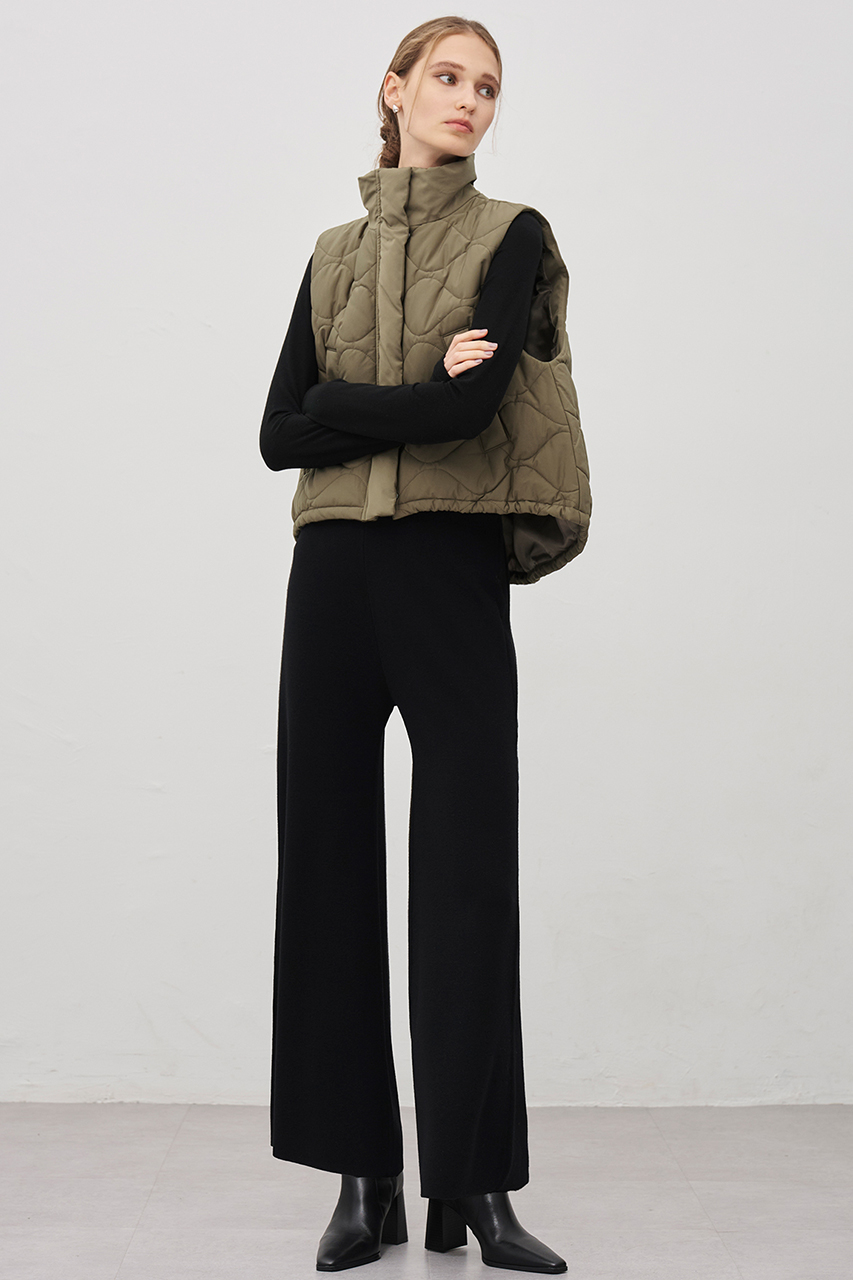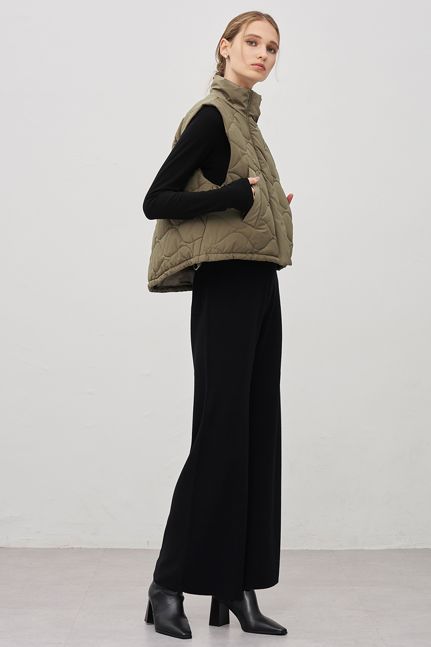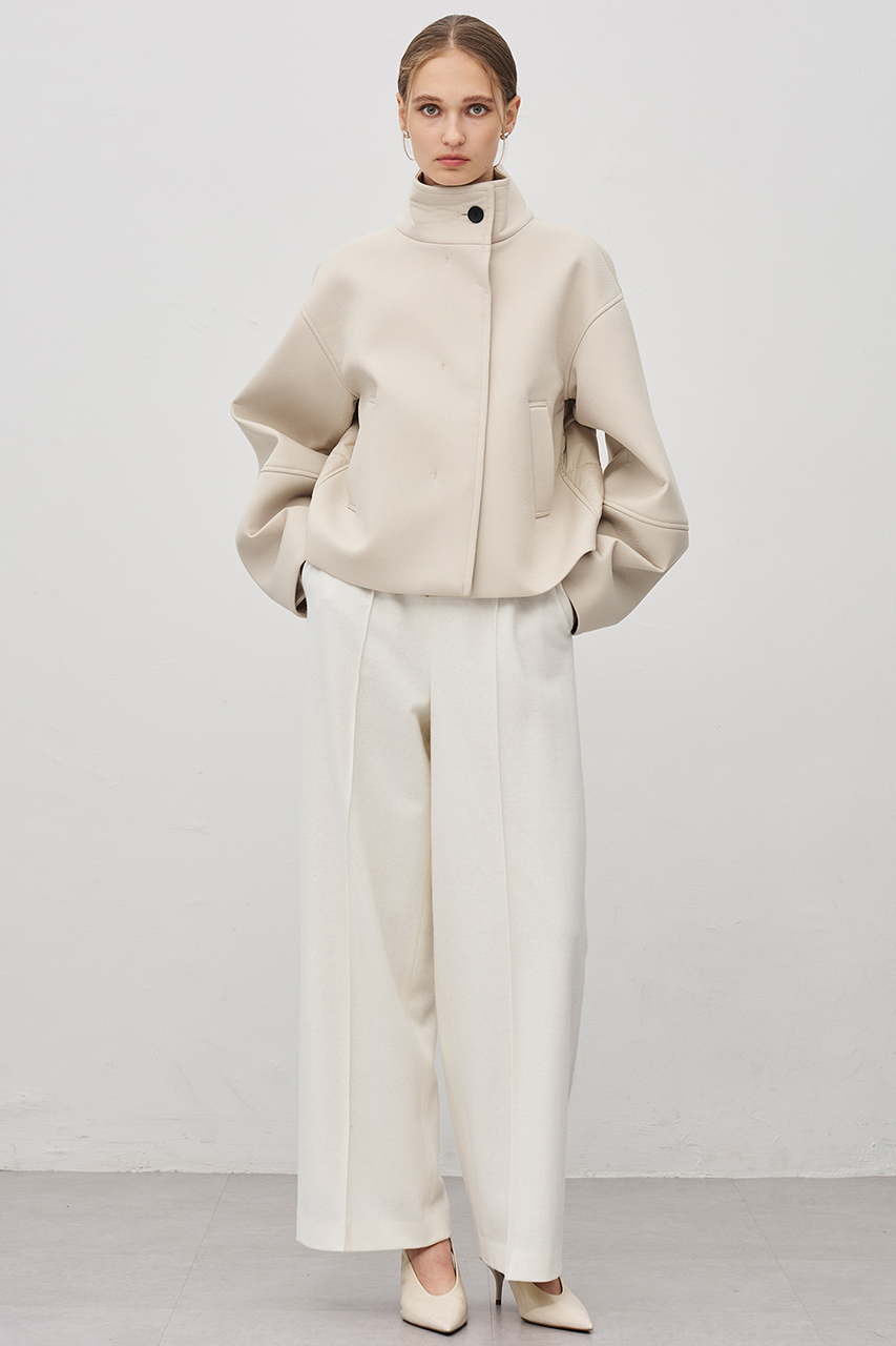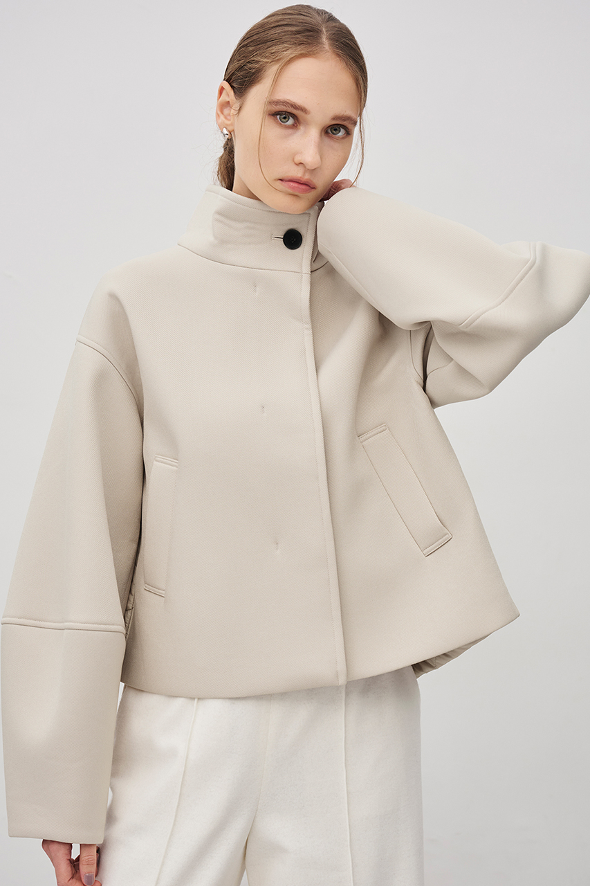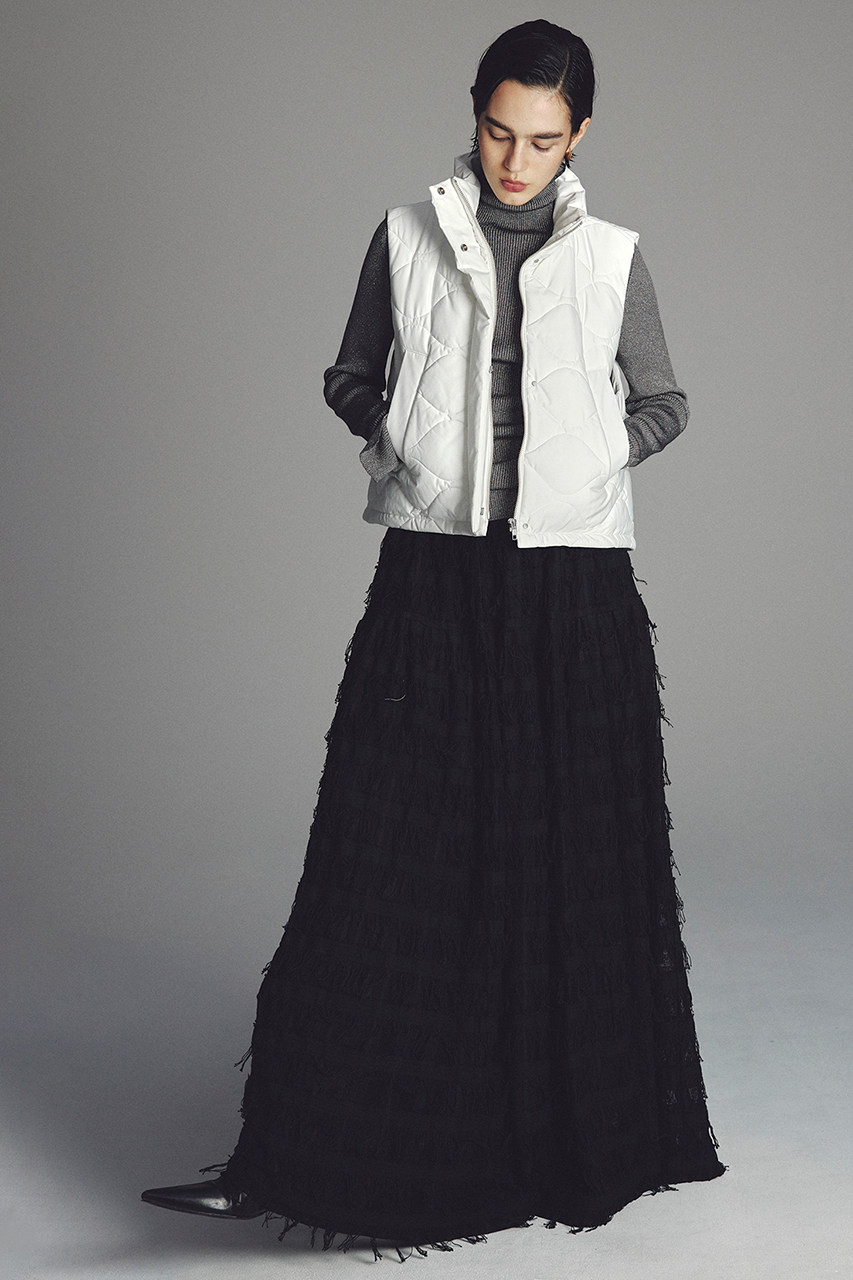 存在感が出る様に160gの中綿を入れ、ハリ感のある素材でもしっかりと膨らみを出しています。タテの波柄が多い中、あえてヨコの柄行きにしています。
