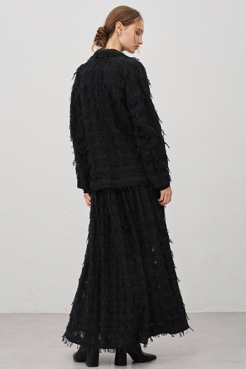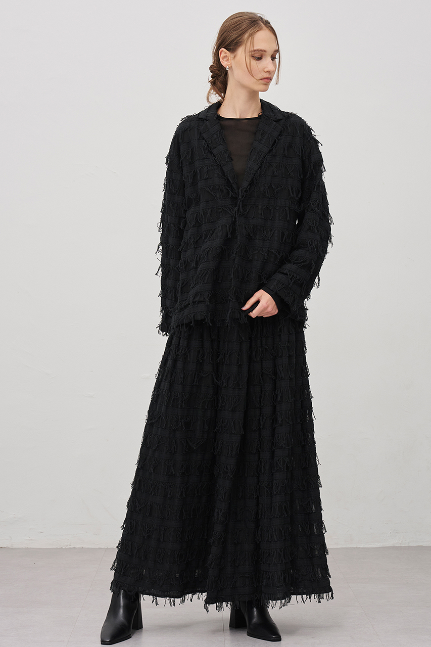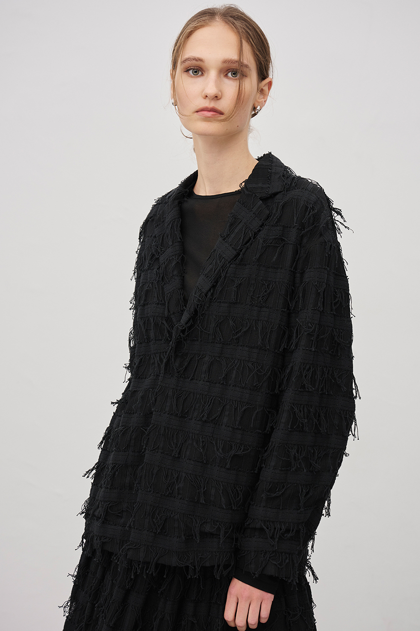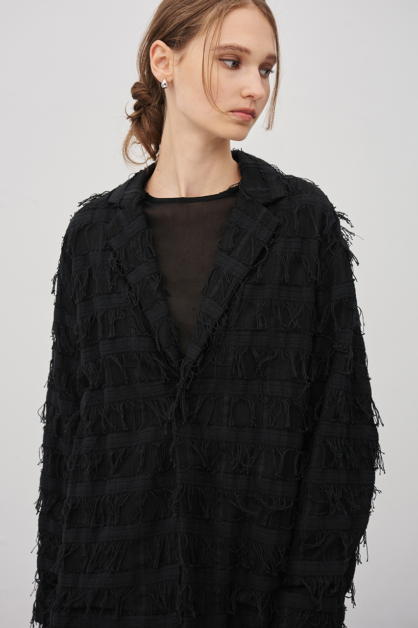 ブロックチェックの様な幾何学柄にフリンジのアクセントが素材の存在感を高めています。メッシュ部分との格子の為、程よい透け感が全体の抜け感を表現している素材です。