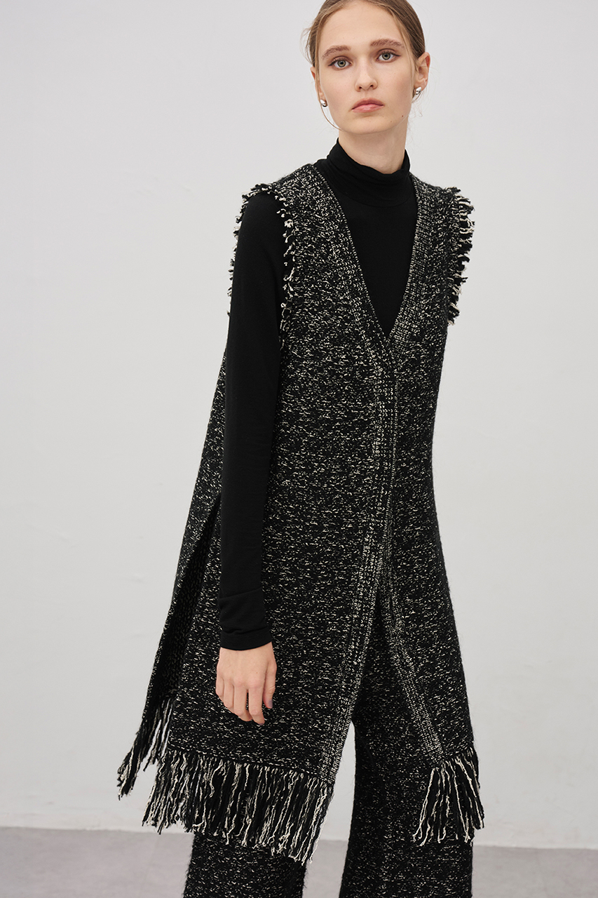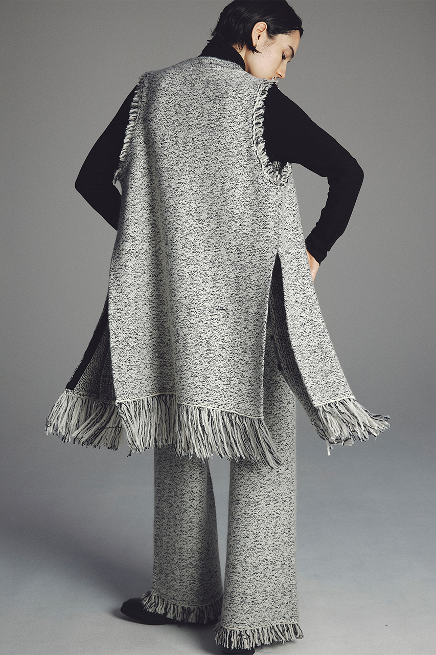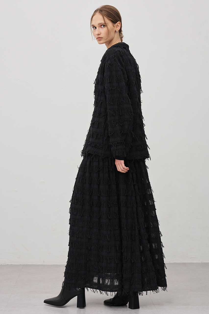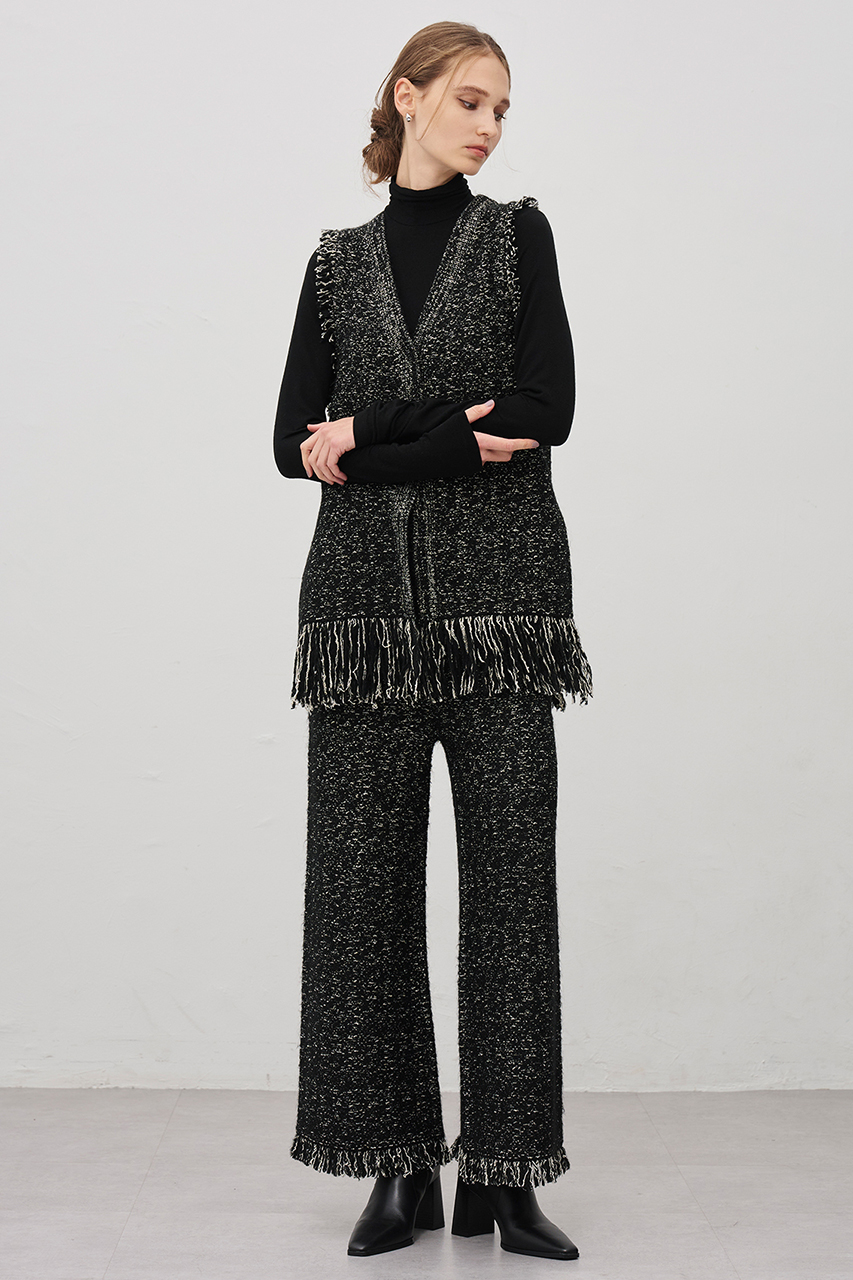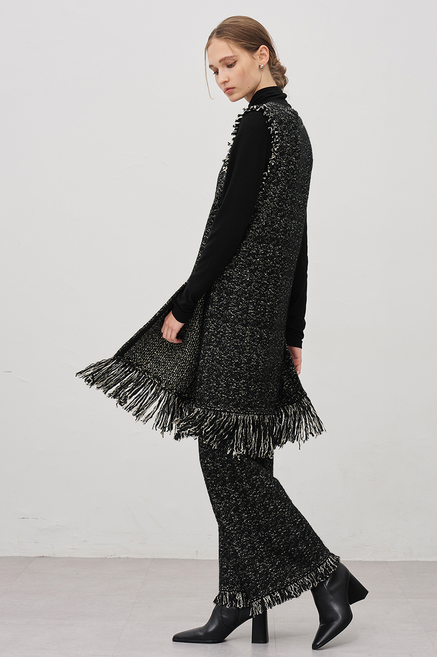 ブロックチェックの様な幾何学柄にフリンジのアクセントが素材の存在感を高めています。メッシュ部分との格子の為、程よい透け感が全体の抜け感を表現している素材です。