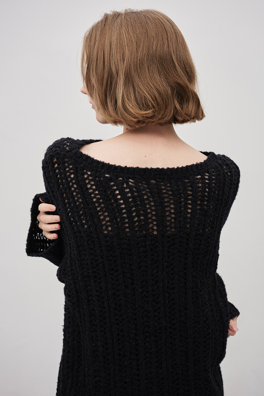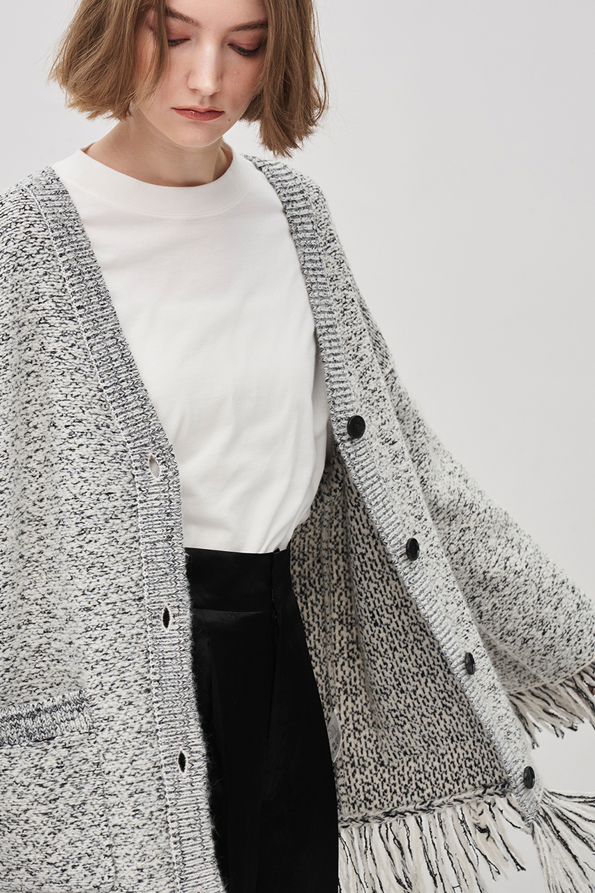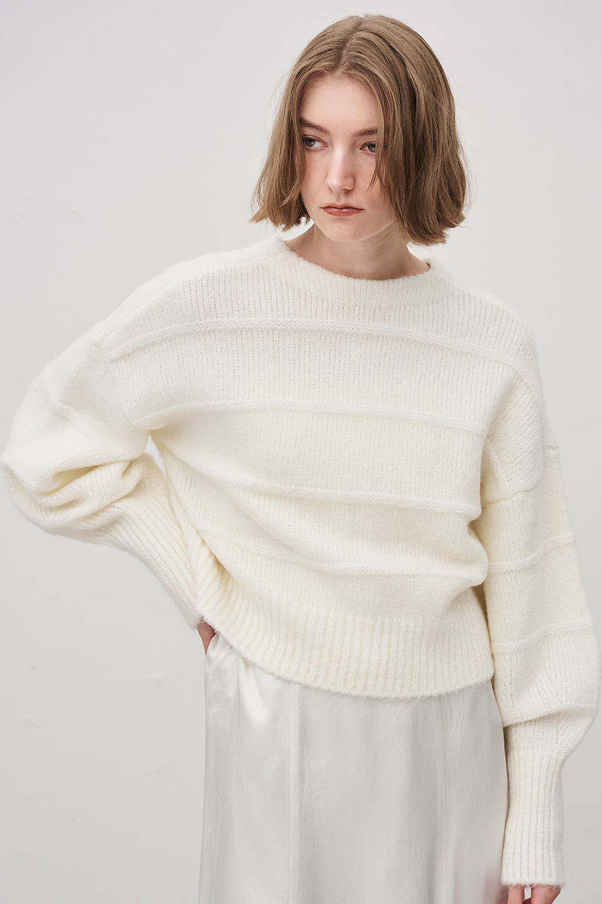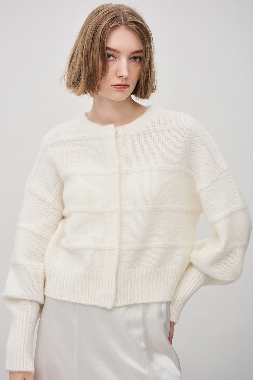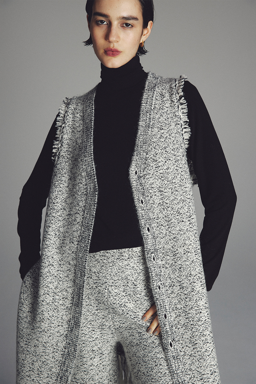ツィード調の独特な編み柄とほど良いモヘアのへアリー感があり、温かみのある表情を出しています。