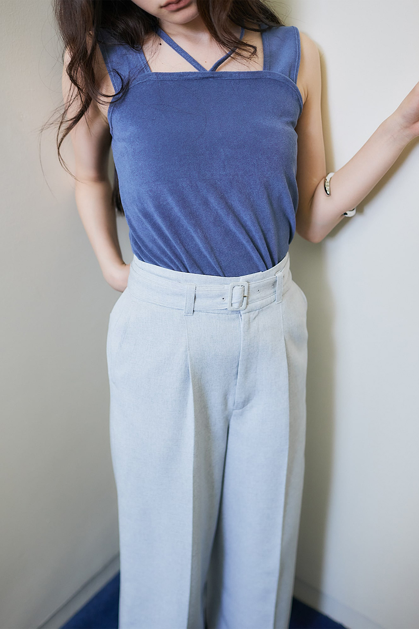 スクエアネックがデコルテを美しくみせる、パイル素材のタンクトップ。取り外し可能なリボンと前後2way仕様で、着こなしの幅が広がります。さらりとした肌触りと軽やかな着心地が、夏のデイリースタイルを心地よく彩ります。