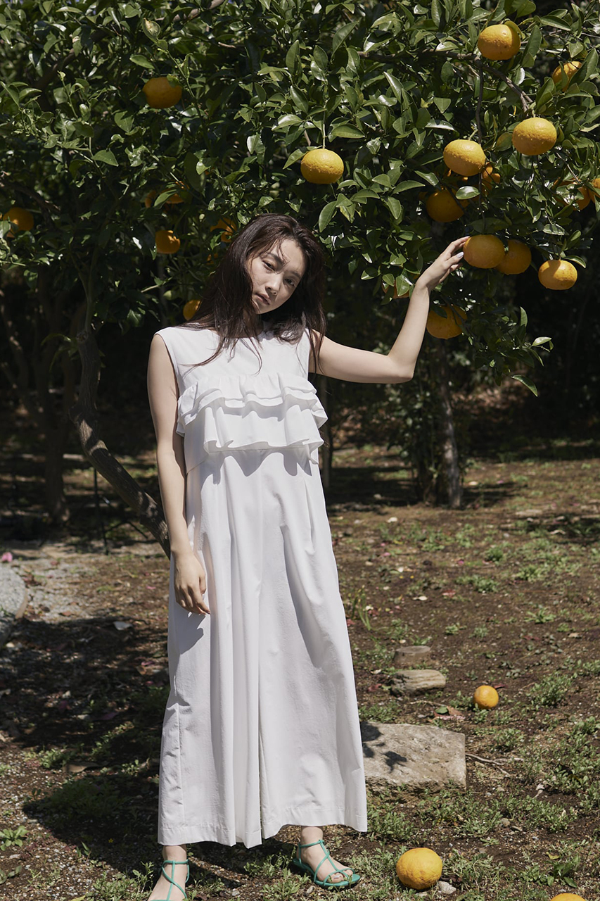 フェミニンに揺れるラッフルが印象的な、オールインワン。高めに配したラッフルがウエストラインを引き上げ、スタイルアップも叶います。裏地付きのストレッチ素材で透けにくく、快適な着心地を実現。ポケット付きで実用性も高く、吸水速乾・イージーケア仕様で、リゾートからデイリーまで活躍する一着です。